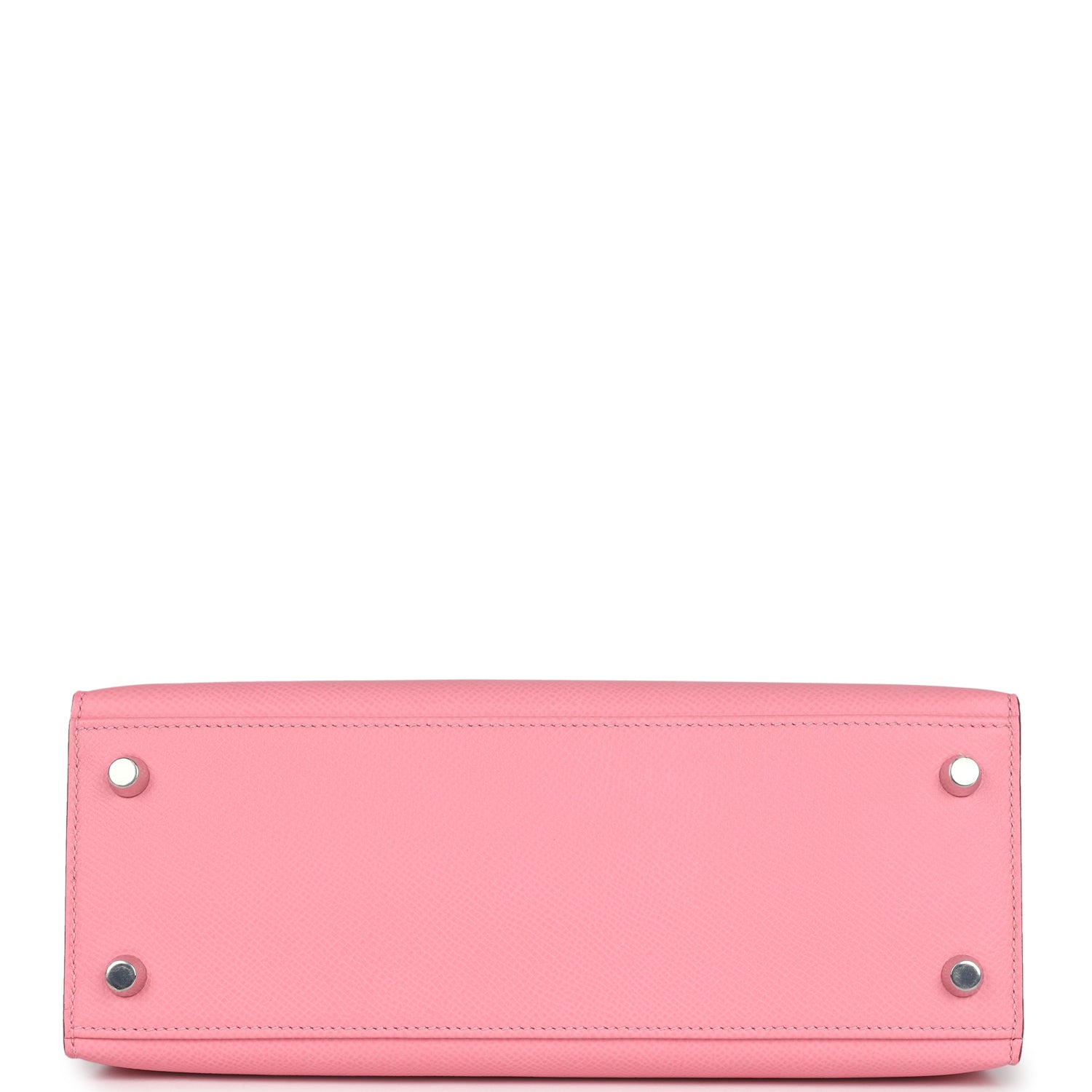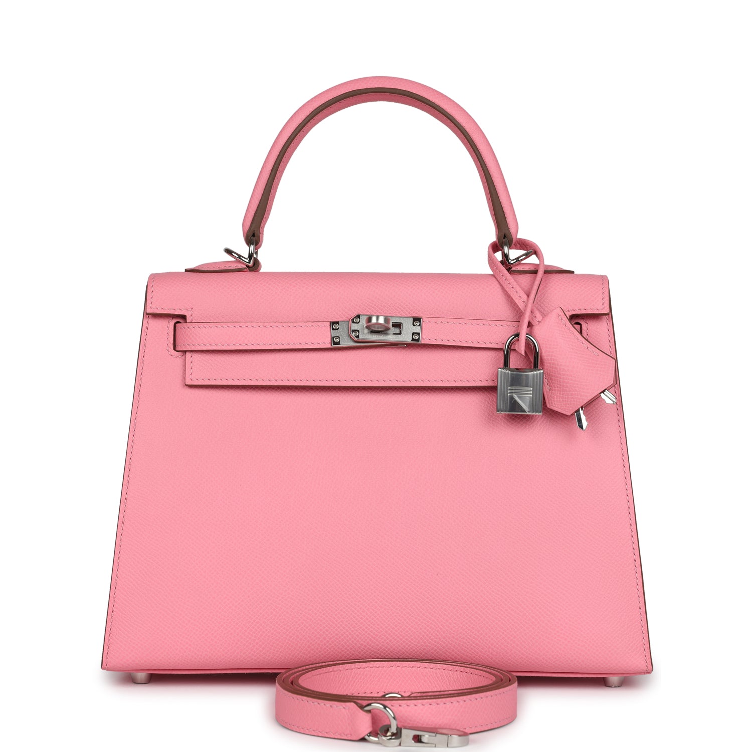 This Kelly. in the Sellier style. is in Rose Confetti epsom leather with palladium hardware. has tonal stitching. front flap. two straps with center toggle closure. clochette with lock and two keys a single rolled handle and removable shoulder strap.