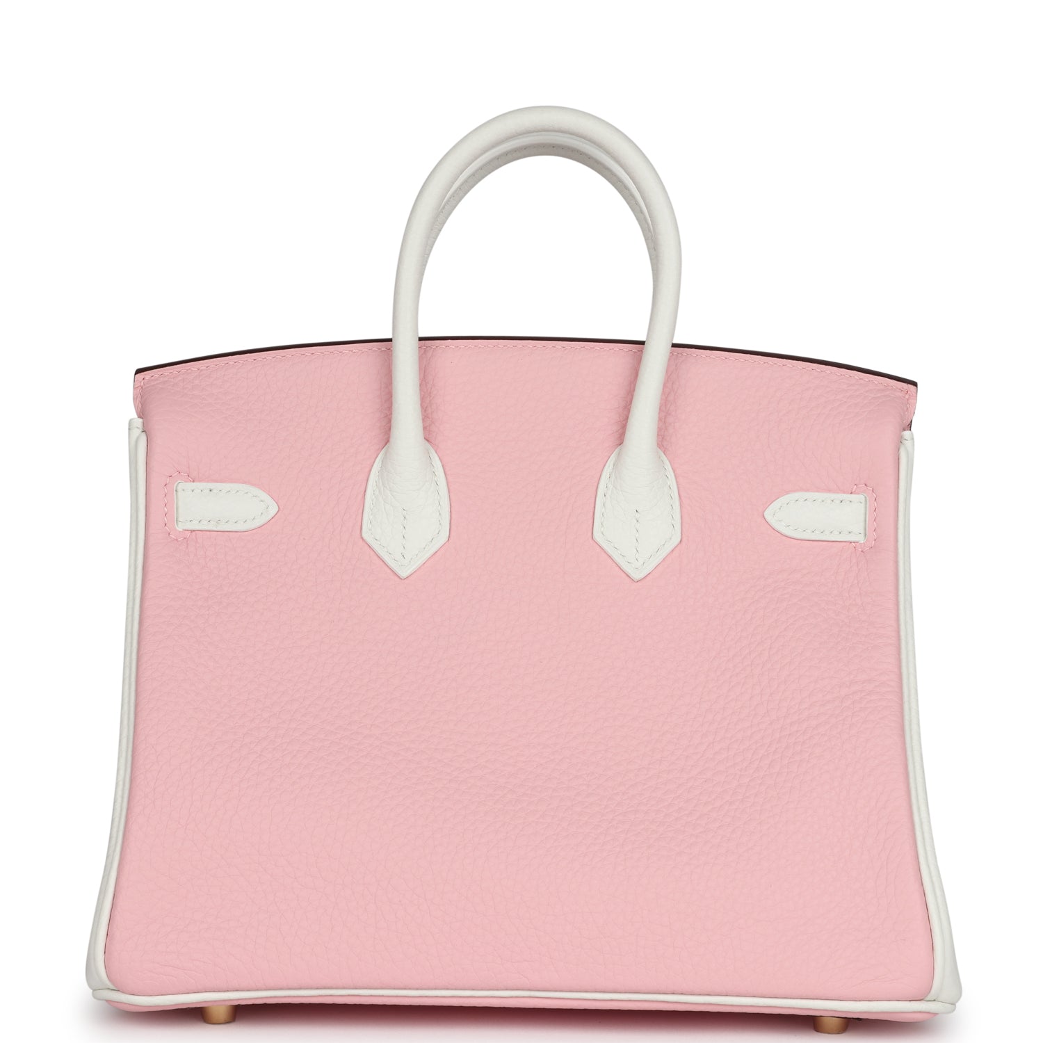 This Special Order Birkin is in Rose Sakura and White clemence leather with brushed gold hardware and has tonal stitching. front flap. two straps with center toggle closure. clochette with lock and two keys. and double rolled handles.