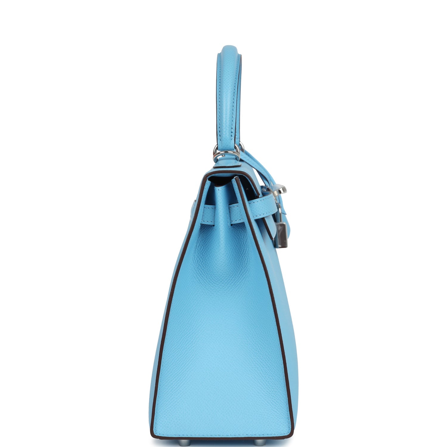 This Special Order Kelly. in the Sellier style. is in Bleu Celeste epsom leather with palladium hardware. tonal stitching. front flap with two straps. front toggle closure. a removable shoulder strap and single rolled handle.