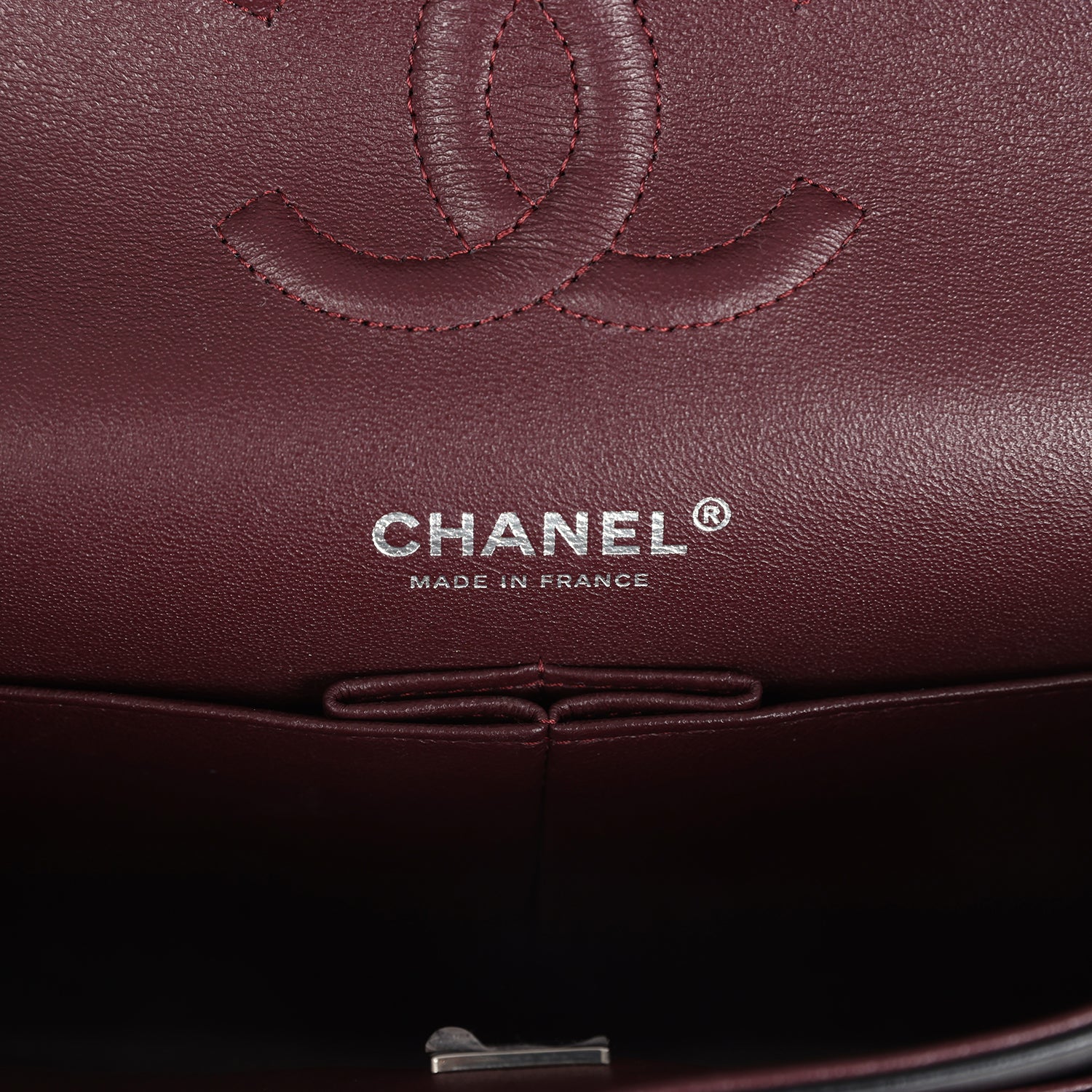 The interior is lined in burgundy leather with the "love letter" zipper compartment under the first flap. an "outer" slit pocket is under the second flap. and an interior compartment with two open pockets separated by a "lipstick" compartment.