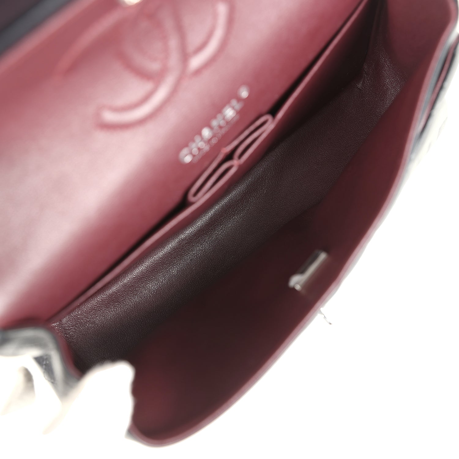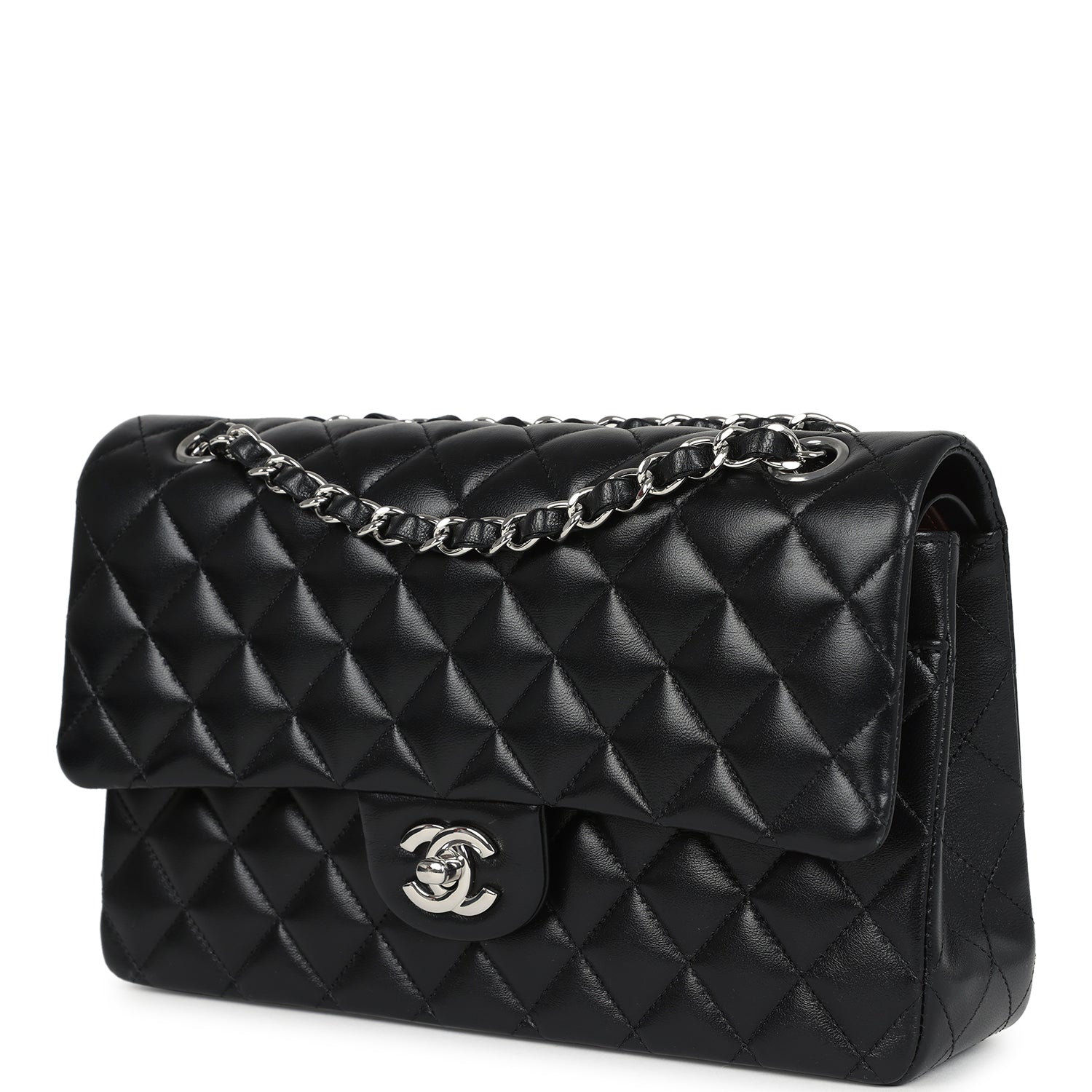 This Medium Classic Double Flap bag is in black lambskin leather with silver tone hardware and features a front flap with signature CC turnlock closure. half moon back pocket. and adjustable interwoven silver tone chain link and black leather shoulder/crossbody strap.
