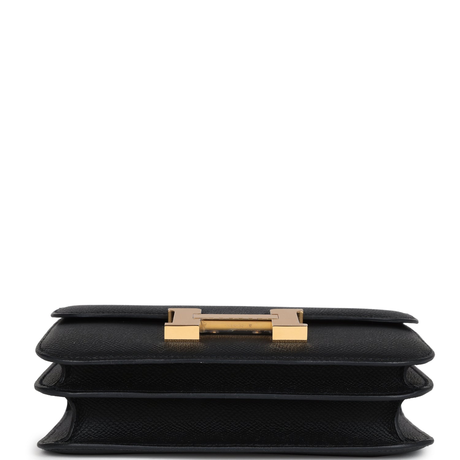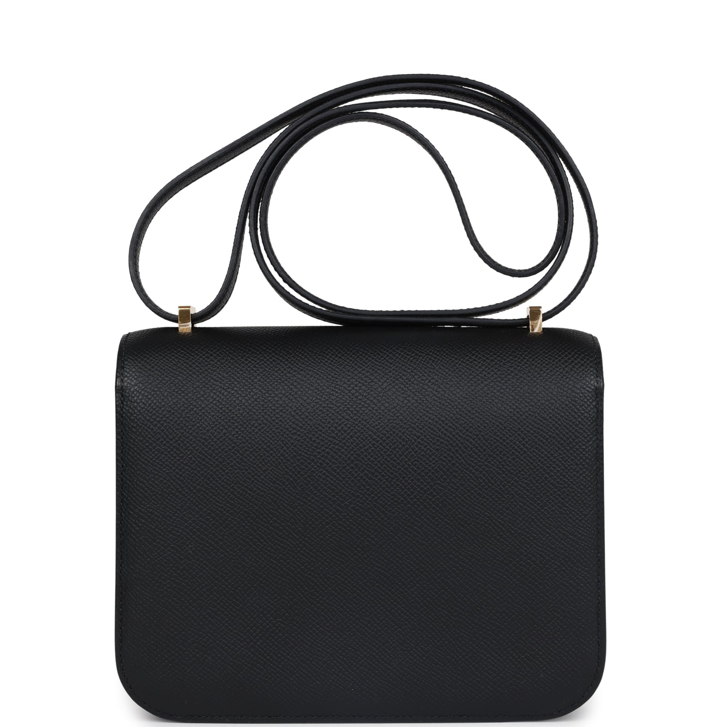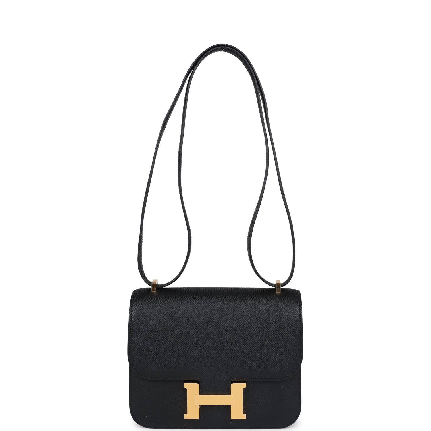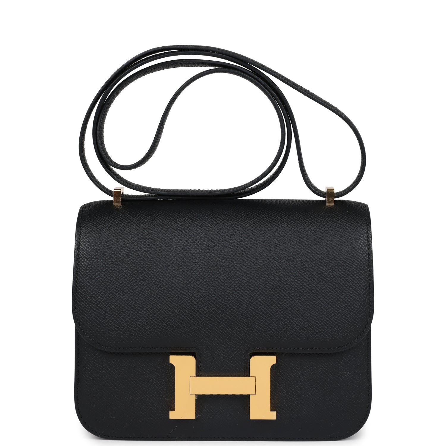 This Constance is in Black epsom leather with gold hardware and has tonal stitching. a metal "H" snap lock closure and adjustable shoulder strap.