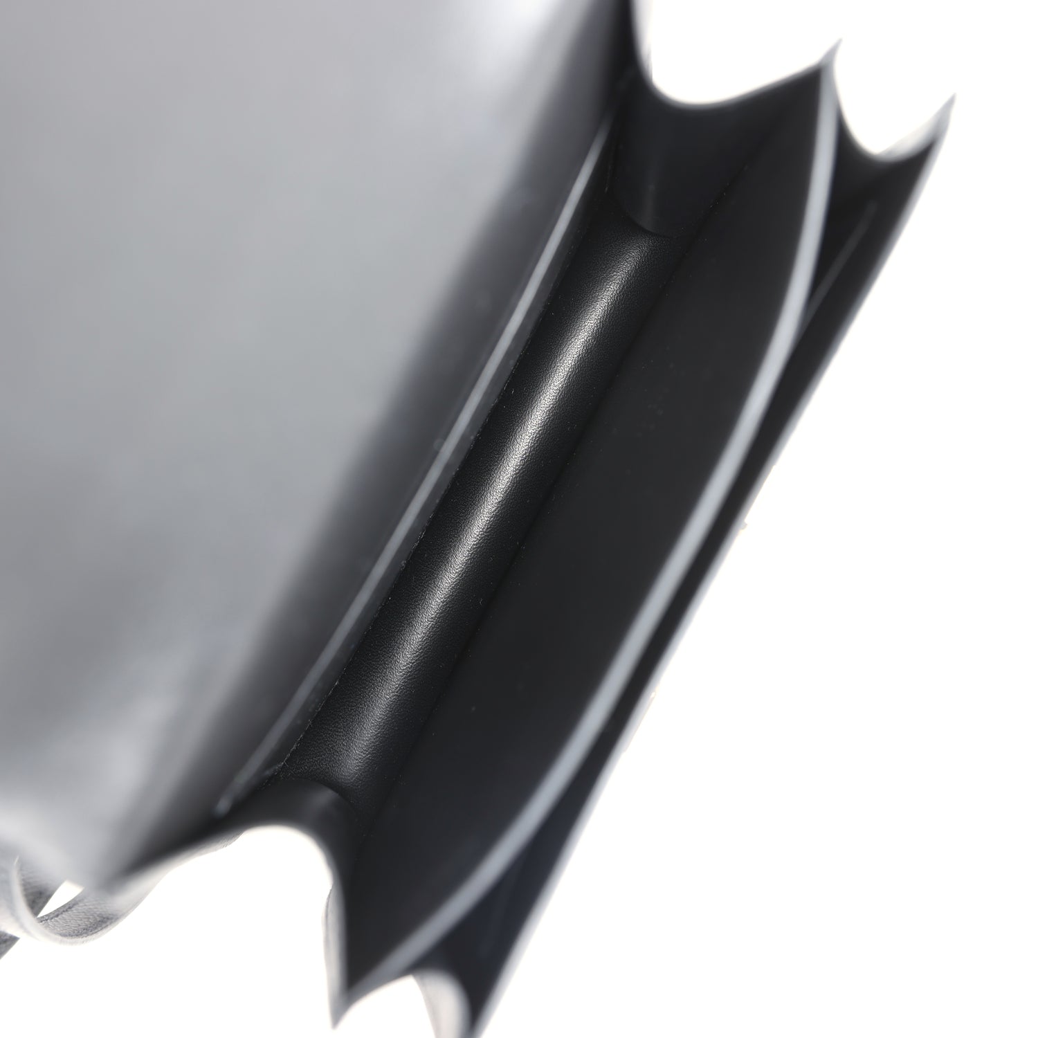 The interior is lined with Black lambskin and has an open pocket on the front wall. a center divide. and a slit pocket on the back wall.