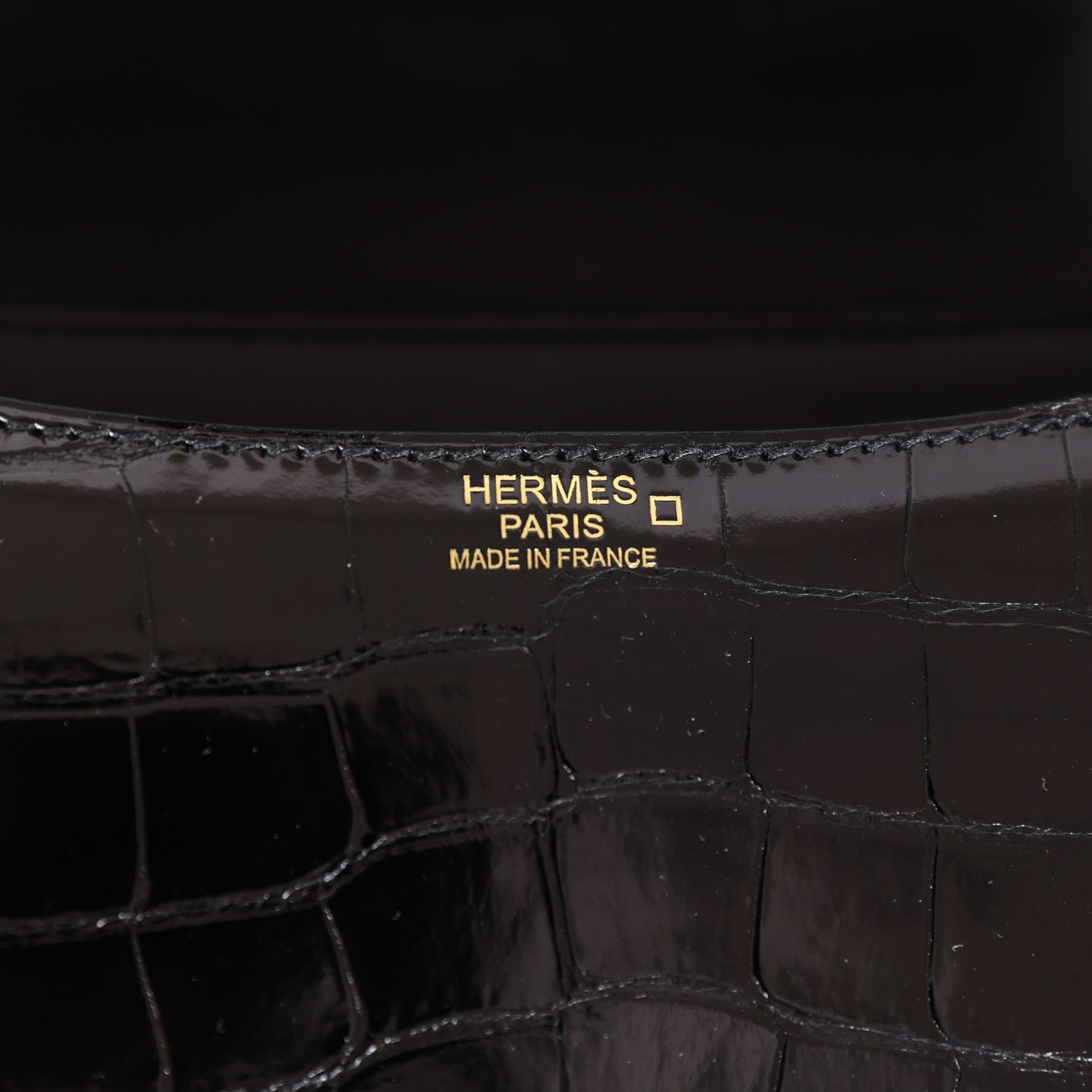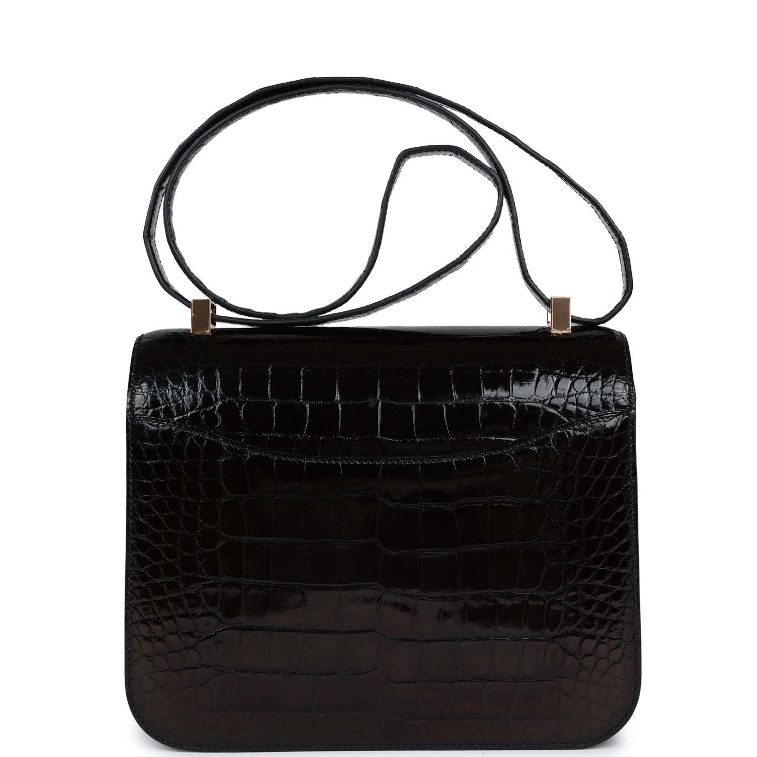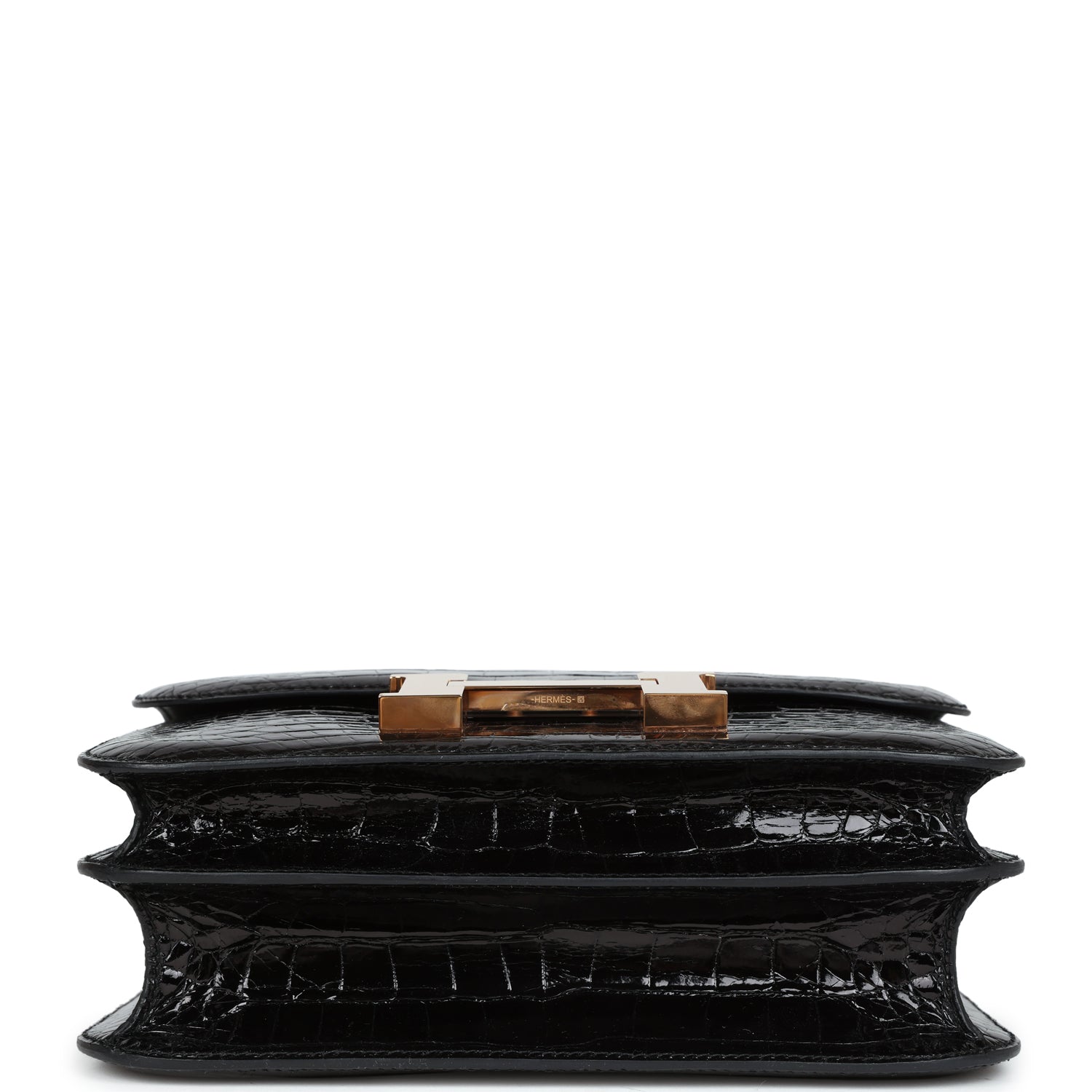 This Constance is of Black shiny alligator with rose gold hardware and features tonal stitching. a "H" snap lock closure. and an adjustable shoulder strap.