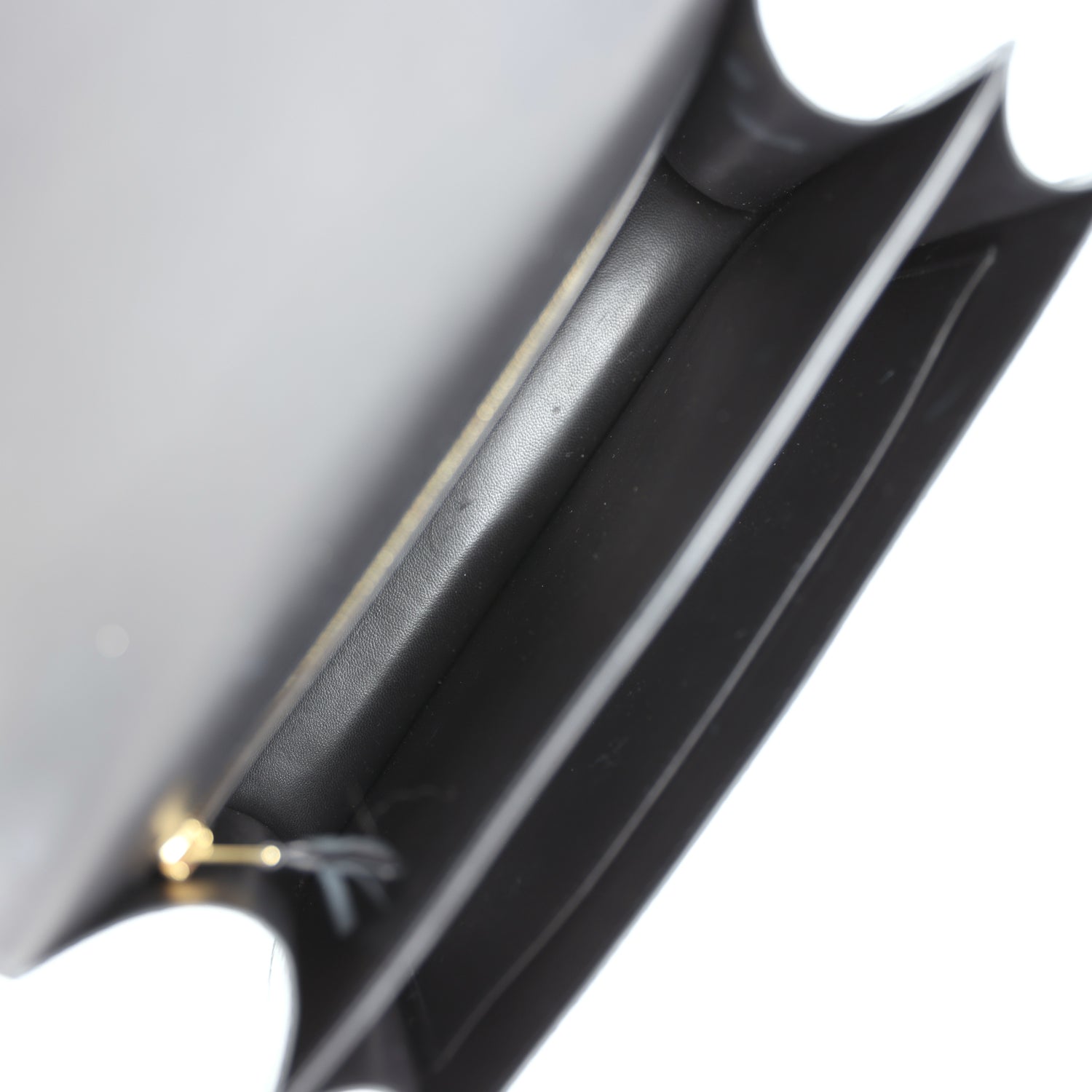 The interior is lined with black lambskin and has an open pocket on the front wall. two main compartments. back zip pocket and a slit pocket on the back wall.