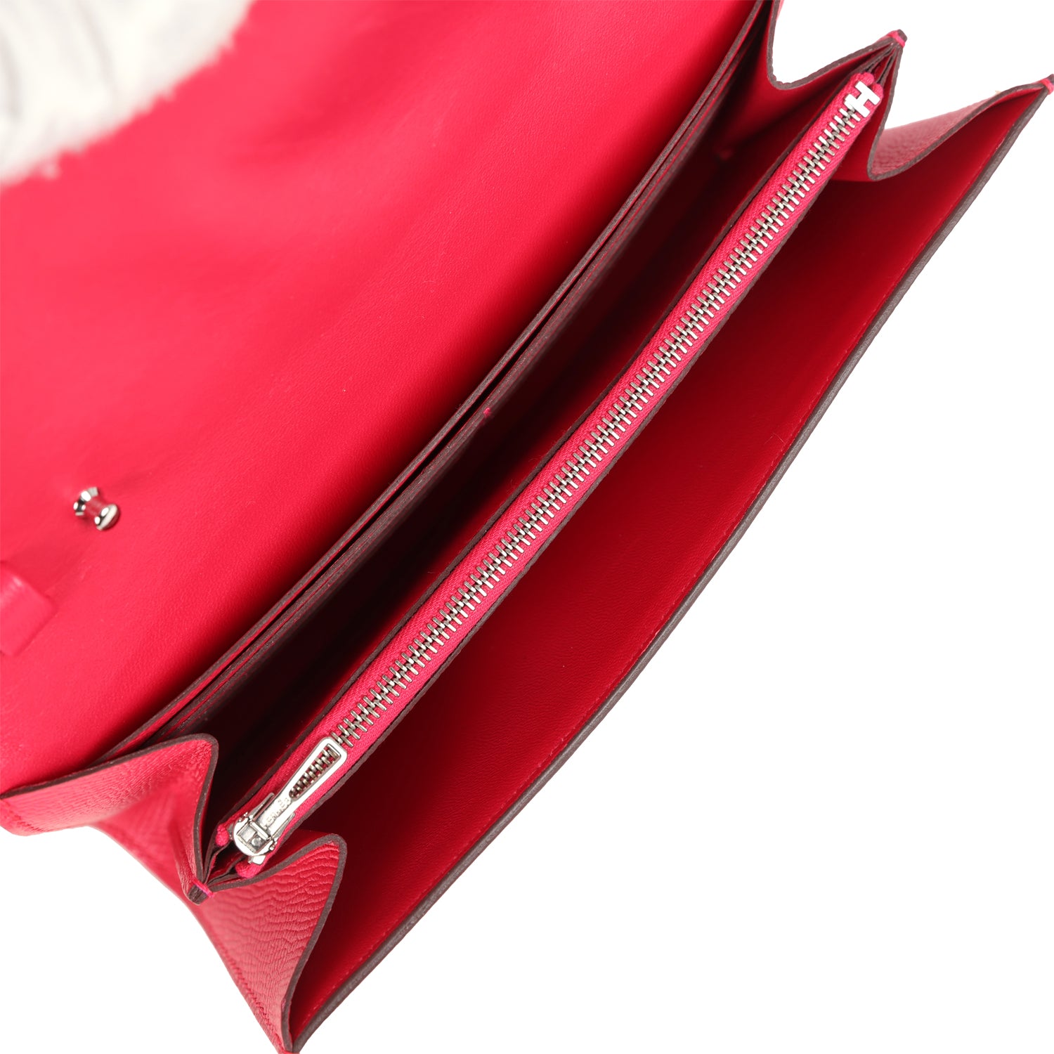 The interior is lined with Rose Extreme leather and two main compartments with six credit card slots and a zippered center compartment with Hermes H lock pull.