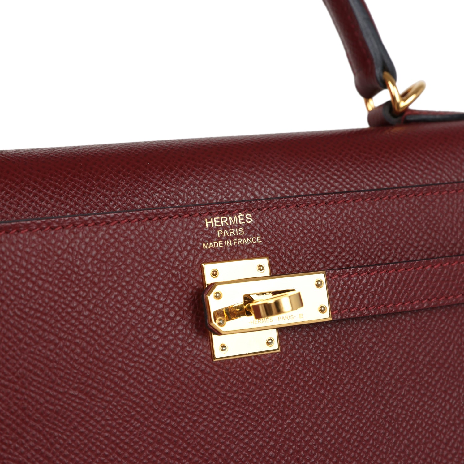 This Kelly. in the Sellier style. is in Rouge H epsom leather with gold hardware. tonal stitching. front flap with two straps. front toggle closure. a removable shoulder strap and single rolled handle.