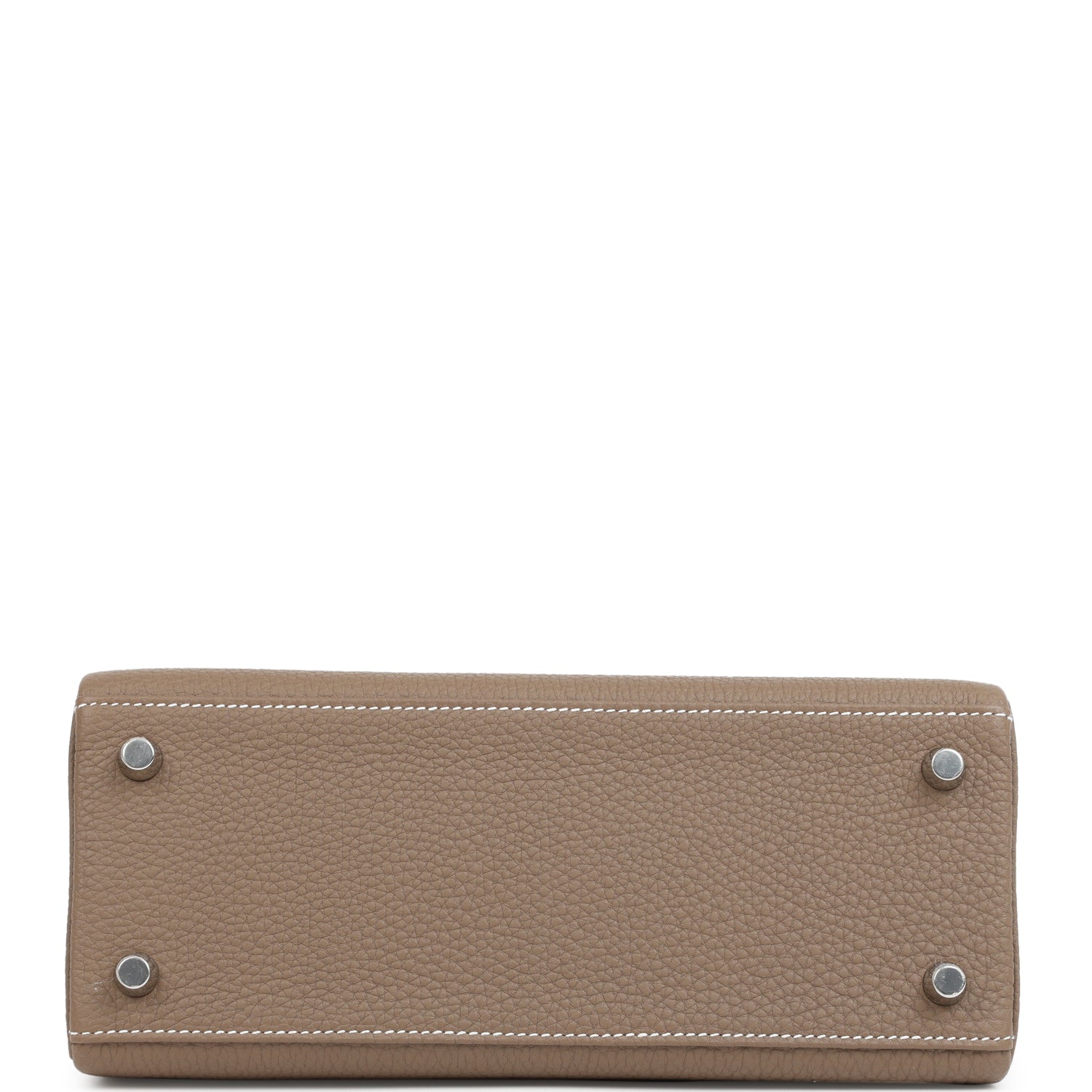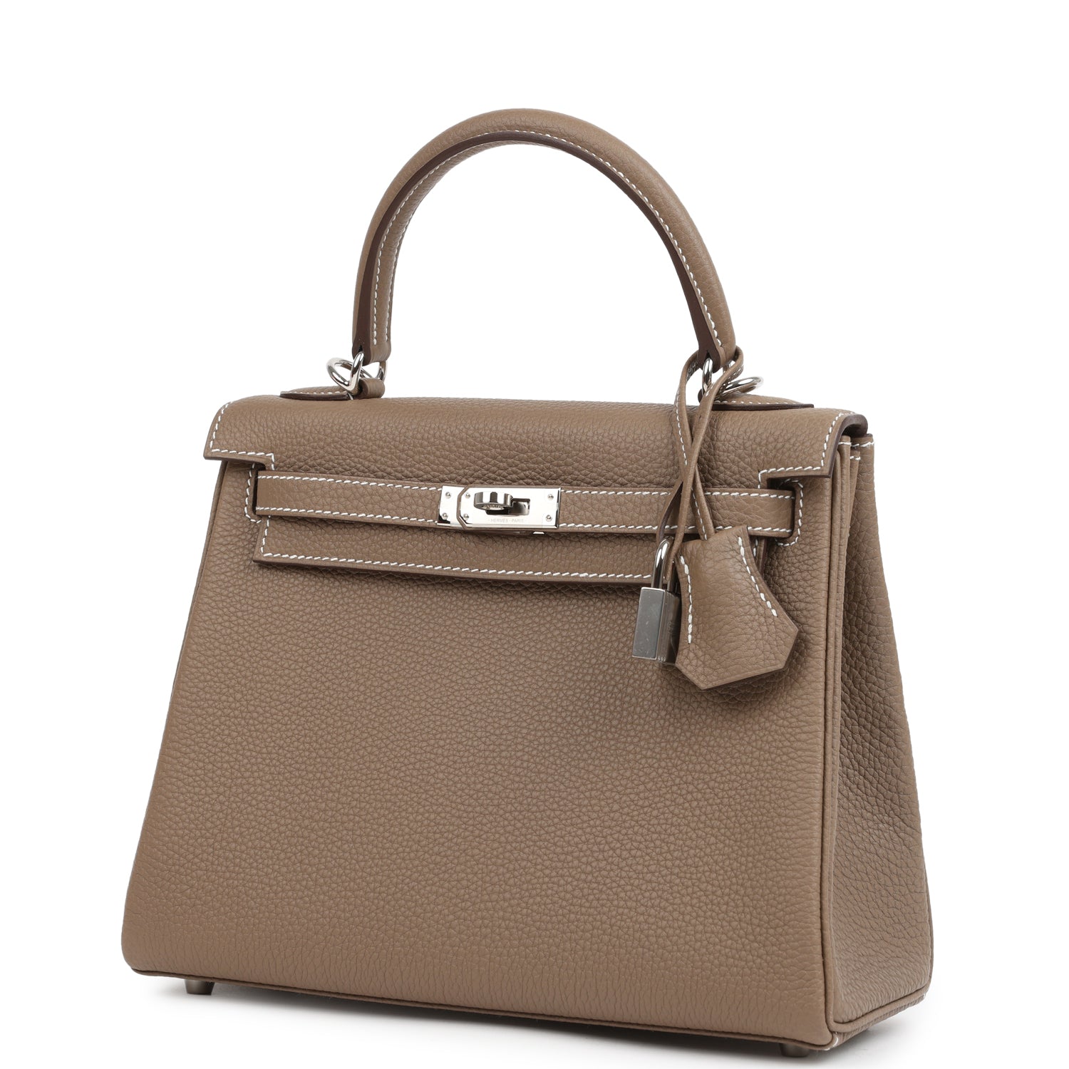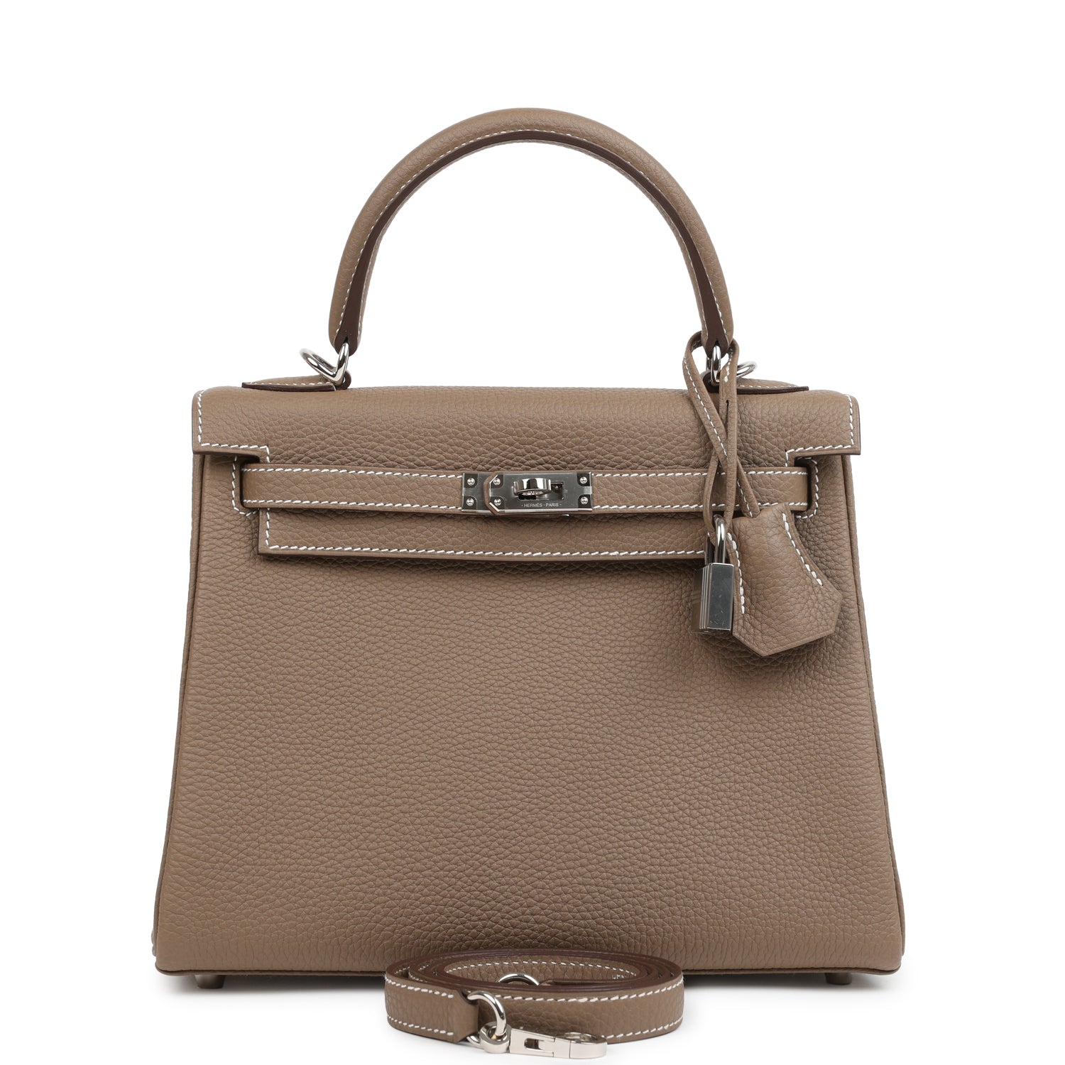 This Kelly. in the Retourne style. is of Etoupe togo leather with palladium hardware and has contrast stitching. front flap. two straps with center toggle closure. clochette with lock and two keys. single rolled handle and an optional shoulder strap.