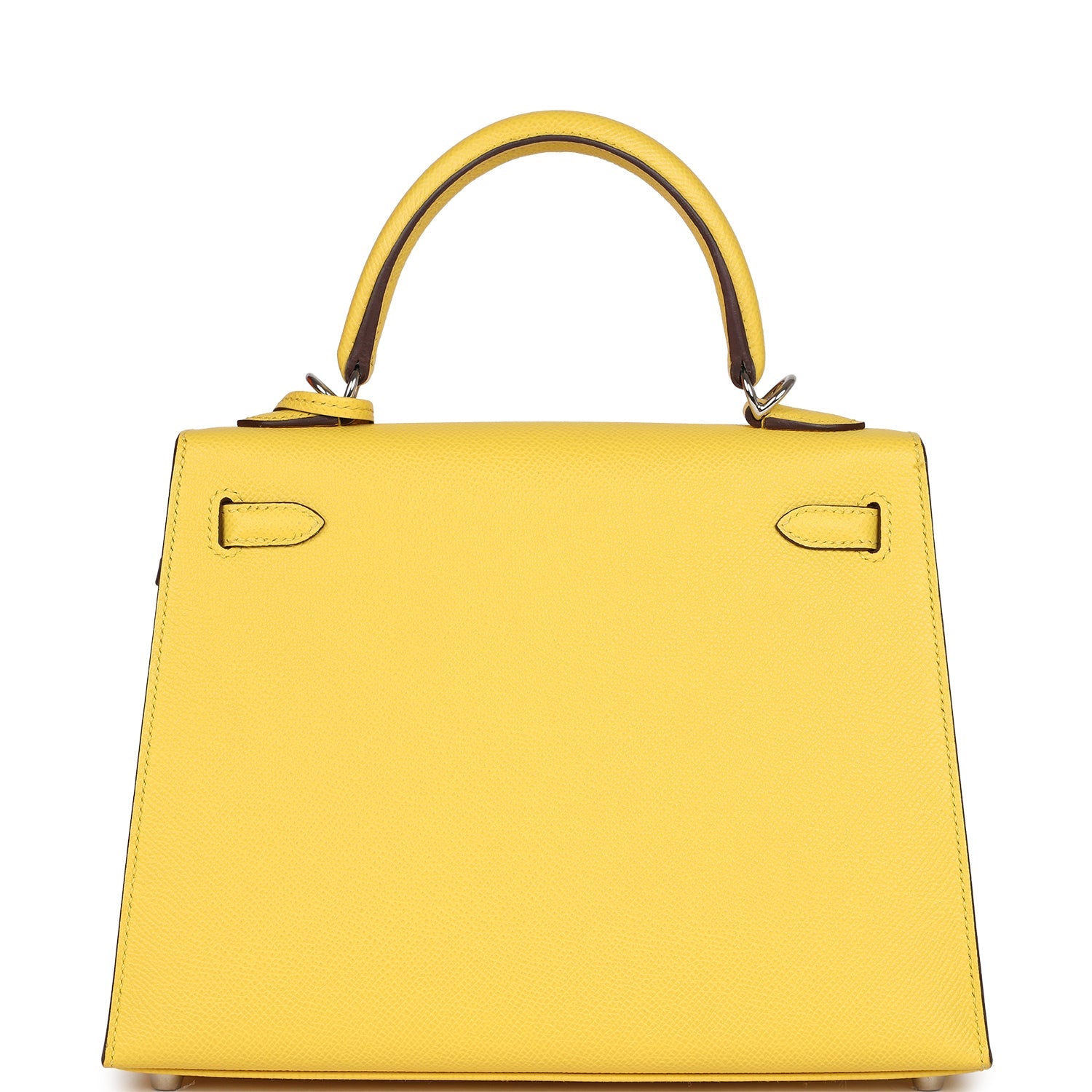 This Kelly. in the Sellier style. is in Jaune De Naples epsom leather with palladium hardware and has tonal stitching. two straps with front toggle closure. clochette with lock and two keys. single rolled handle and removable shoulder strap.