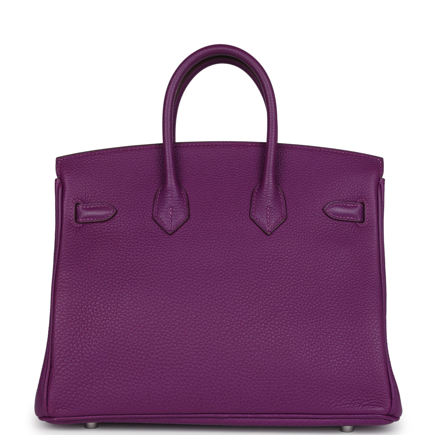 This Special Order Birkin is in Anemone togo leather with palladium hardware and has pink contrast stitching. front flap. two straps with center toggle closure. clochette with lock and one key. and double rolled handles.