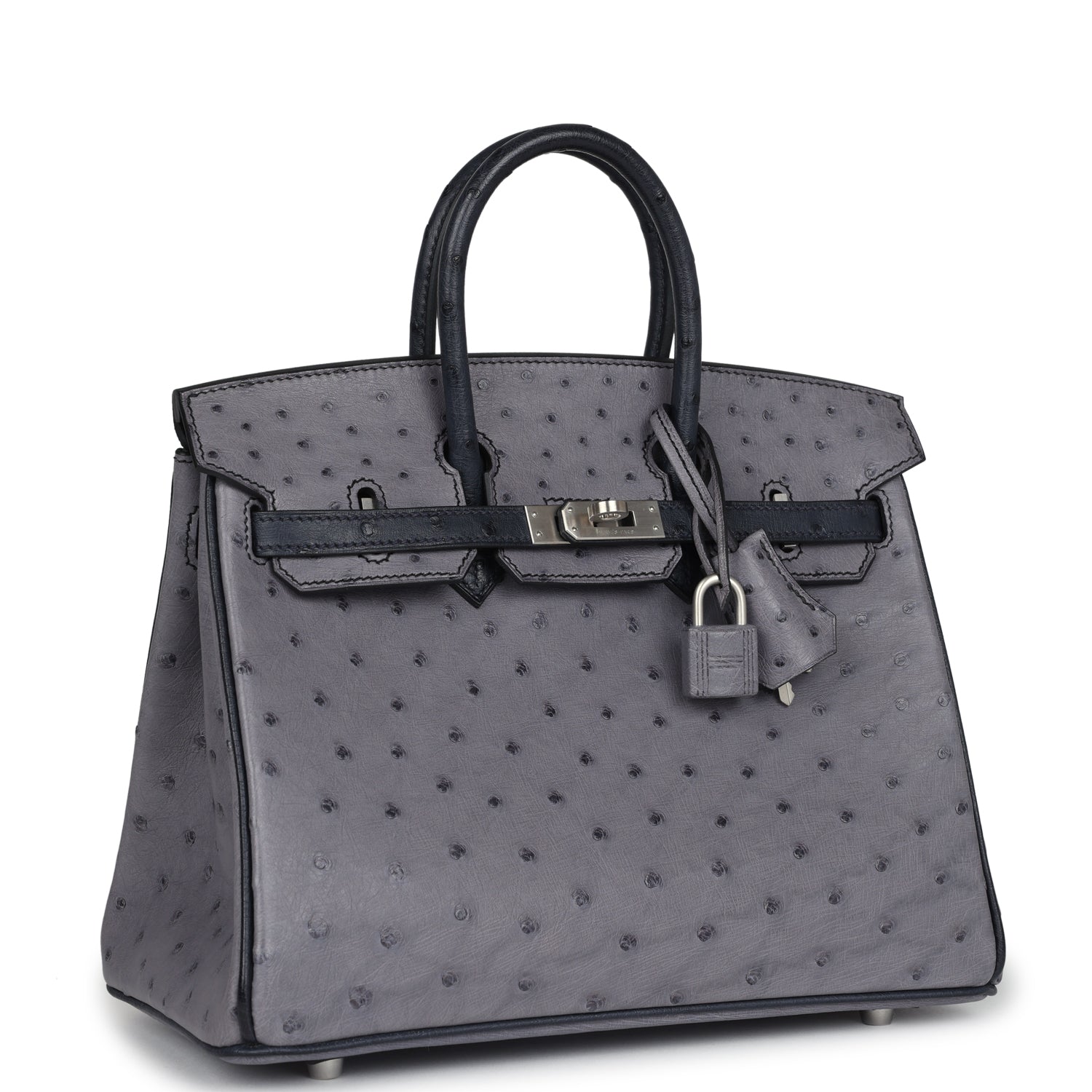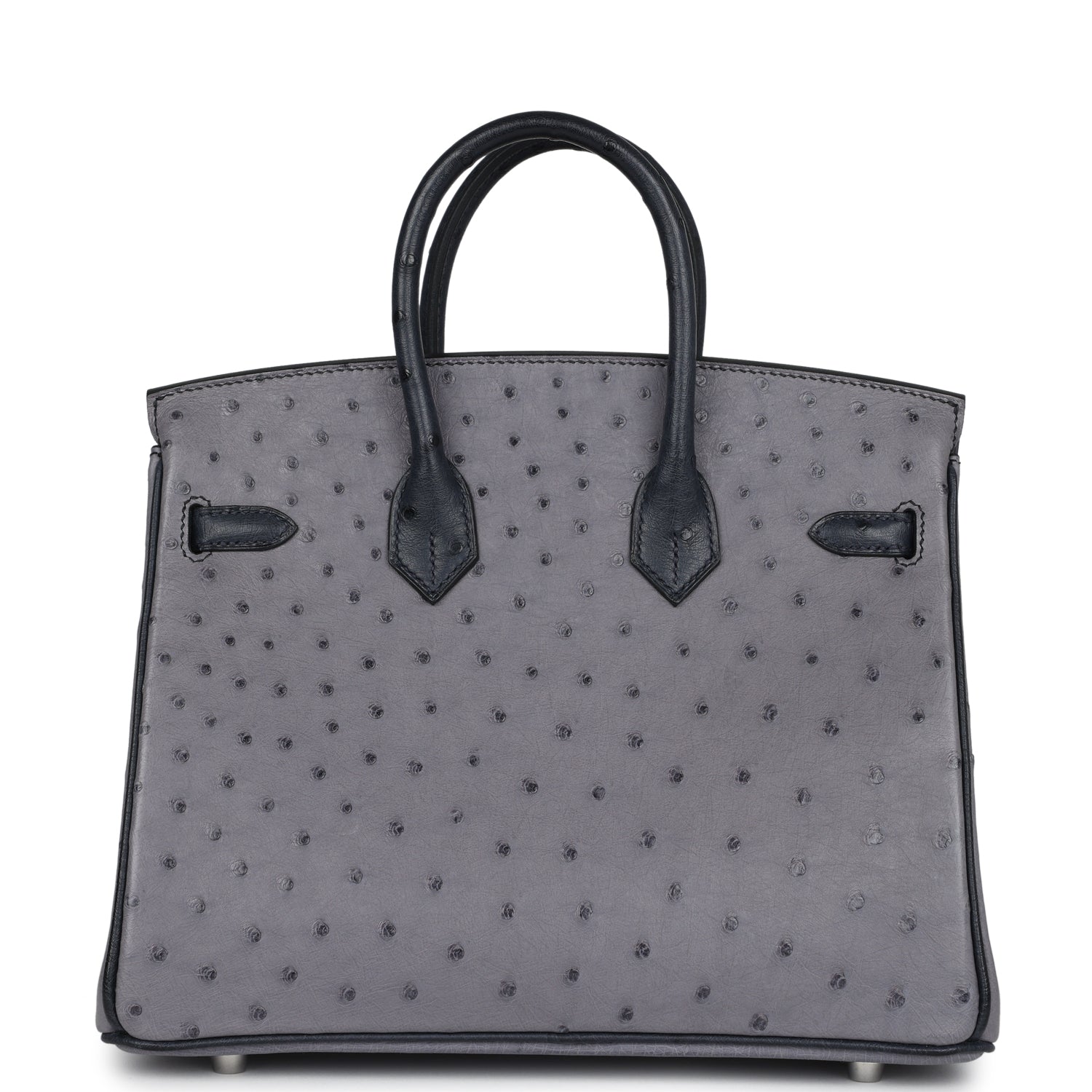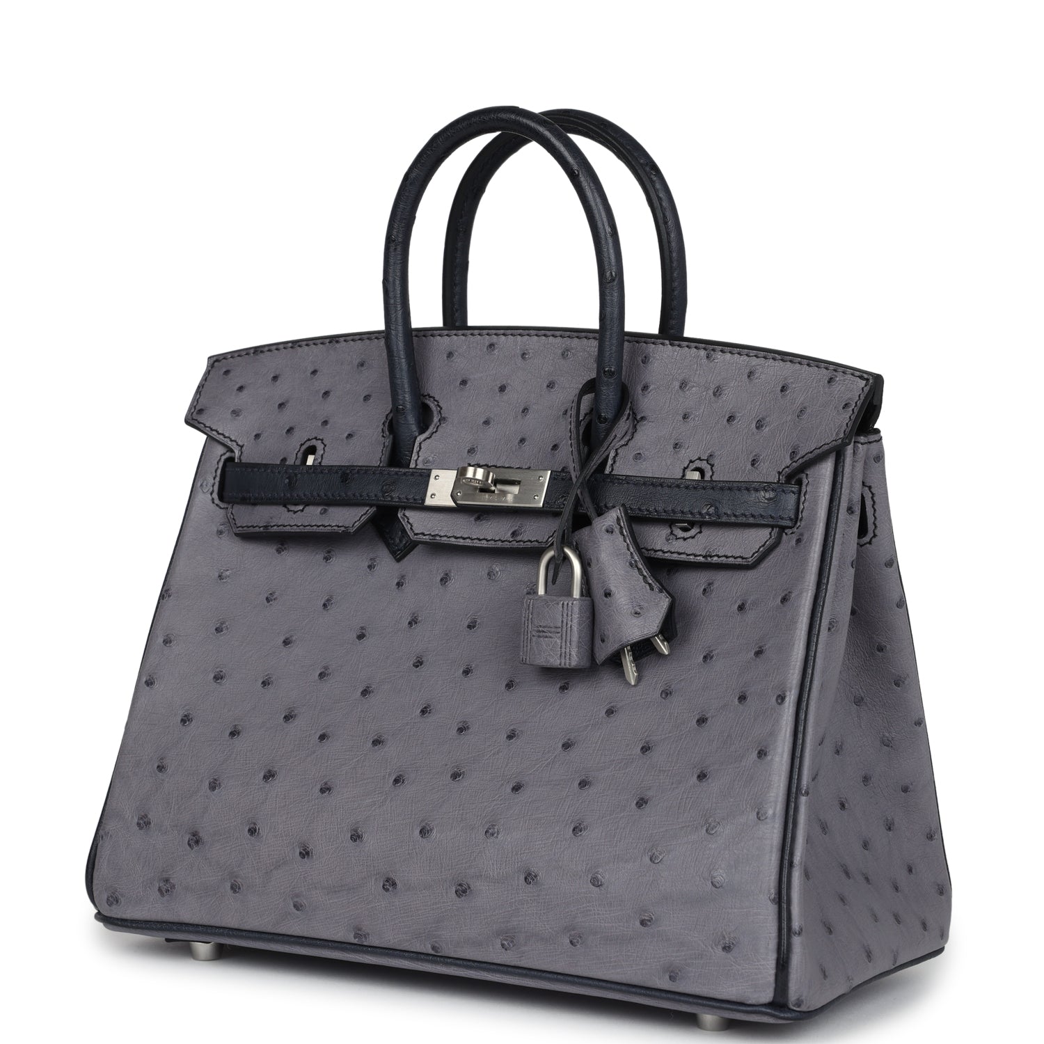 This Special Order Birkin is in Gris Agate and Bleu Indigo ostrich leather with brushed palladium hardware. It has a mixture of tonal and contrast stitching. front flap. two straps with center toggle closure. clochette with lock and two keys. and double rolled handles.