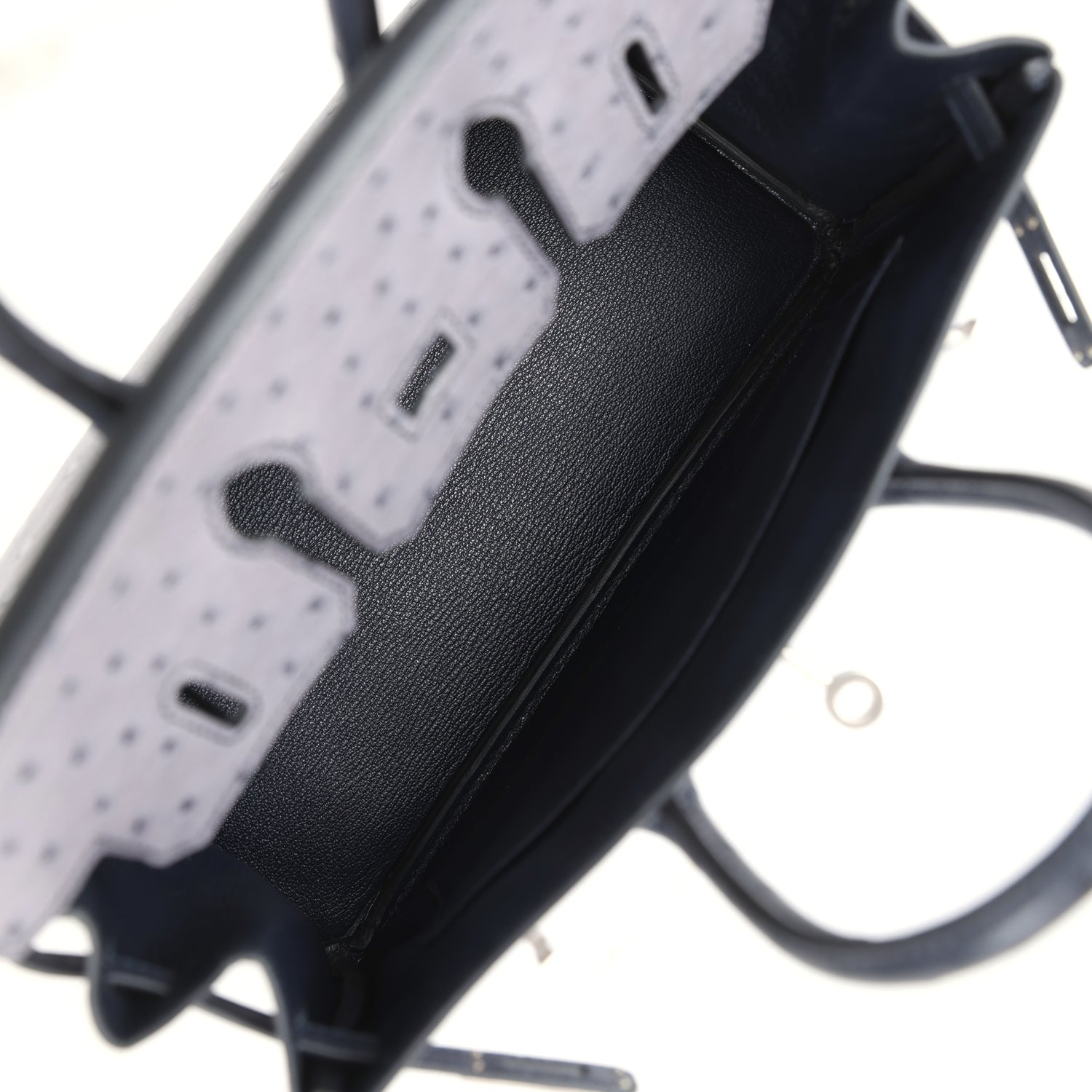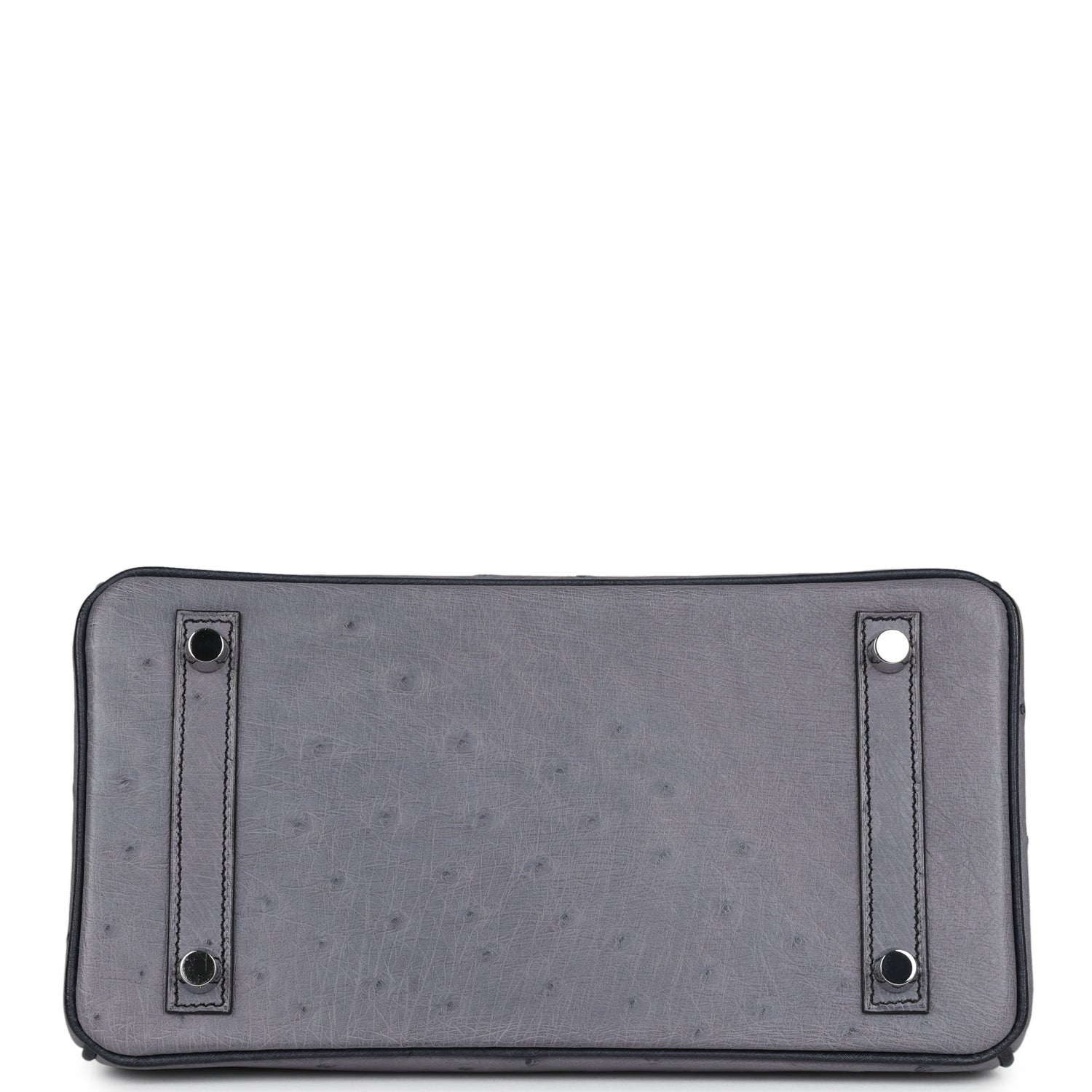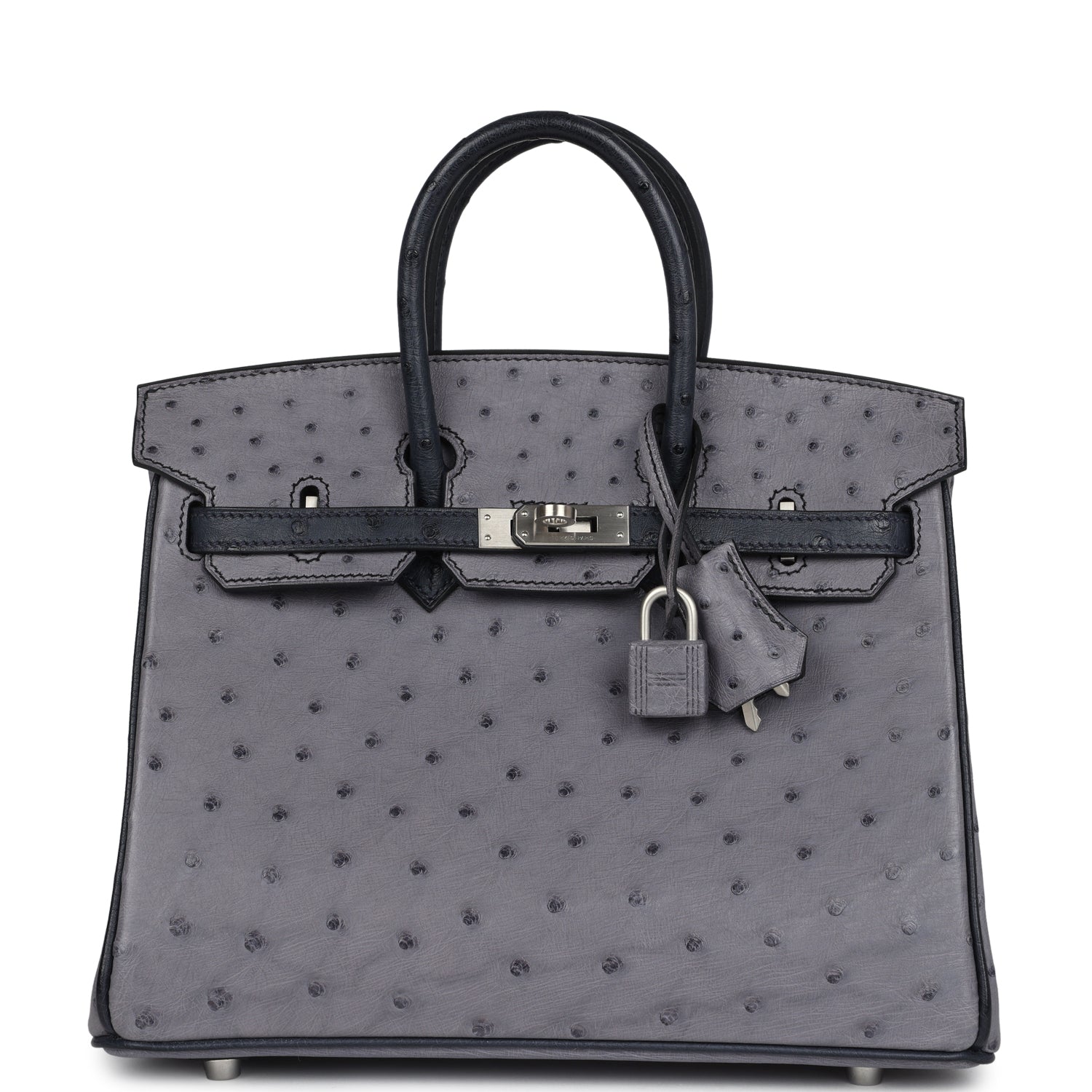 This Special Order Birkin is in Gris Agate and Bleu Indigo ostrich leather with brushed palladium hardware. It has a mixture of tonal and contrast stitching. front flap. two straps with center toggle closure. clochette with lock and two keys. and double rolled handles.