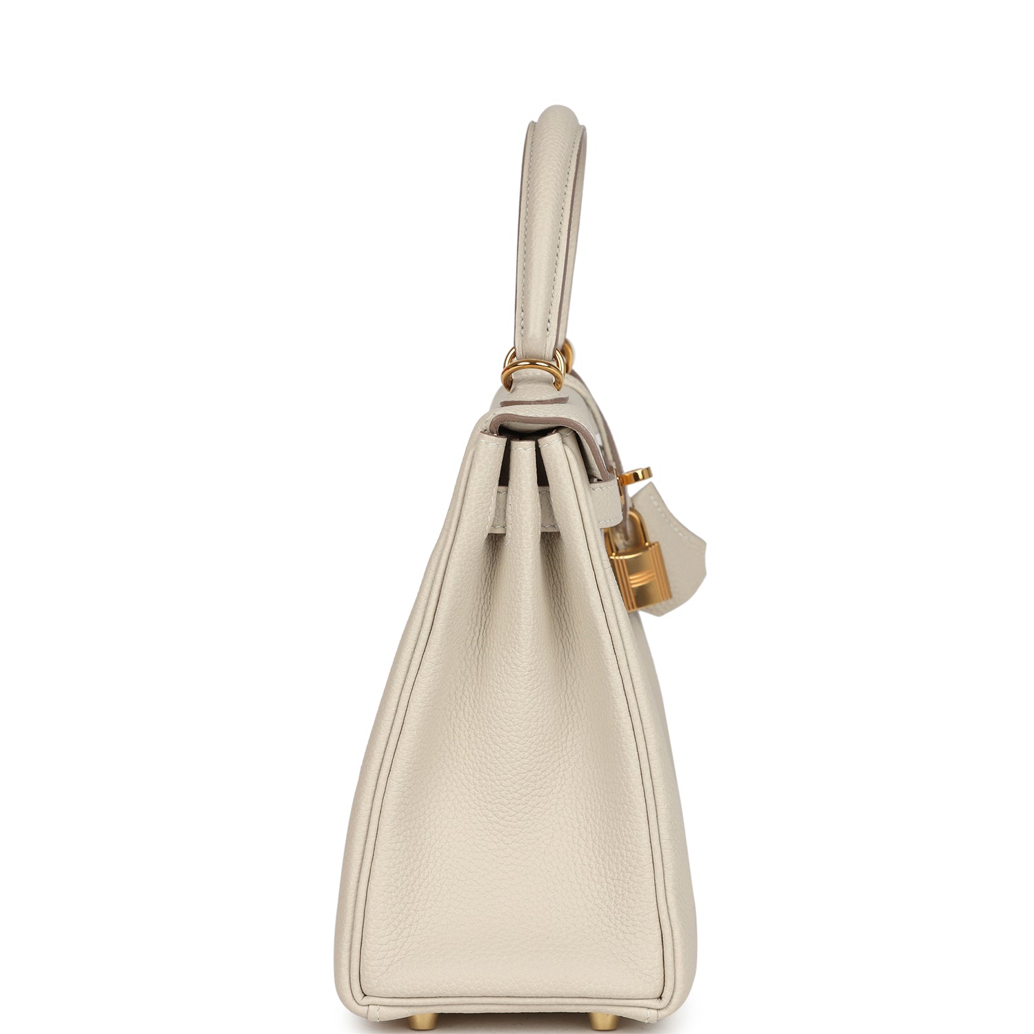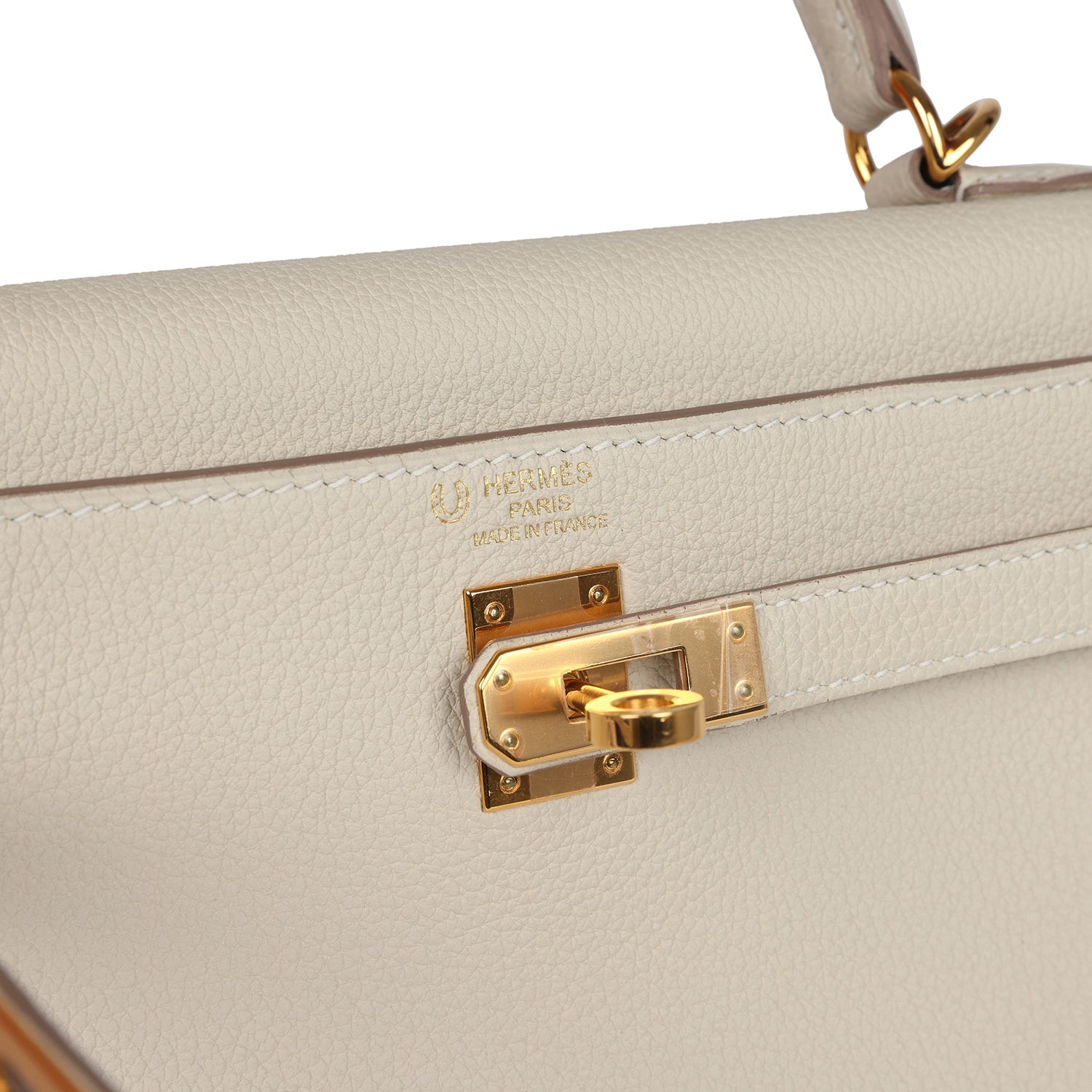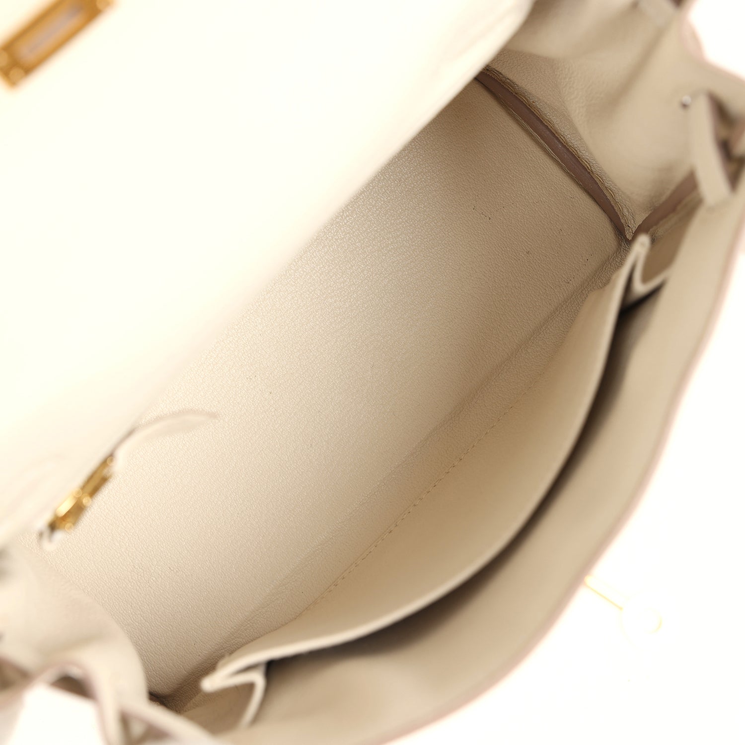 This Special Order Kelly. in the Retourne style. is in Craie togo leather with gold hardware has tonal stitching. front flap. two straps with center toggle closure. clochette with lock and two keys. single rolled handle and an removable special order long shoulder strap.