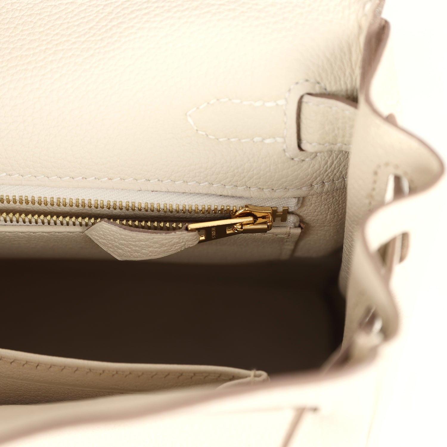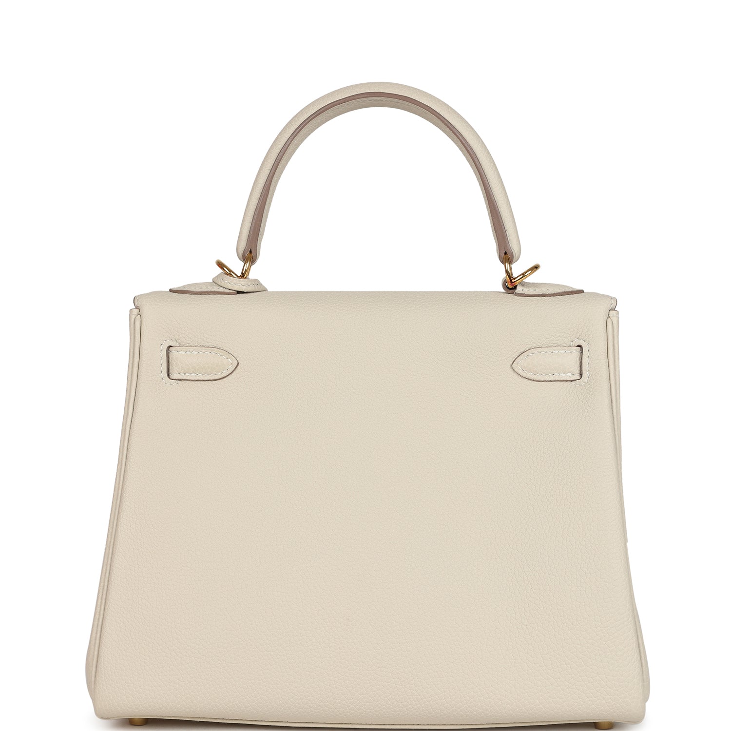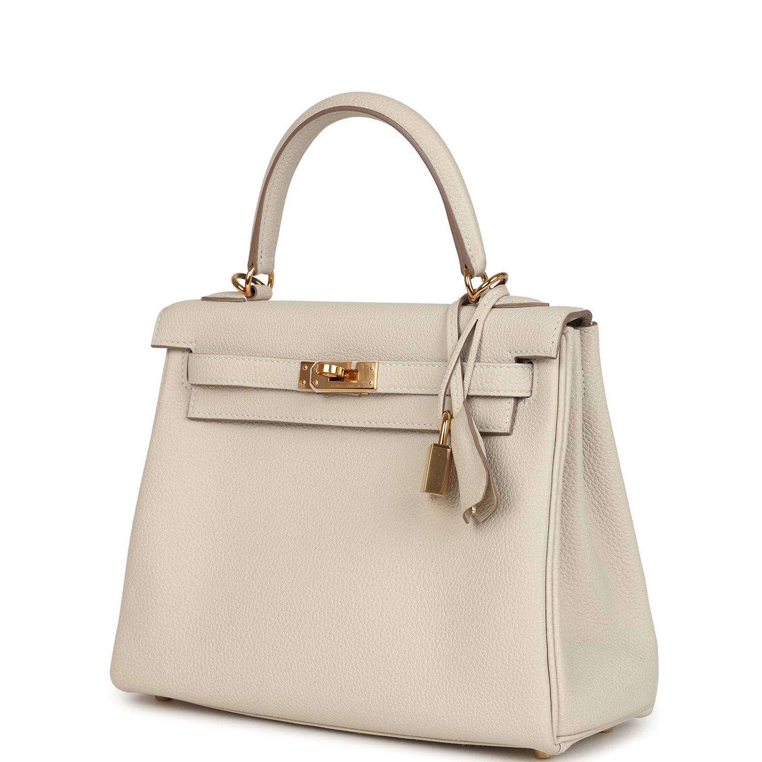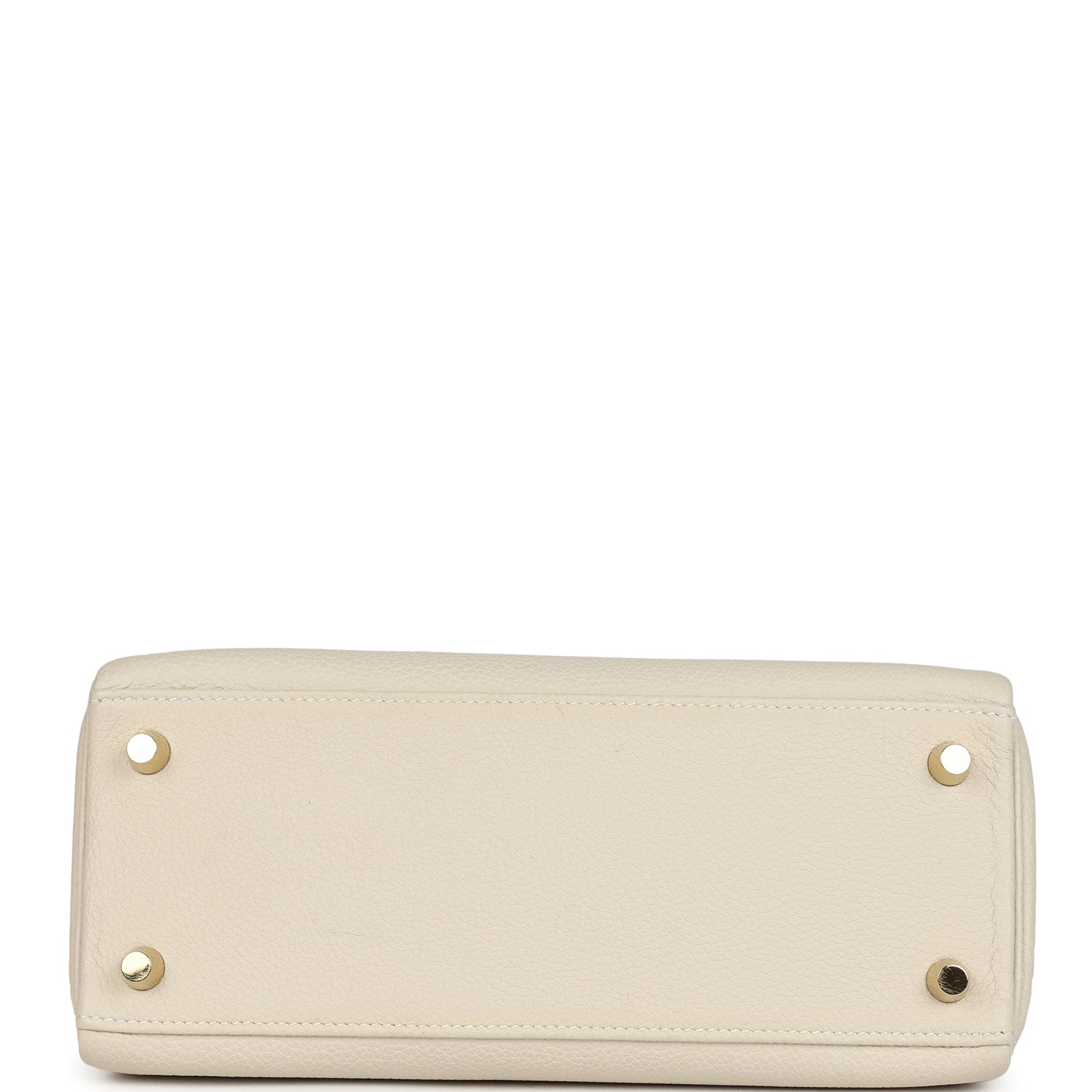This Special Order Kelly. in the Retourne style. is in Craie togo leather with gold hardware has tonal stitching. front flap. two straps with center toggle closure. clochette with lock and two keys. single rolled handle and an removable special order long shoulder strap.