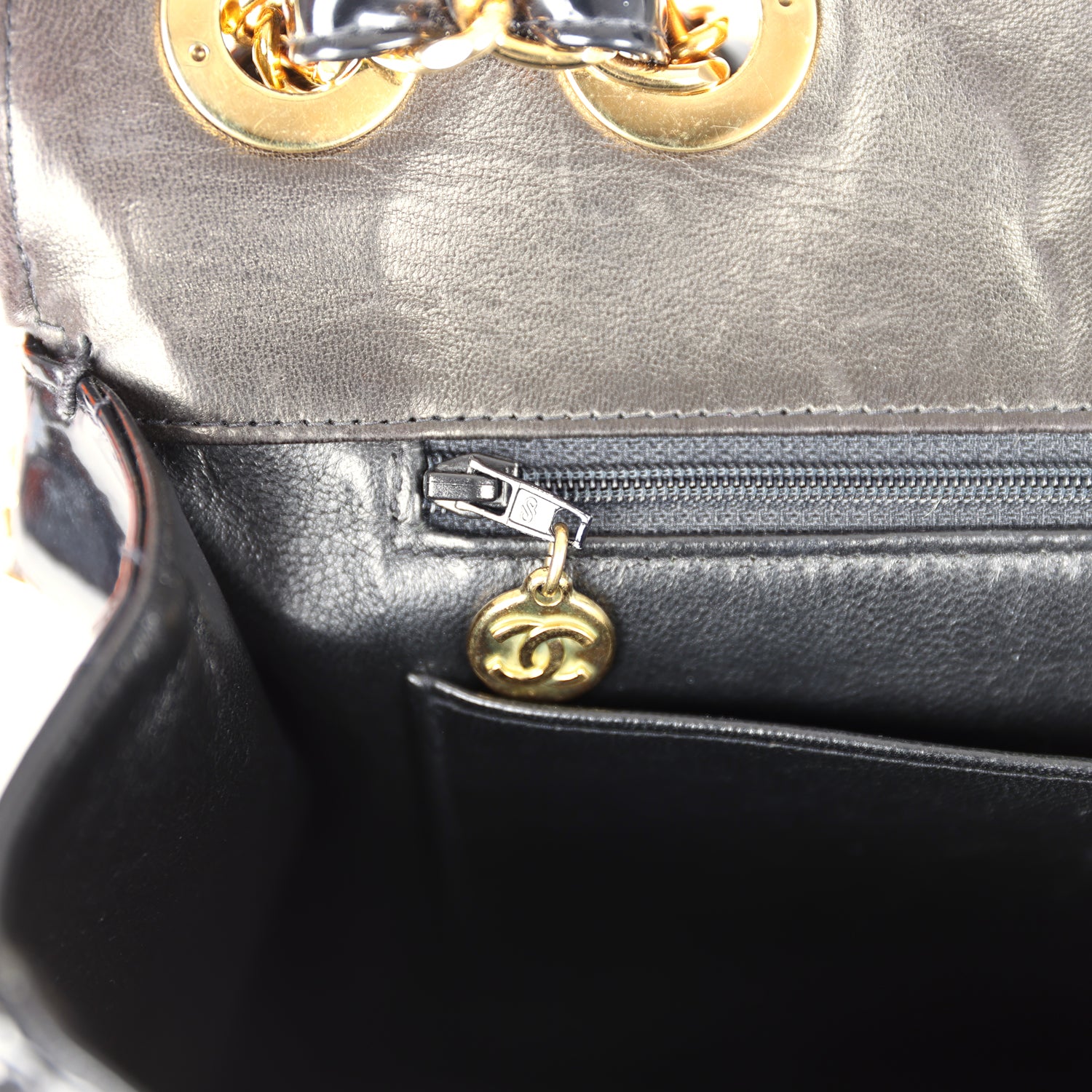 Condition: Vintage; Excellent - This bag retains its shape. There's moderate scratching to the hardware. The exterior has some light scratching and dulling to the patent leather throughout. The interior shows signs of wear with press markings. creasing and scratching to the leather. especially on the flap.