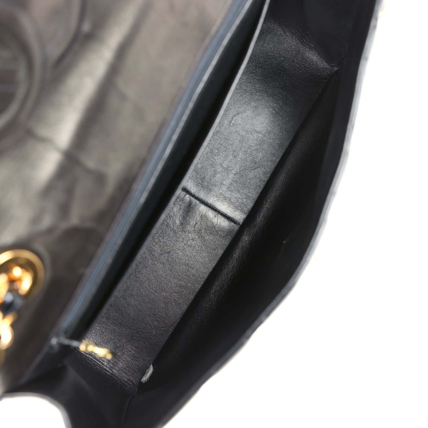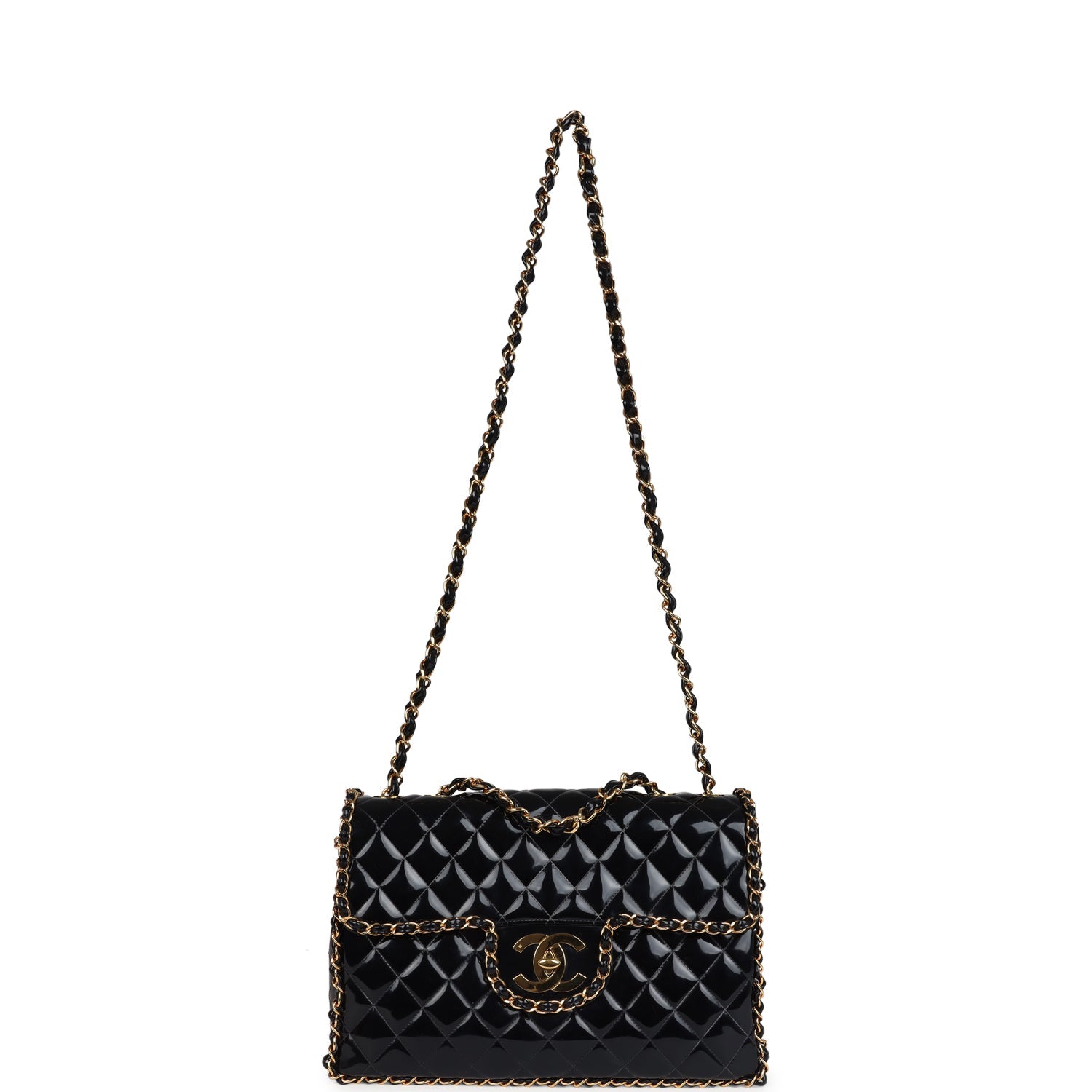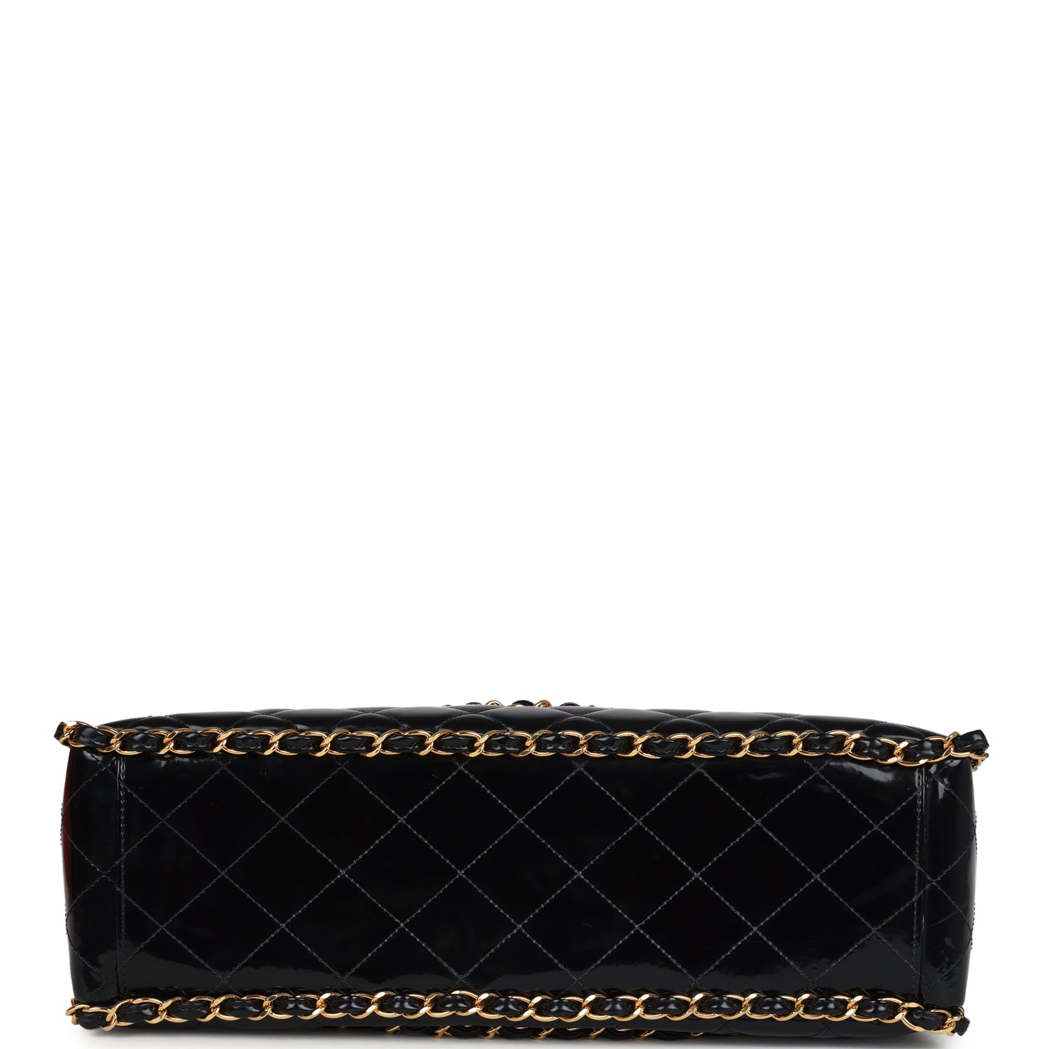 This Vintage Chanel Maxi Chain Around Single Flap Bag is in back patent leather with gold hardware and features a signature CC turnlock closure. half moon back pocket. all over wrap around interwoven black patent leather and gold chain detail. and interwoven black patent leather and gold hardware shoulder/crossbody strap.
