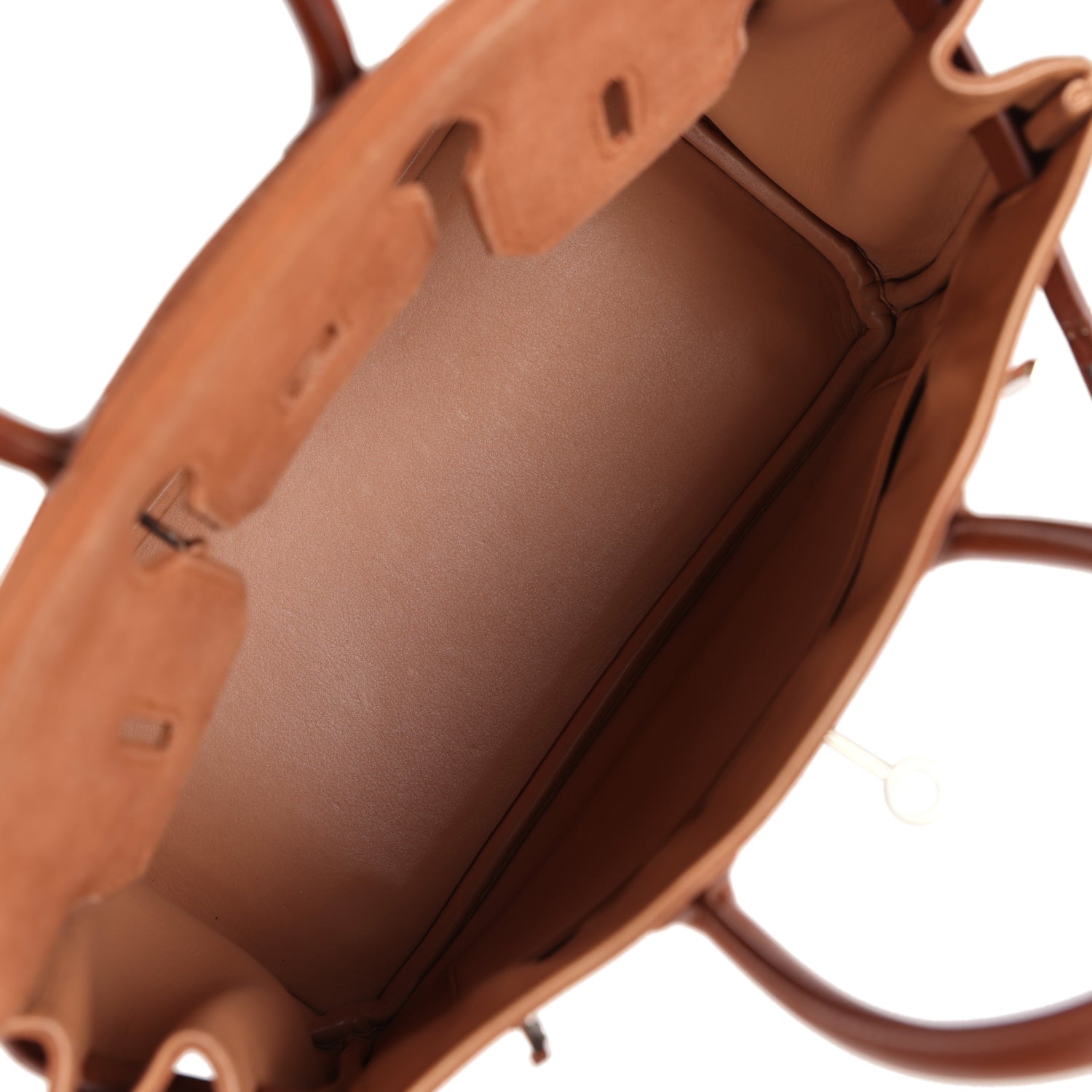 The interior is lined with Noisette swift leather and has one zip pocket with an Hermes engraved zipper pull and an open pocket on the opposite side.