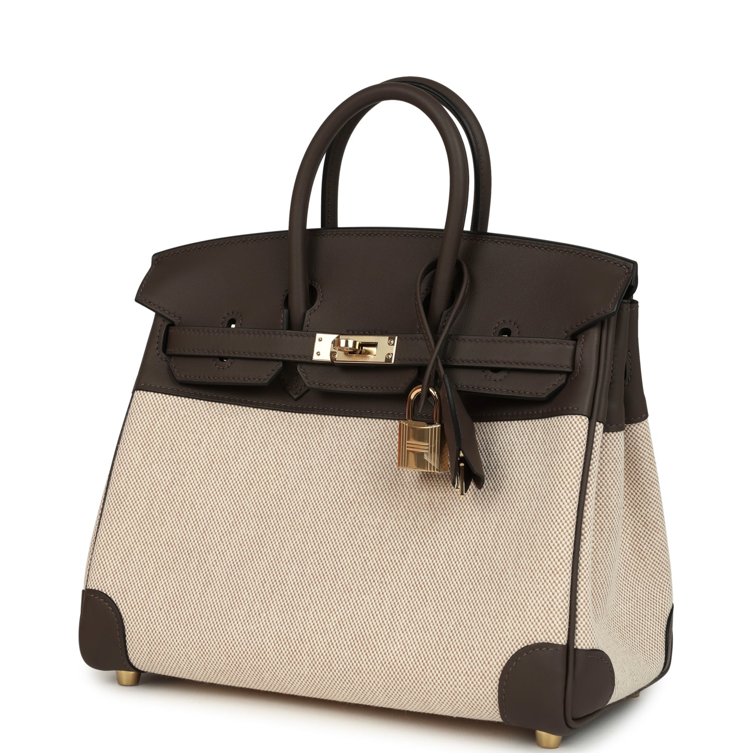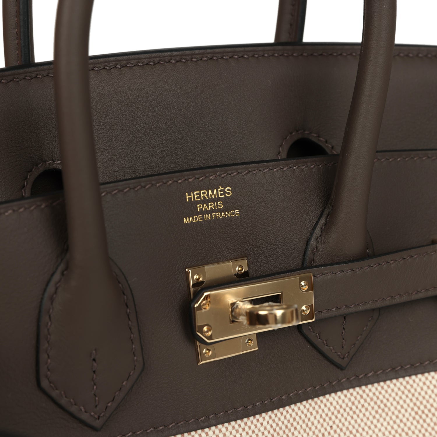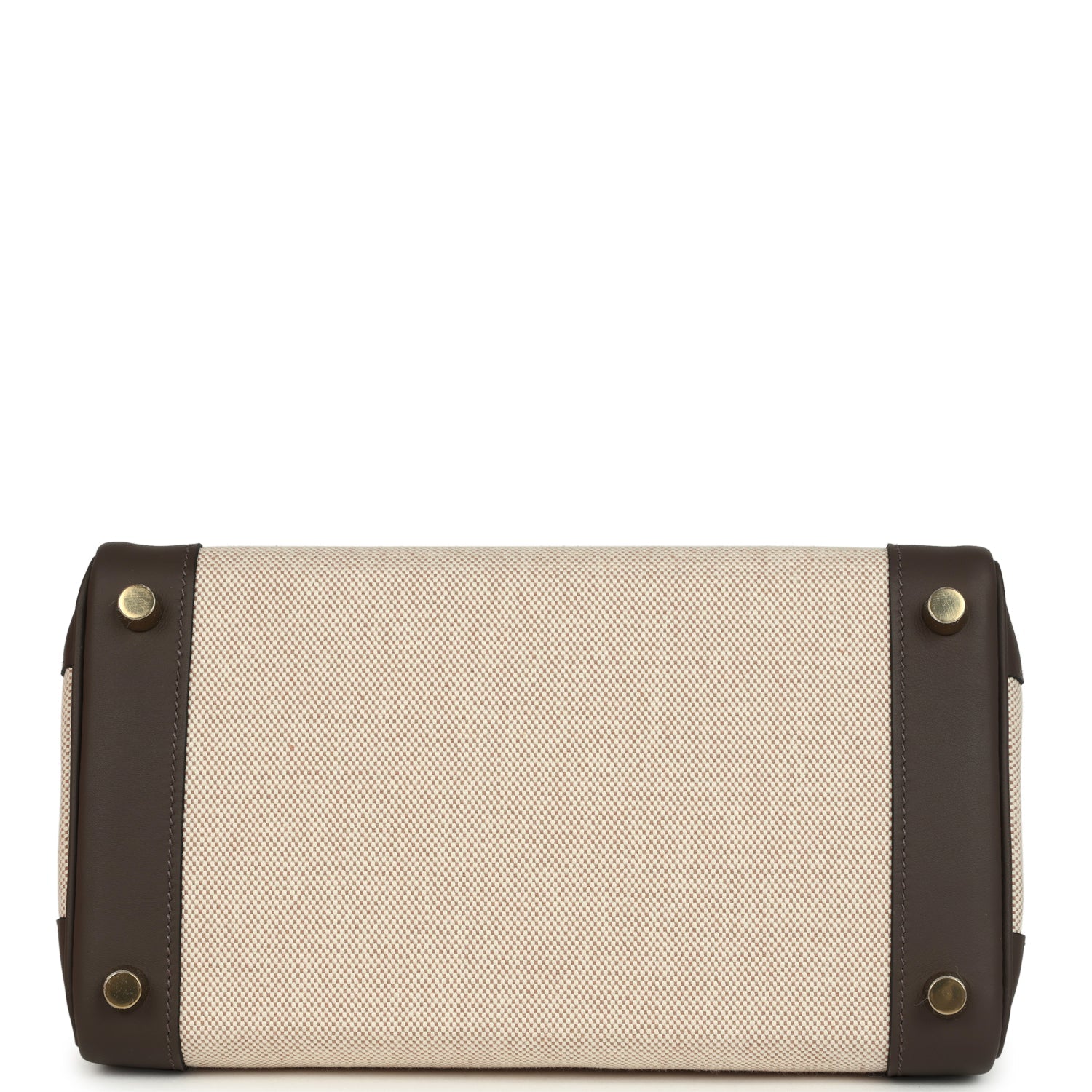 This Birkin is in Ecru-Beige Toile H canvas and Ecorce swift leather with permabrass hardware and has tonal stitching. front flap. two straps with center toggle closure. clochette with lock and two keys. and double rolled handles.