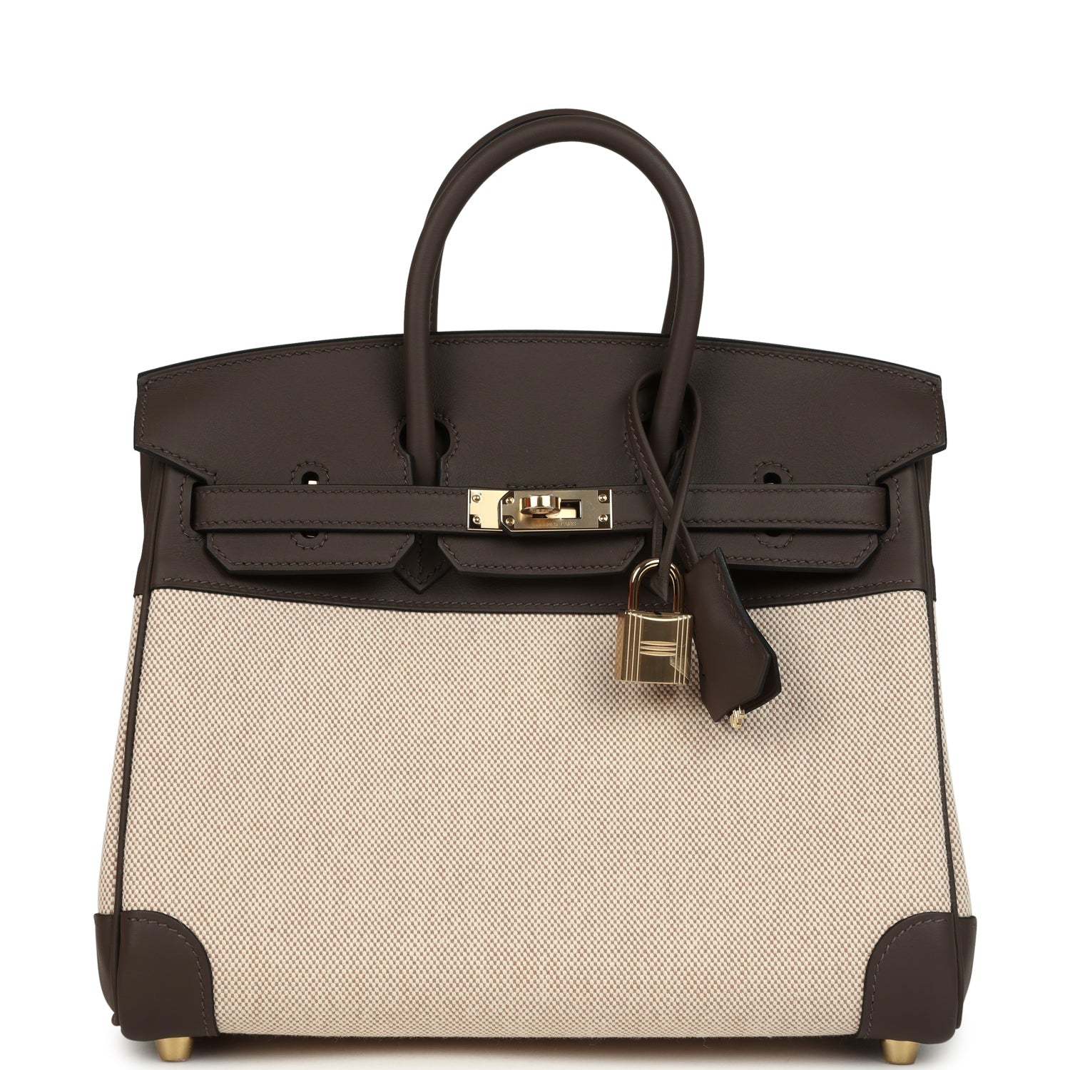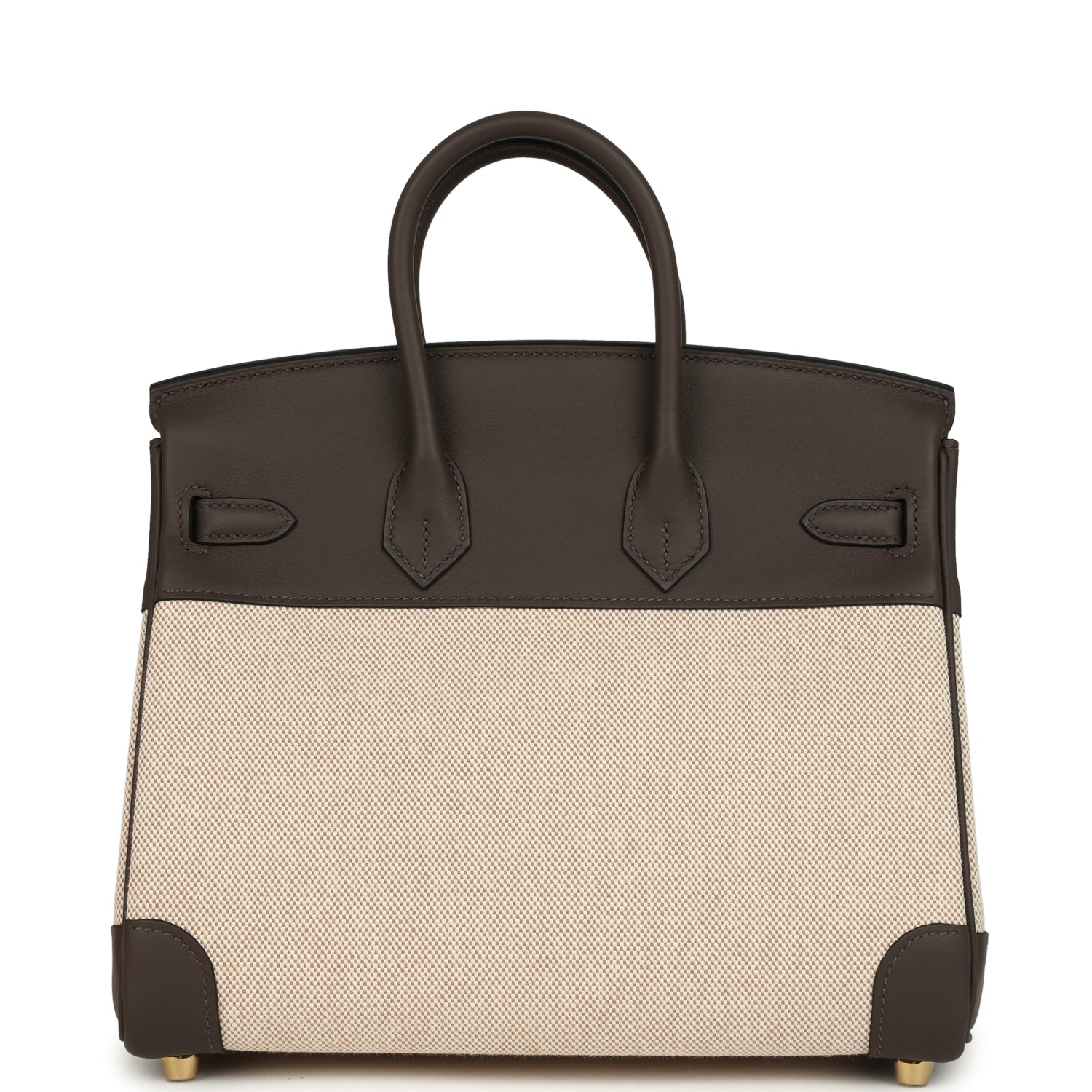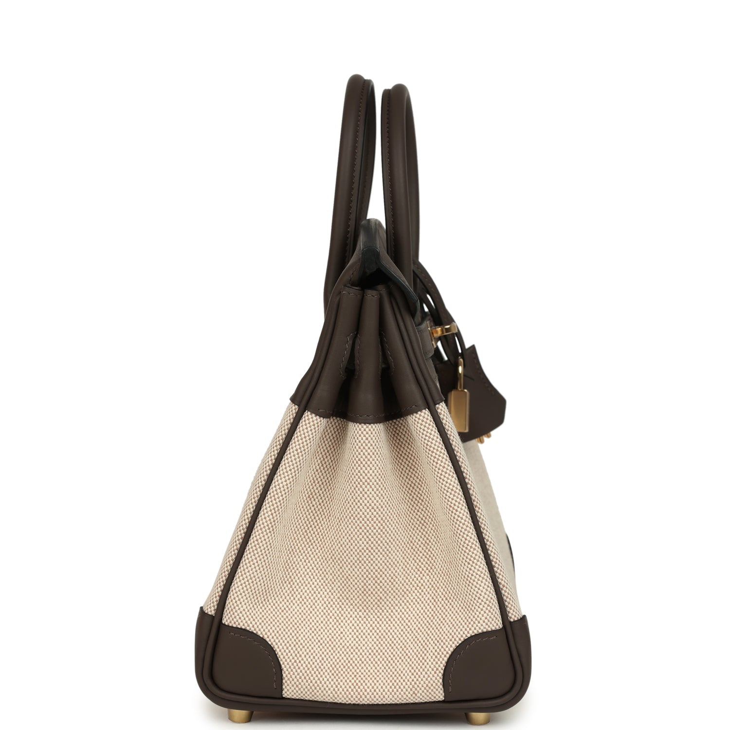 This Birkin is in Ecru-Beige Toile H canvas and Ecorce swift leather with permabrass hardware and has tonal stitching. front flap. two straps with center toggle closure. clochette with lock and two keys. and double rolled handles.