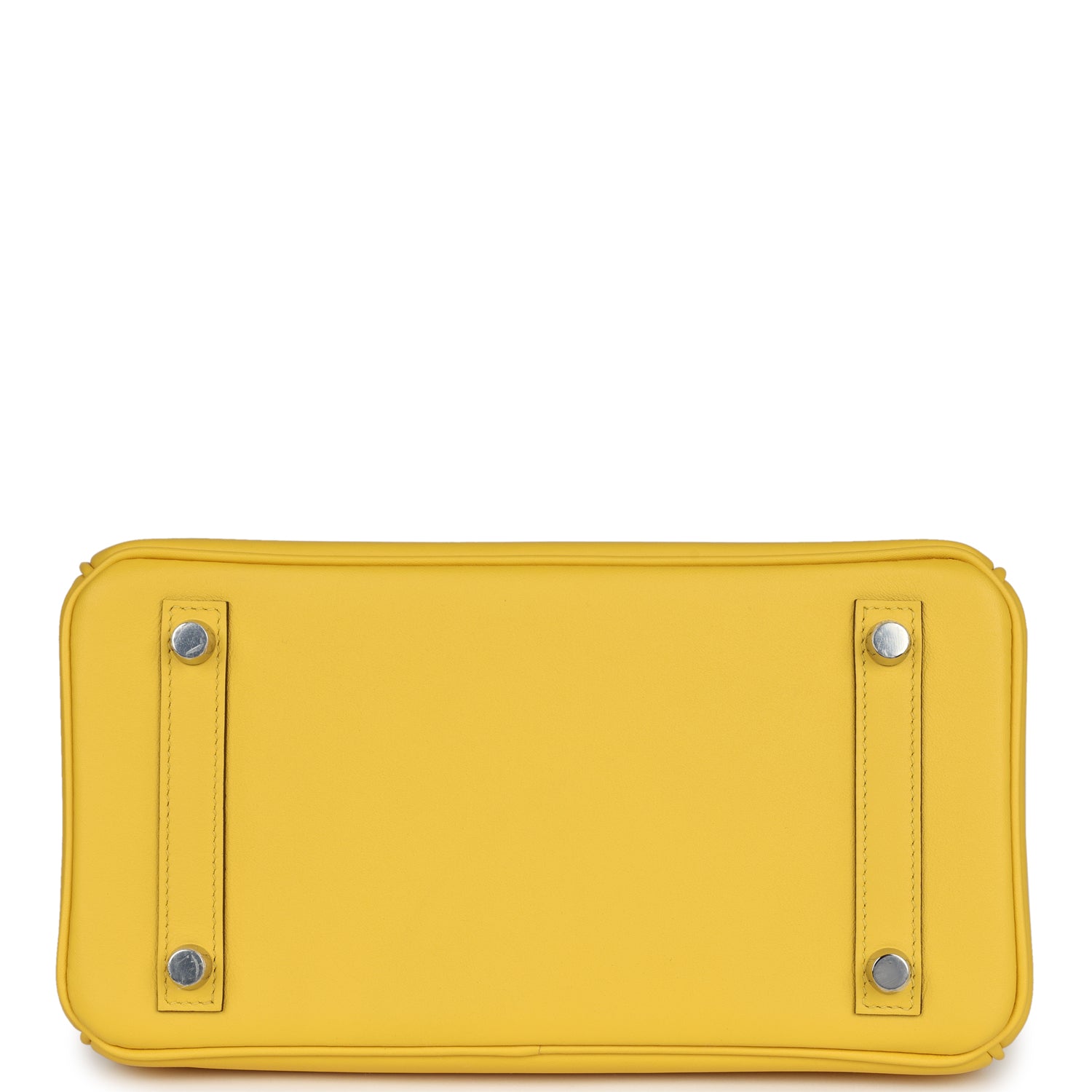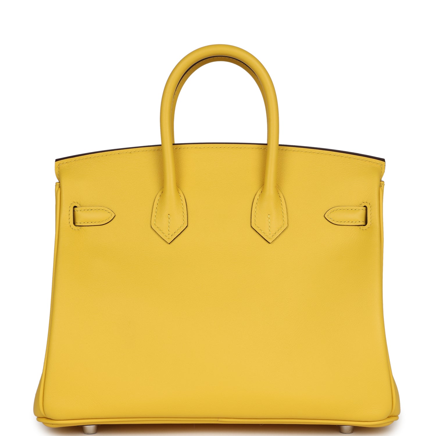 This Birkin is in Jaune de Naples swift leather with palladium hardware and has tonal stitching. front flap. two straps with center toggle closure. clochette with lock and two keys. and double rolled handles.