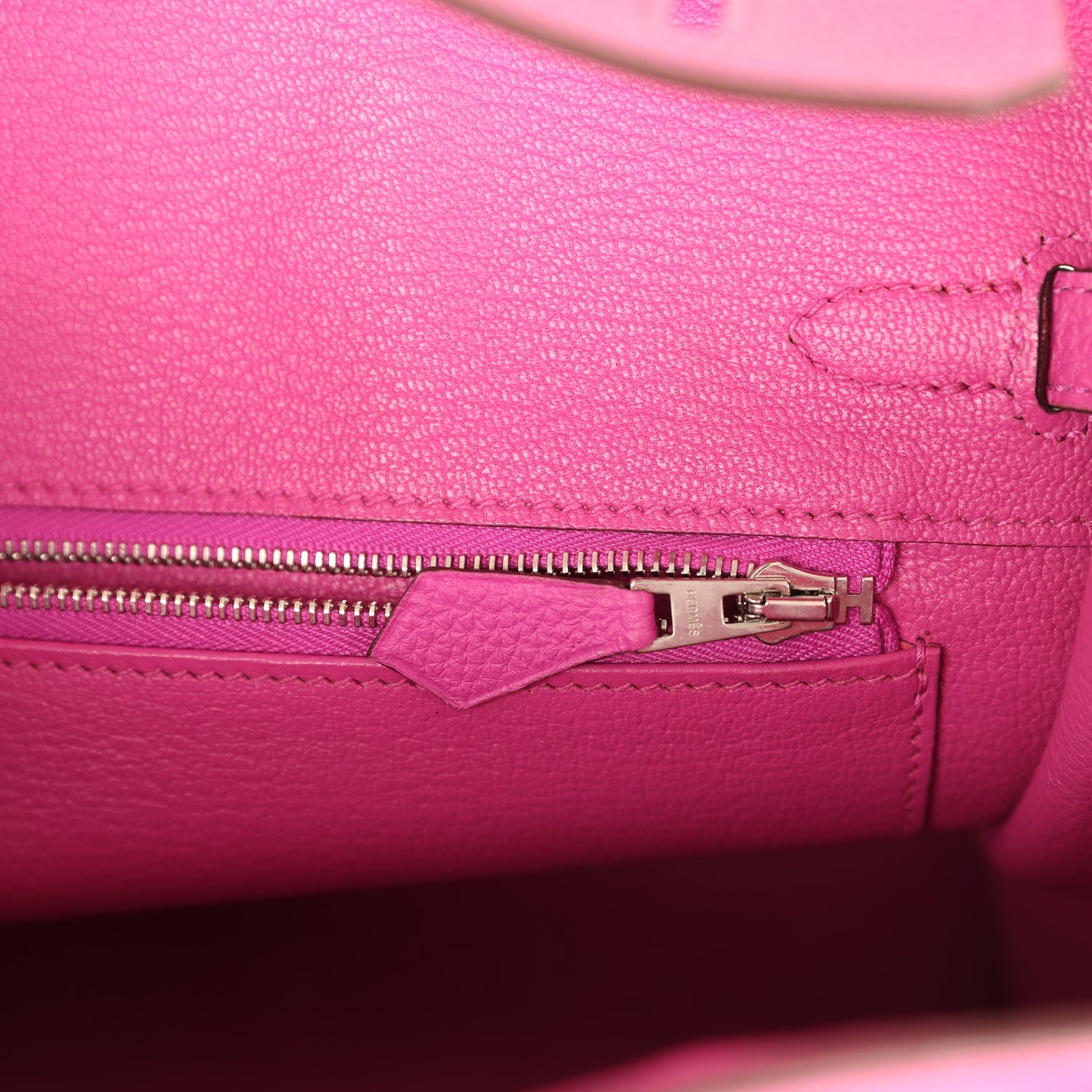 The interior is lined with Magnolia chevre leather and has a zip pocket with an Hermes engraved zipper pull and an open pocket on the opposite side.