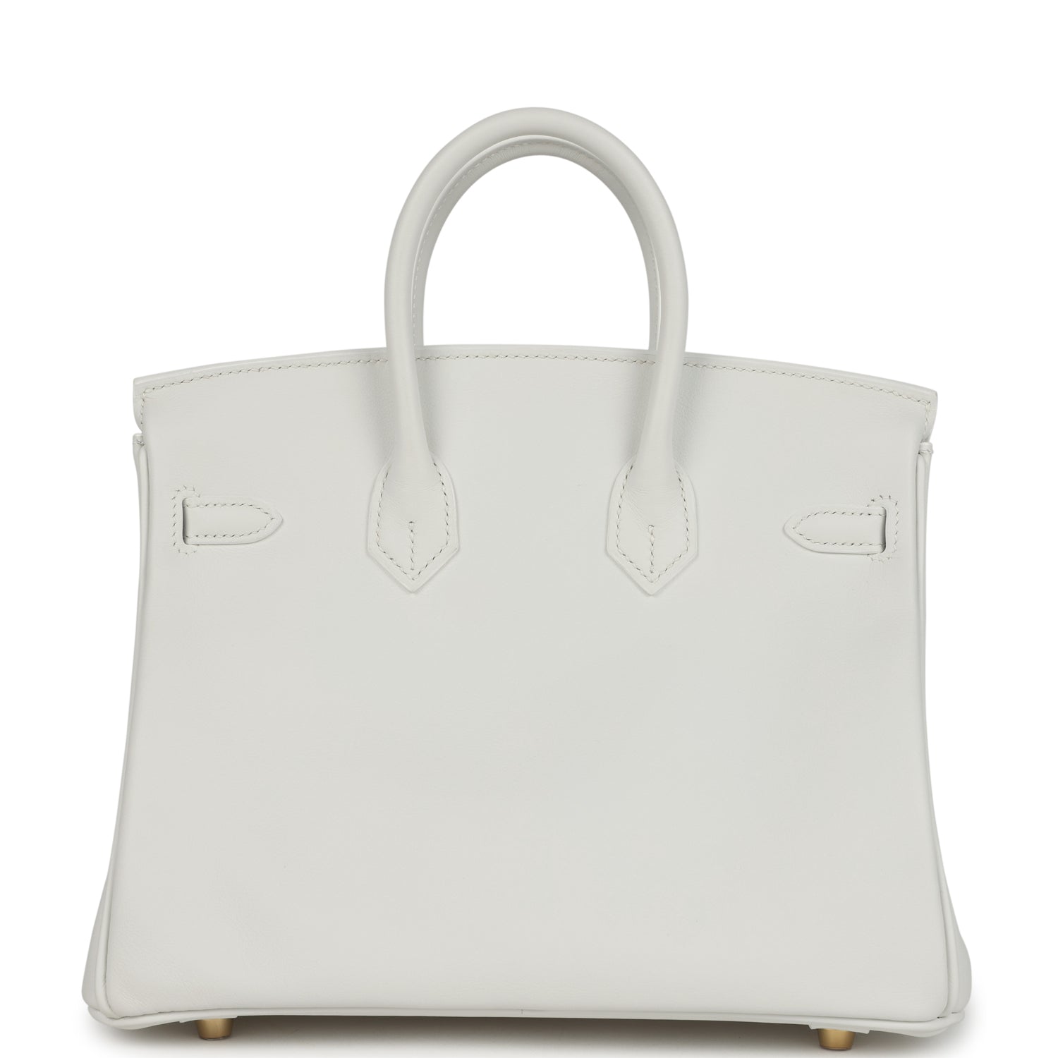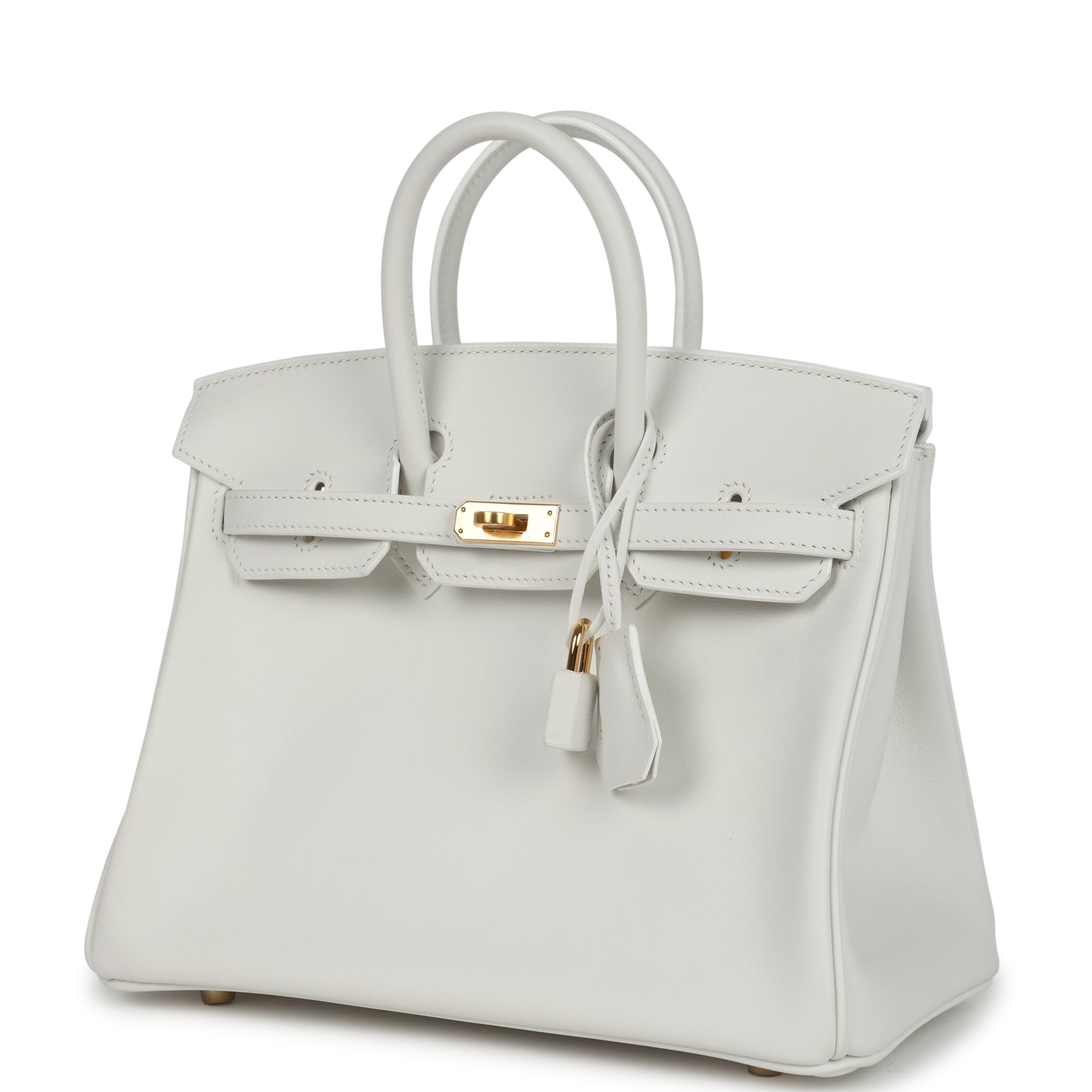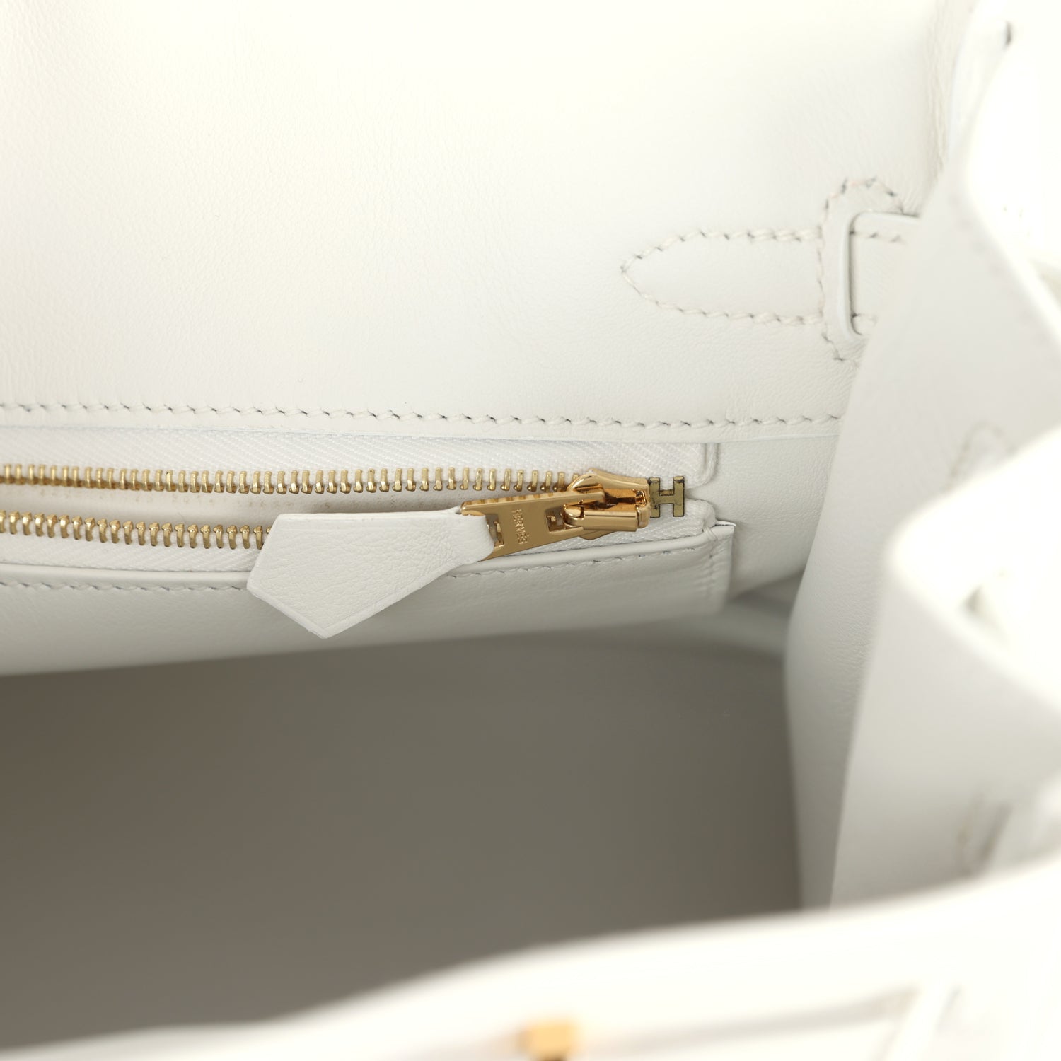 This Birkin is in New White swift leather with gold hardware and has tonal stitching. two straps with front toggle closure. clochette with lock and two keys and double rolled handles.