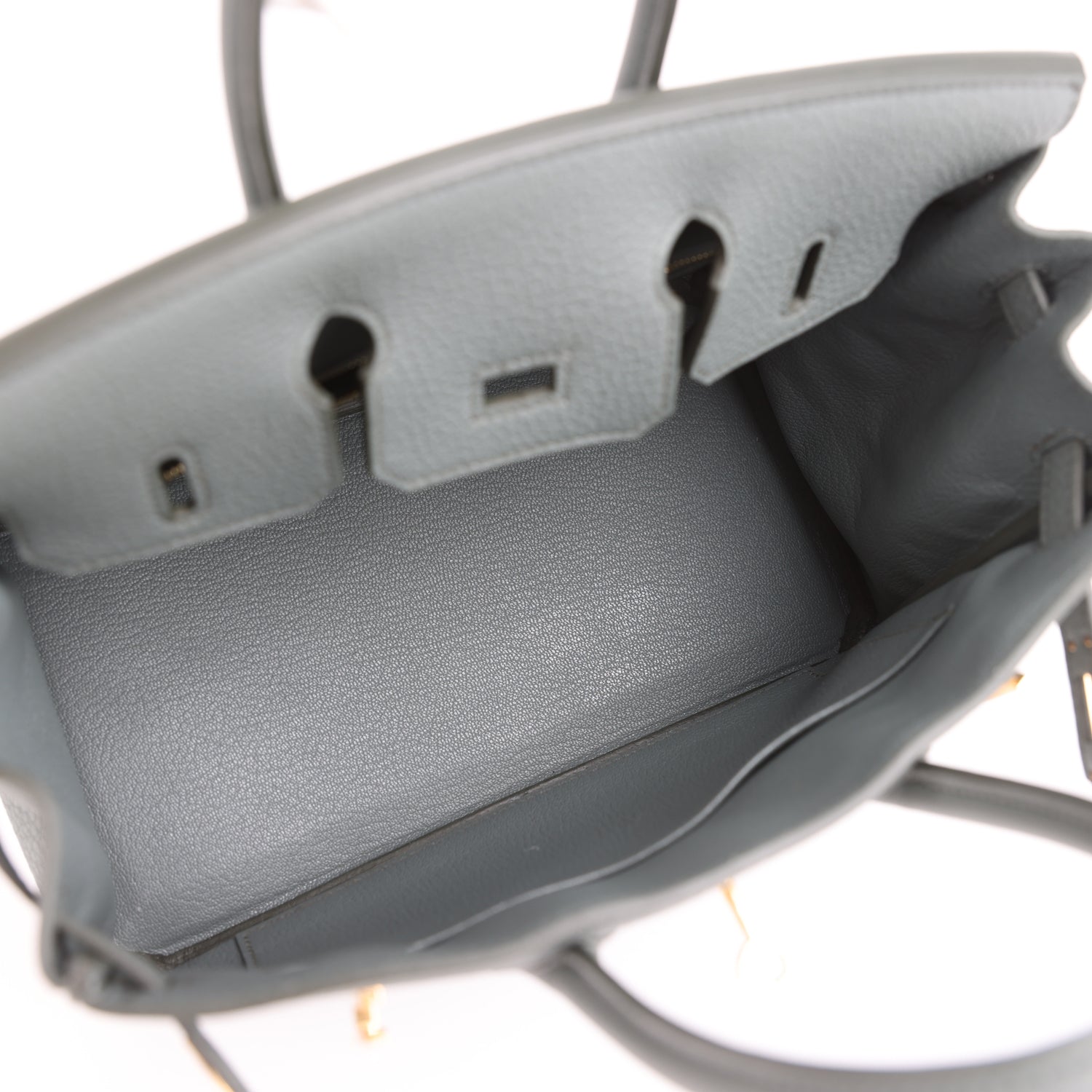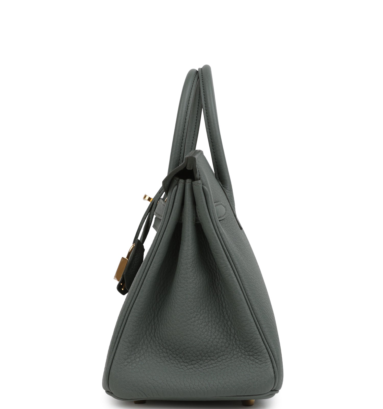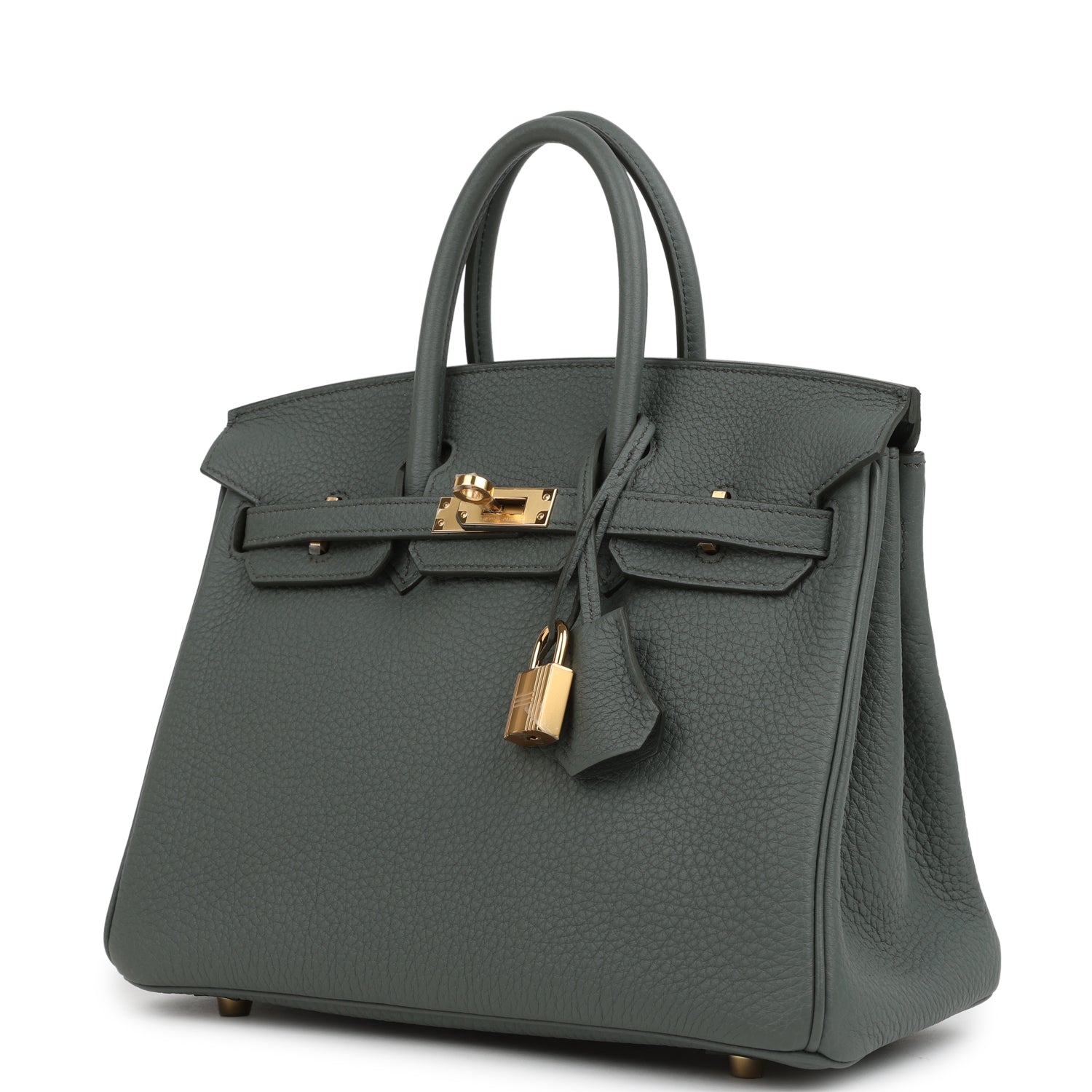 This Birkin is in Vert Amande togo leather with gold hardware. has tonal stitching. front flap. two straps with center toggle closure. clochette with lock and two keys. and double rolled handles.