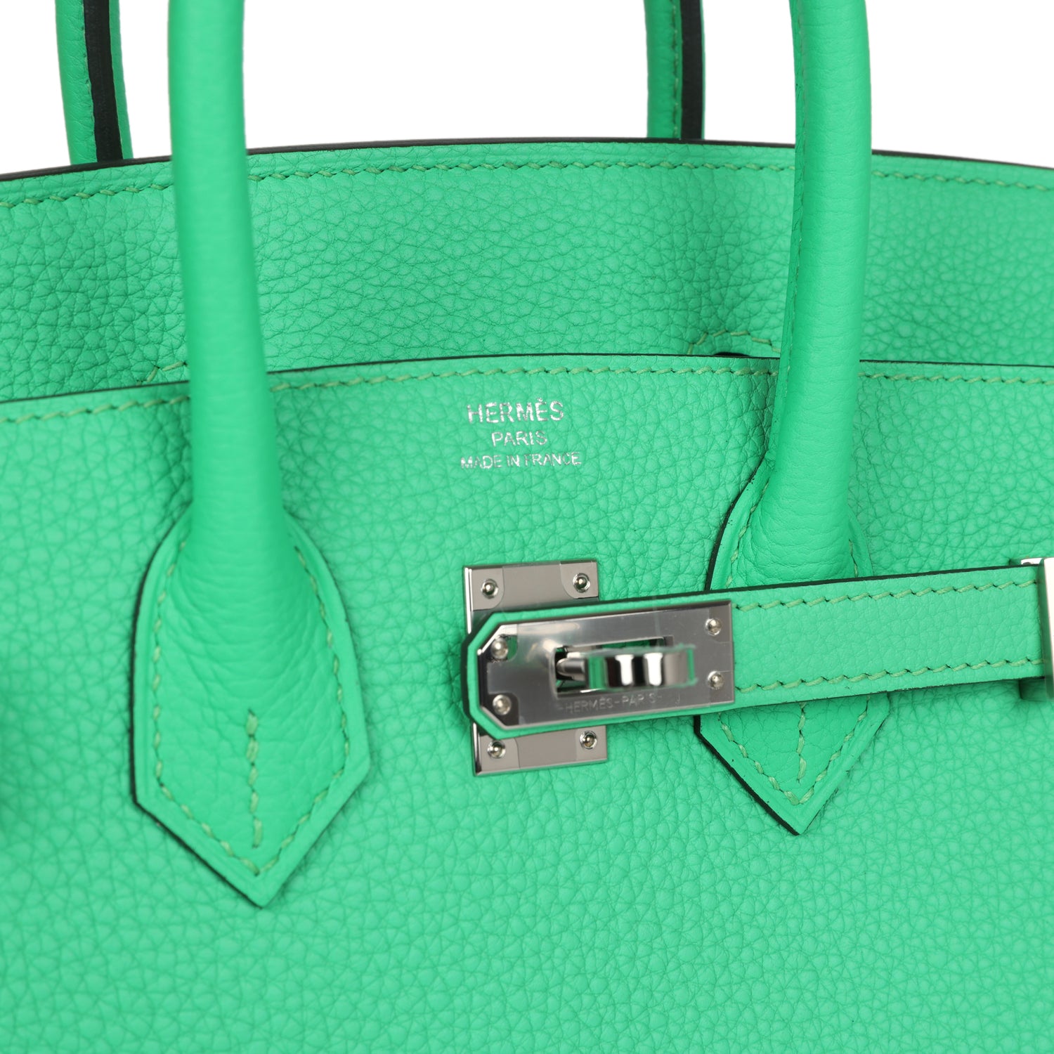 This Birkin is in Vert Comics togo with palladium hardware. tonal stitching. front flap with two straps. front toggle closure. clochette with lock and two keys. and double rolled handles.