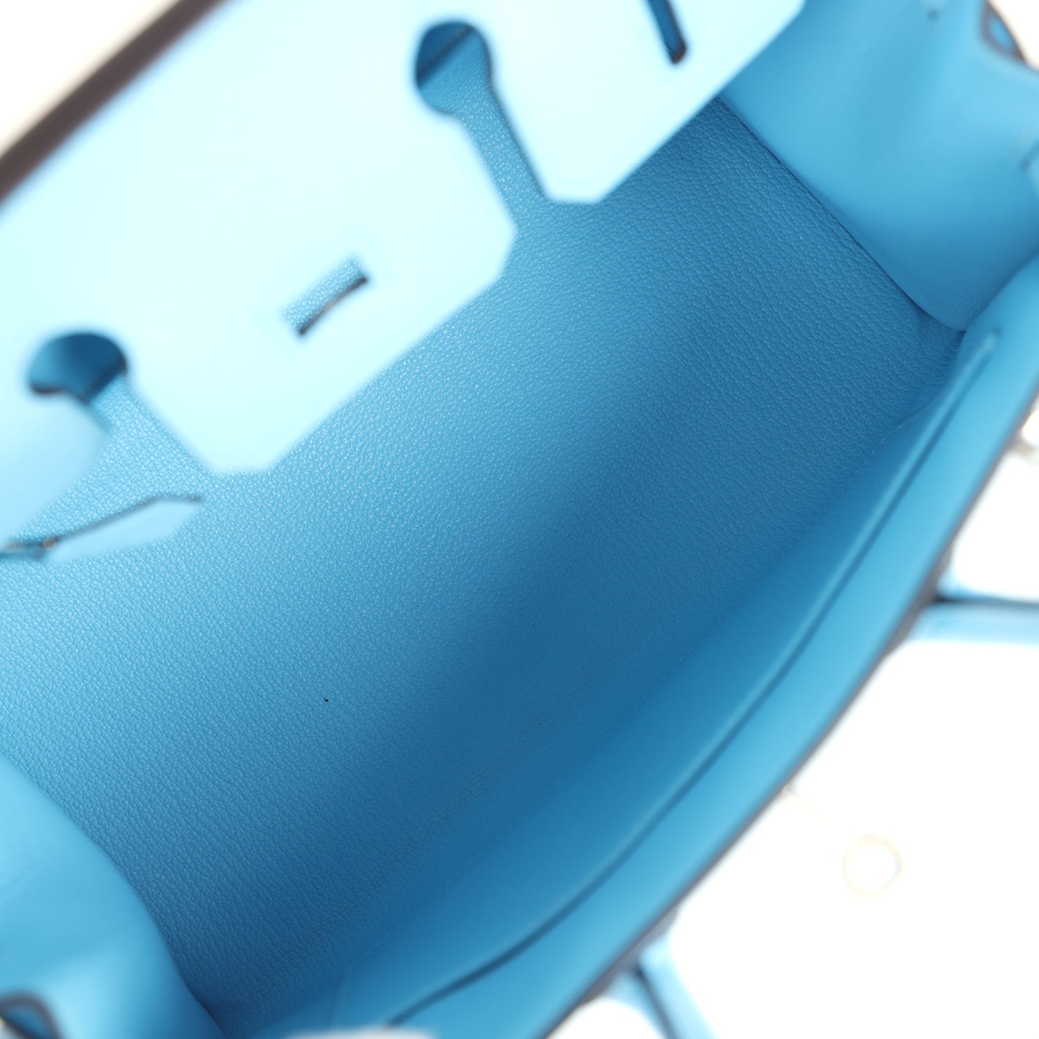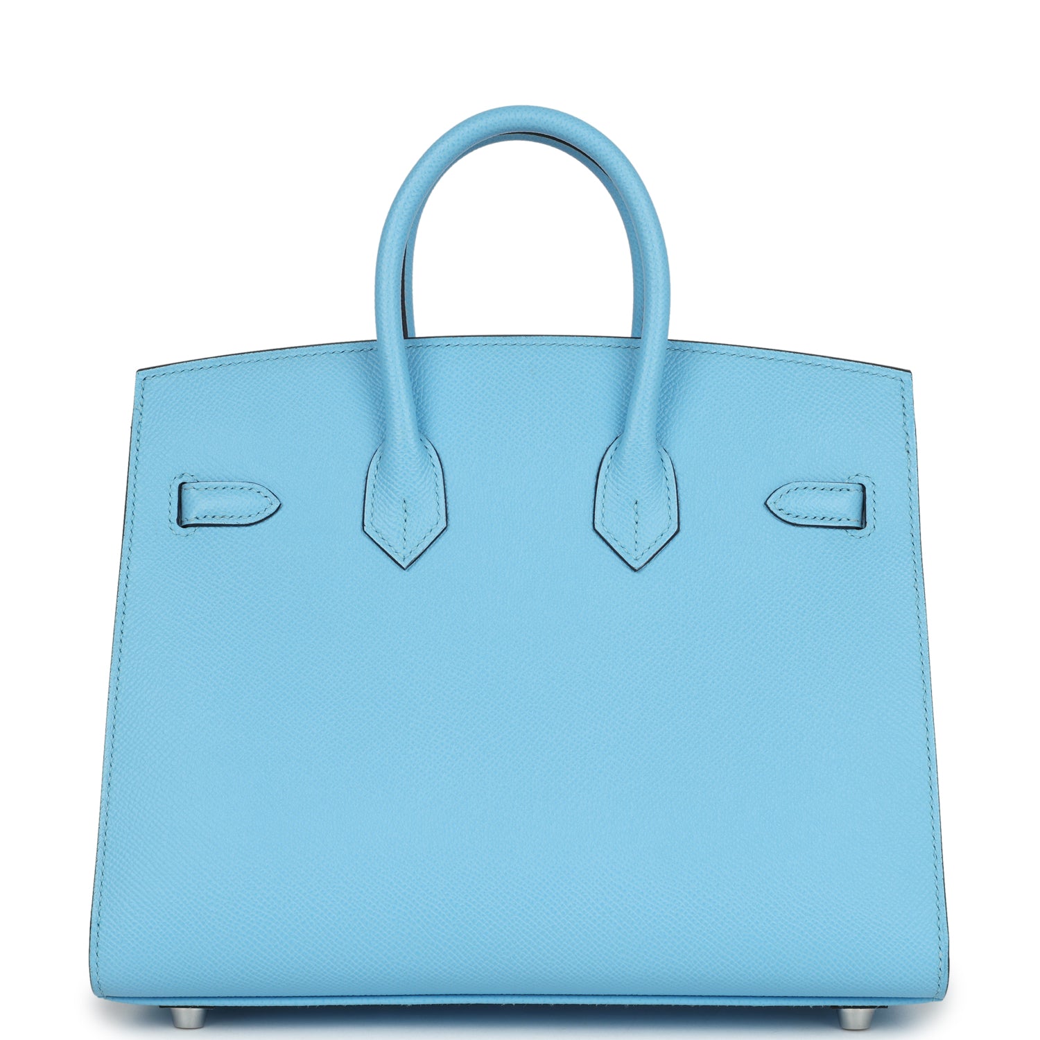 This Birkin. in the Sellier style. is in Celeste epsom leather with palladium hardware. tonal stitching. front flap with two straps. front toggle closure. clochette with lock and two keys. and double rolled handles.