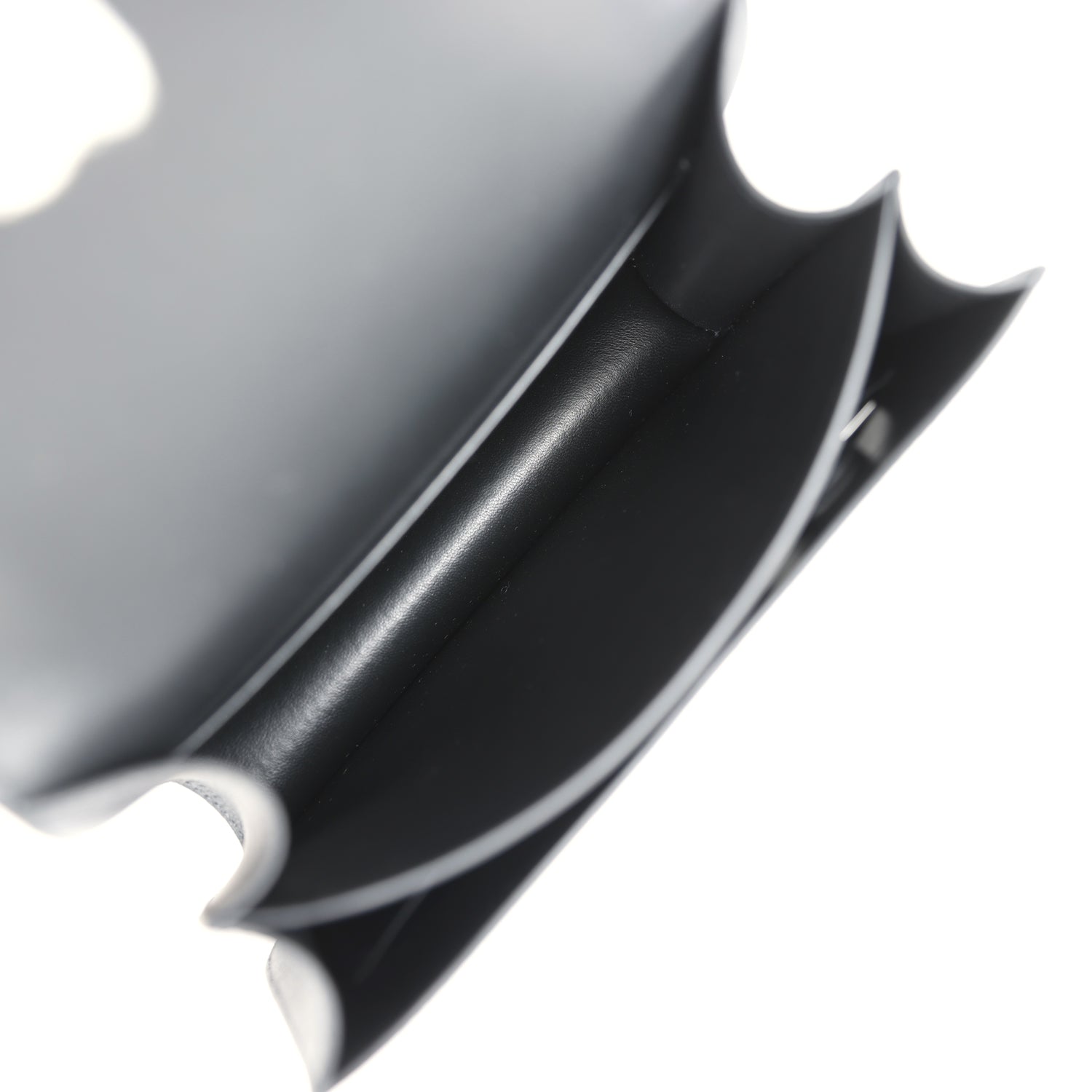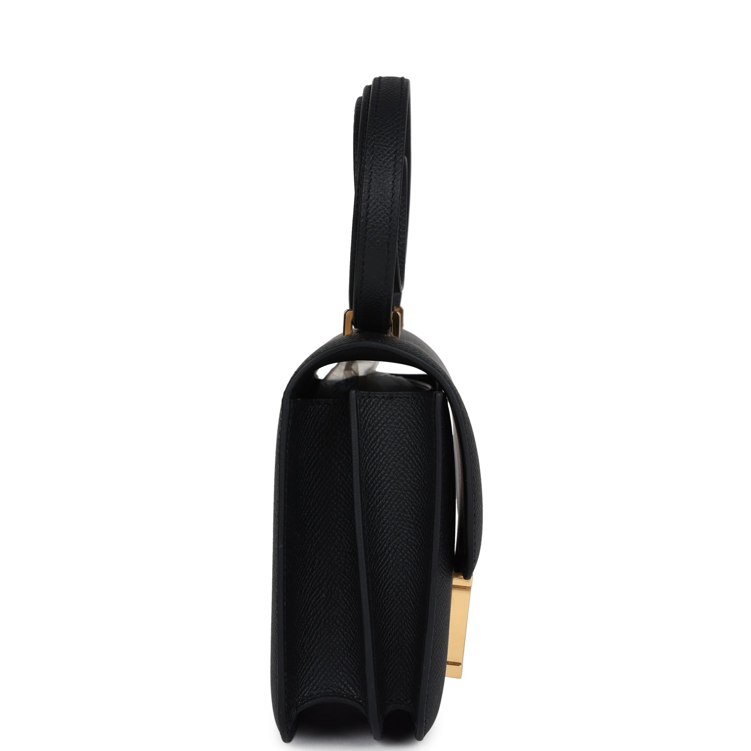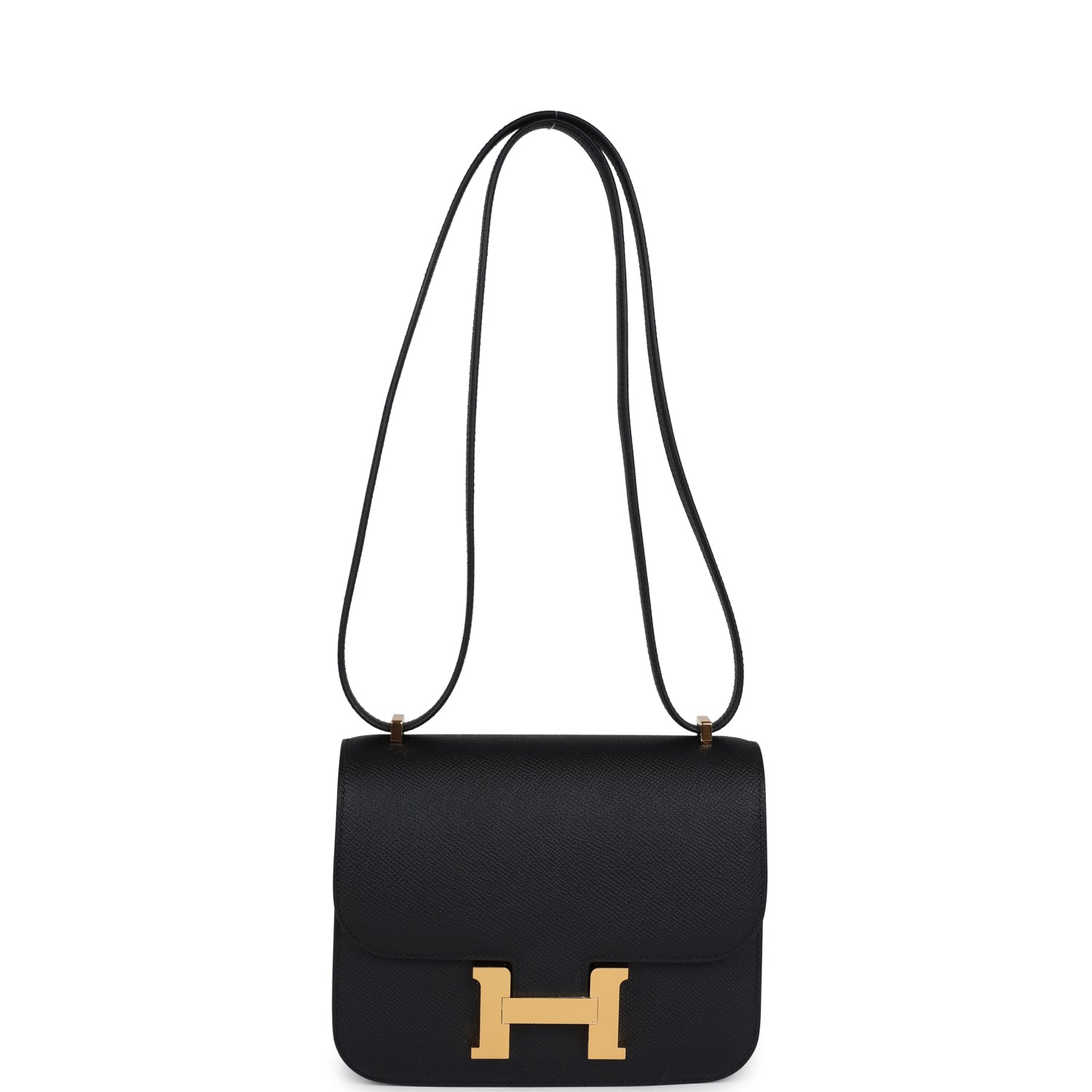 This Constance 1-18 is in Black epsom leather with gold hardware and has tonal stitching. a metal "H" snap lock closure and adjustable shoulder strap.