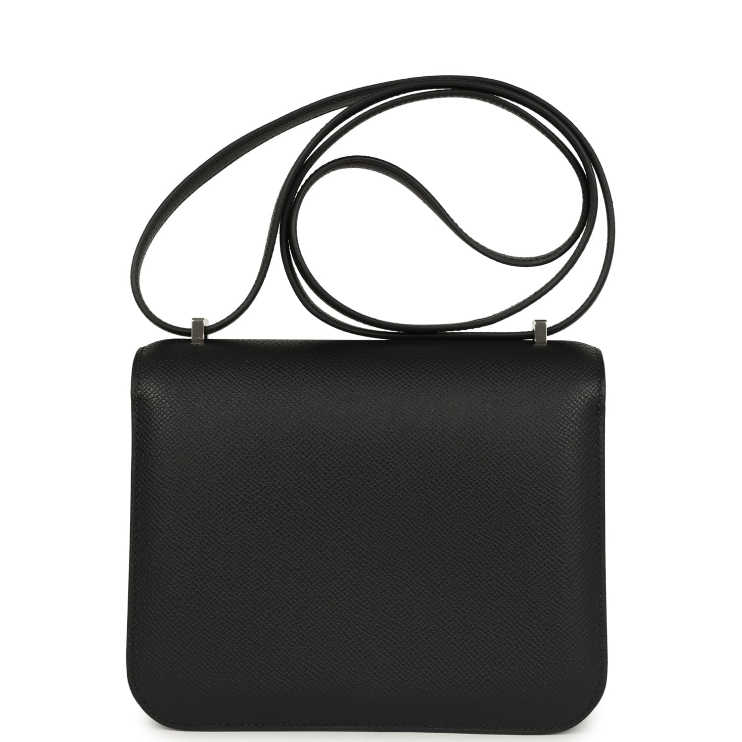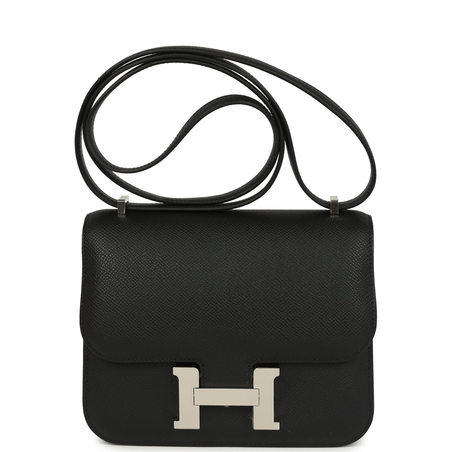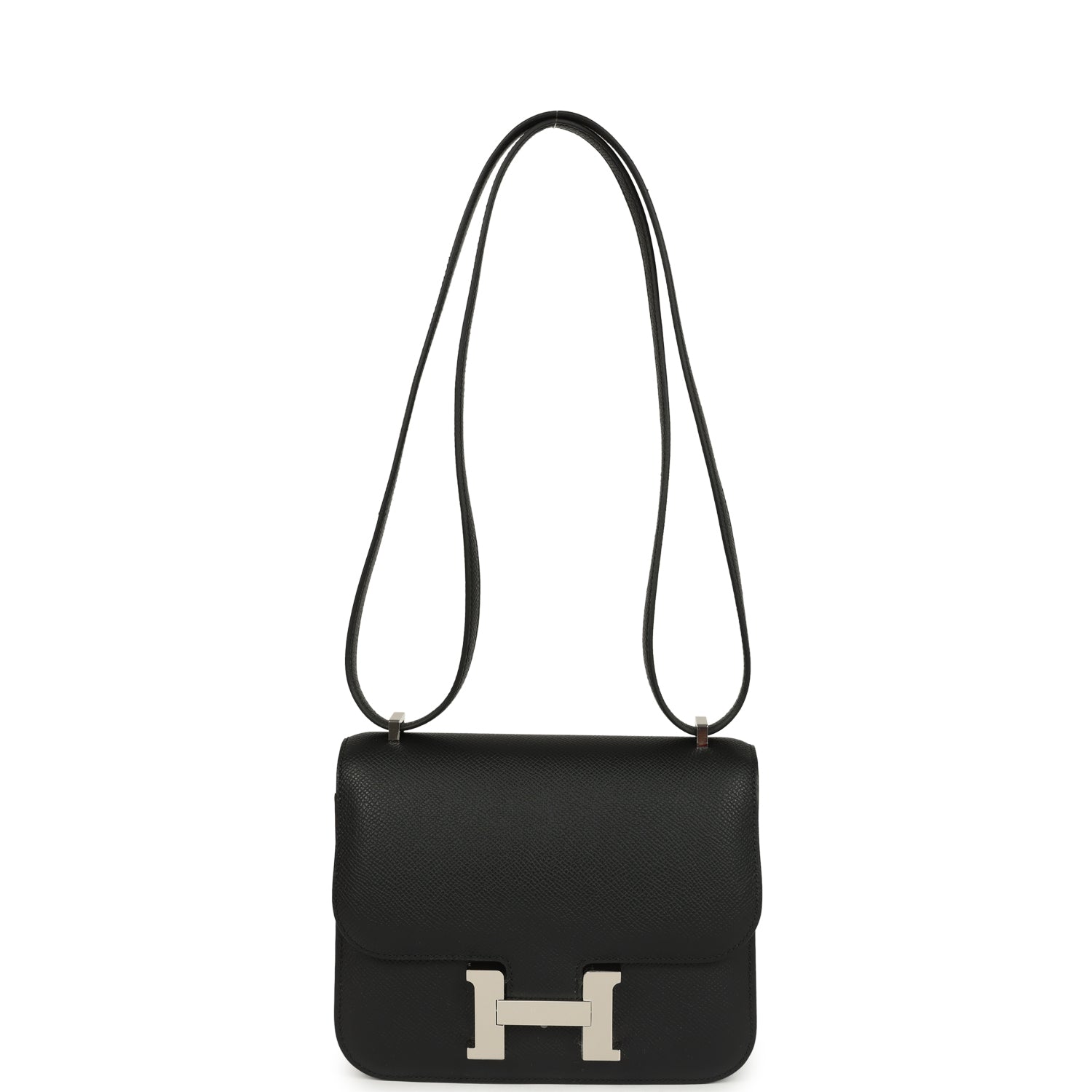 This Constance 1-18 is in Black epsom leather with palladium hardware and has tonal stitching. a metal "H" snap lock closure and adjustable shoulder strap.