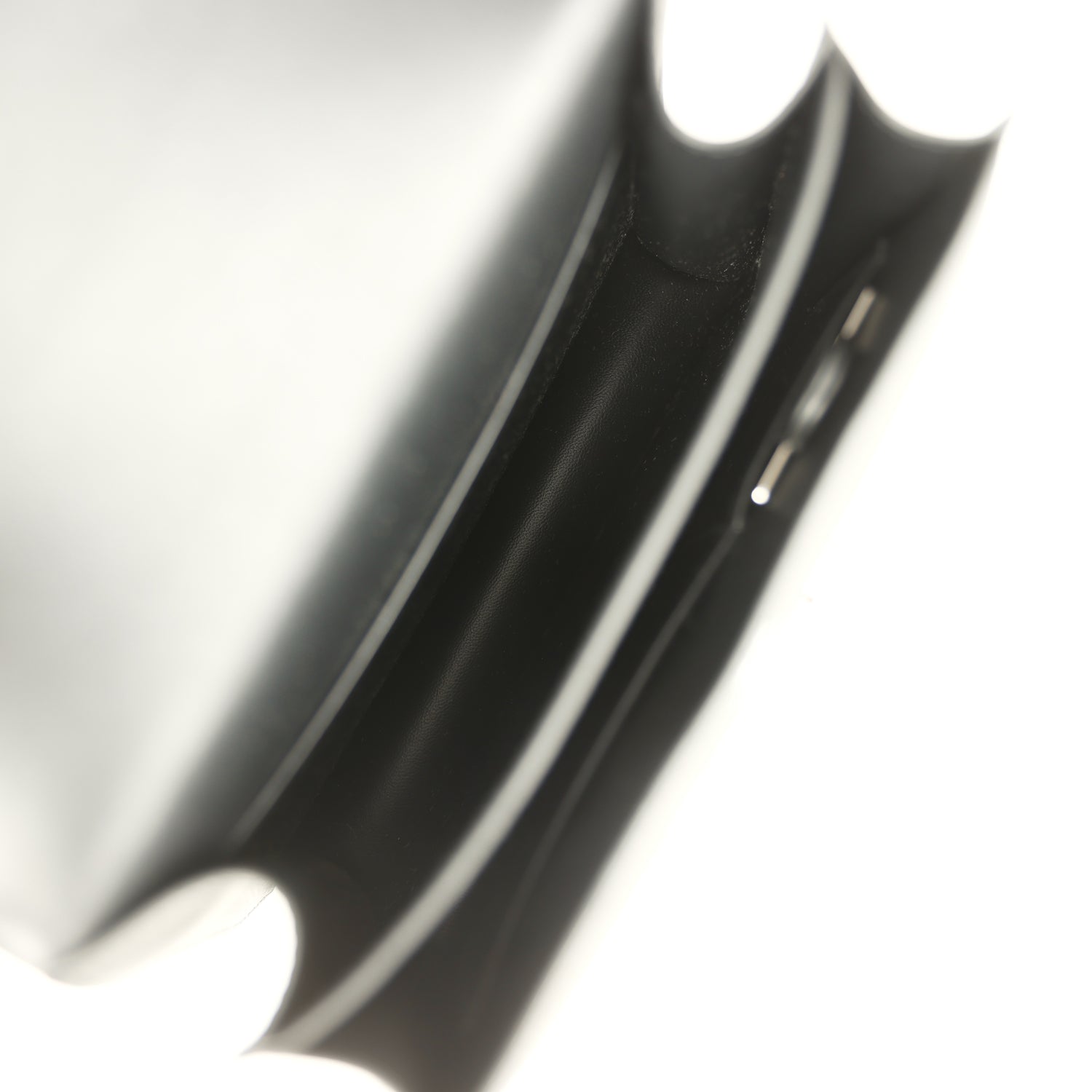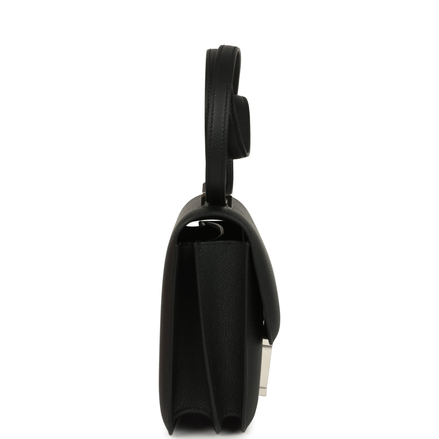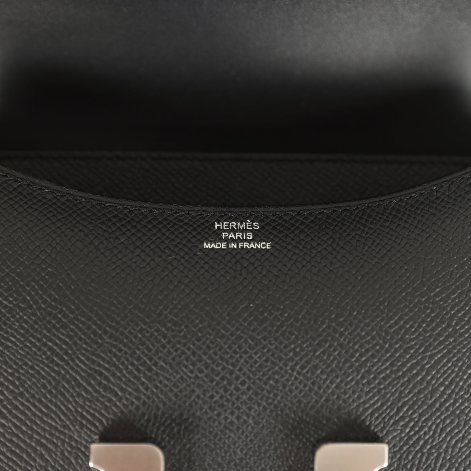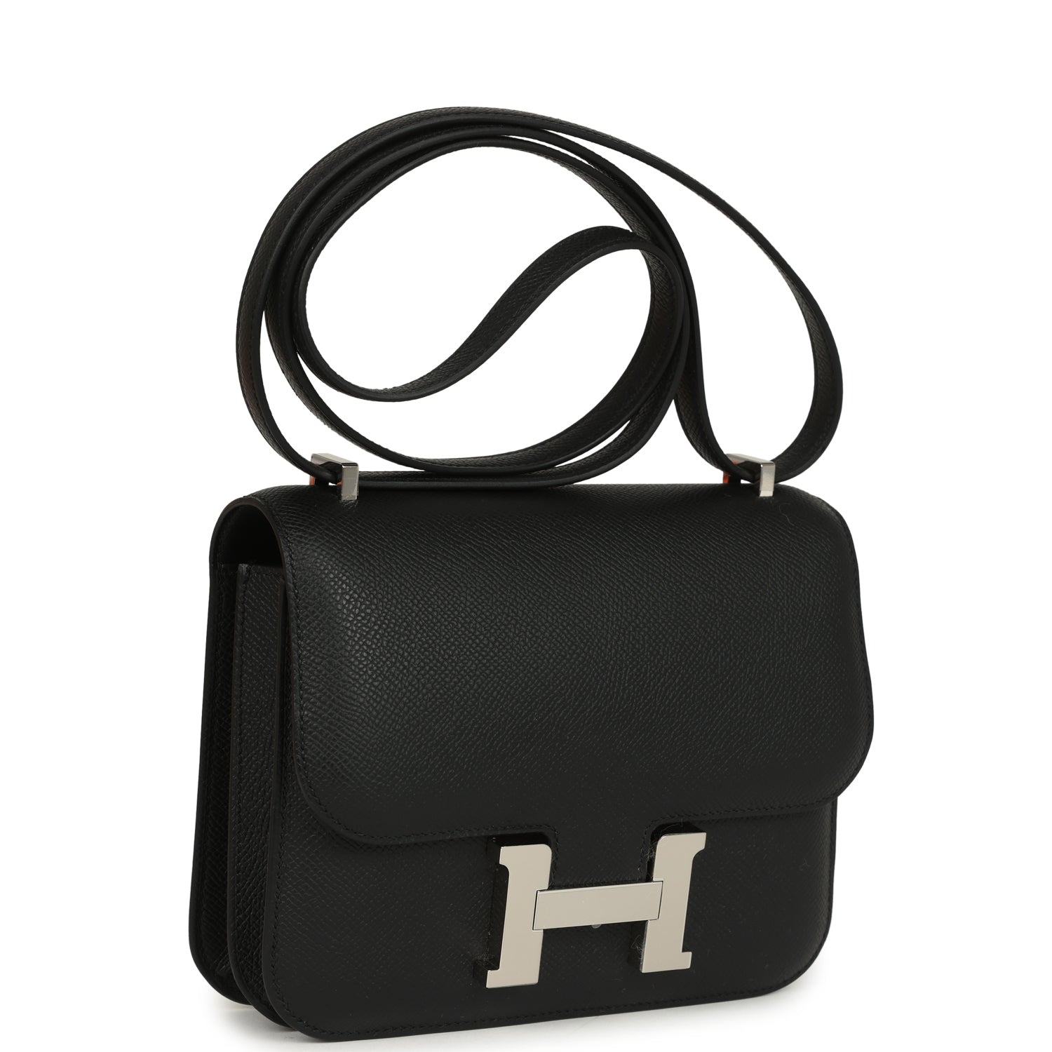 This Constance 1-18 is in Black epsom leather with palladium hardware and has tonal stitching. a metal "H" snap lock closure and adjustable shoulder strap.