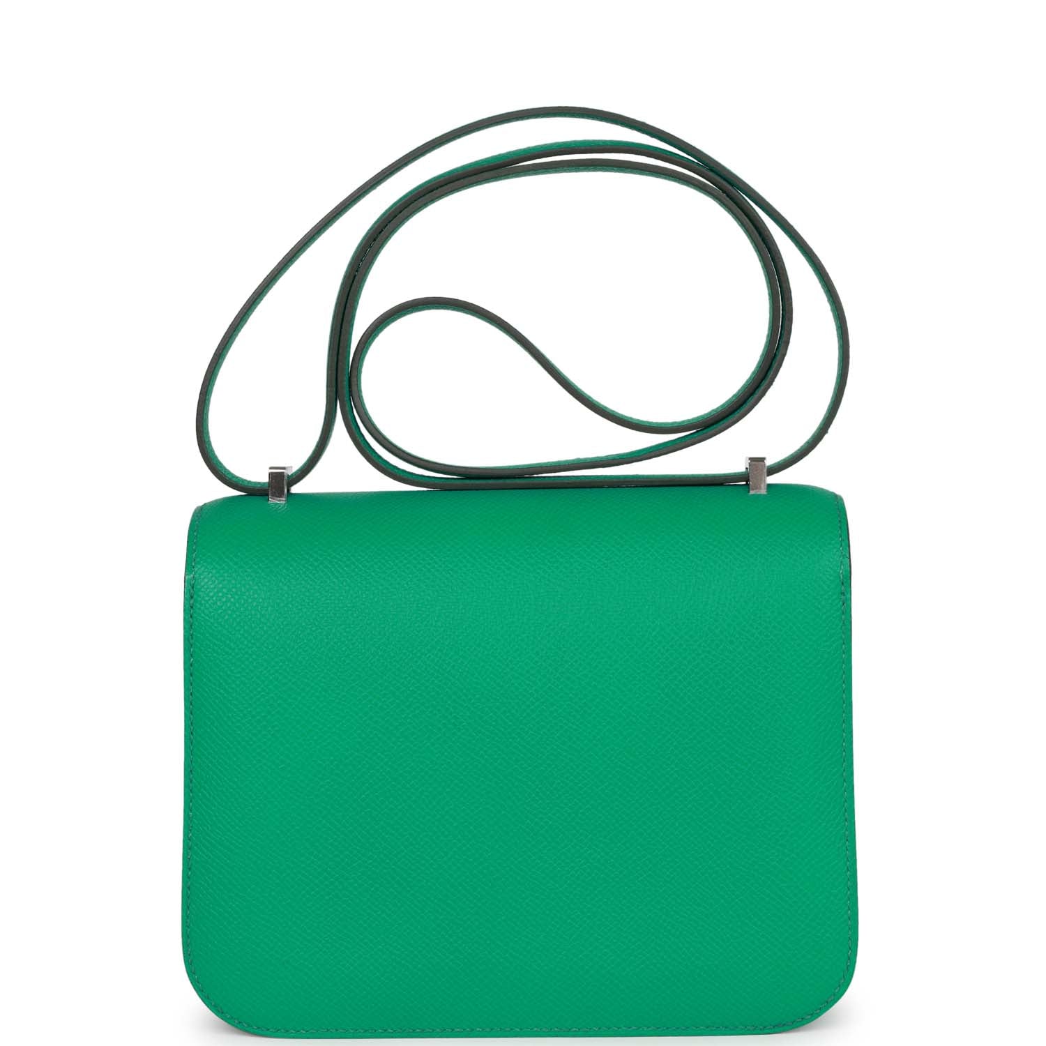 This Constance is in Vert Jade epsom leather with palladium hardware. has tonal stitching. a metal "H" snap lock closure and adjustable shoulder strap.
