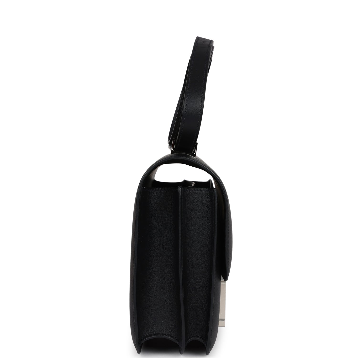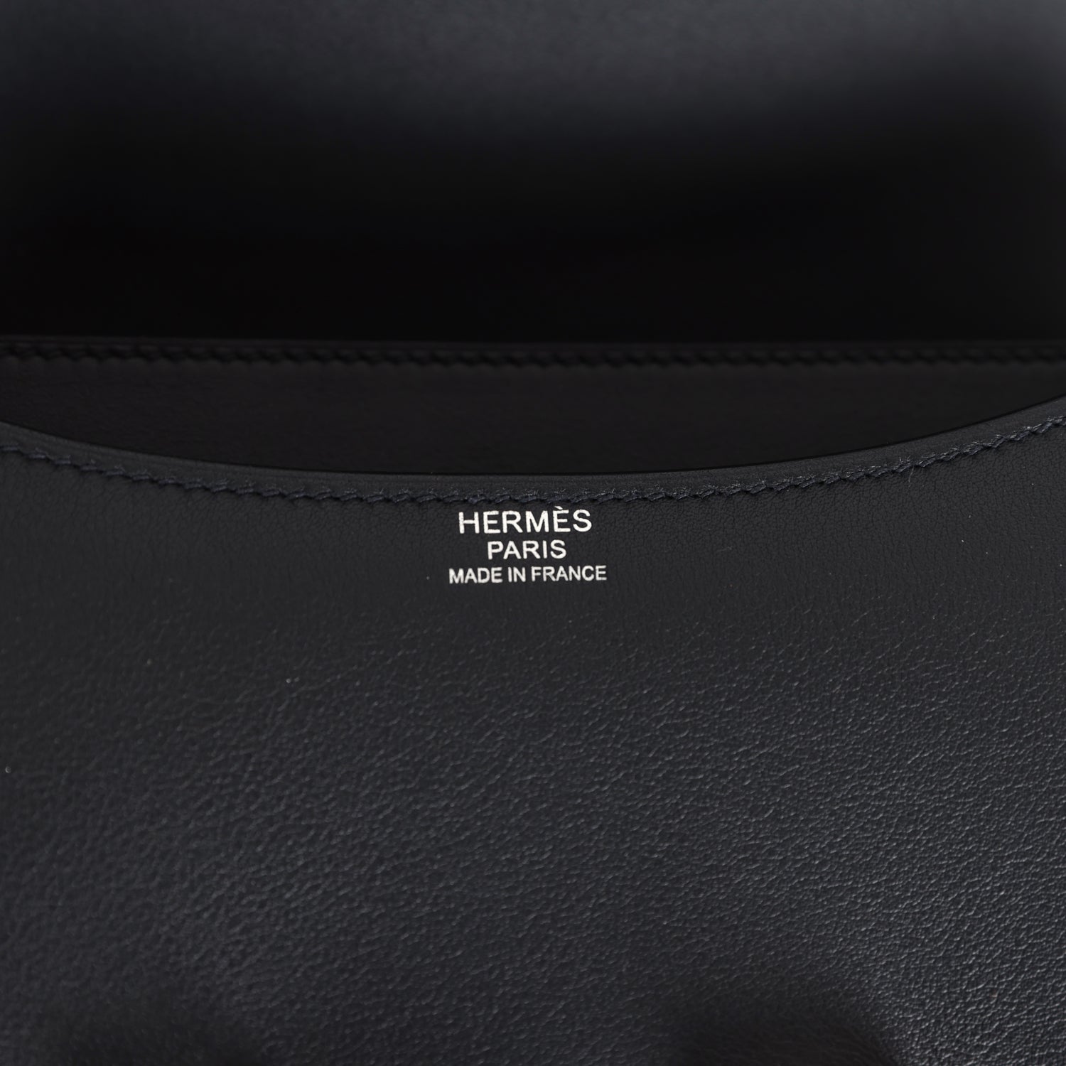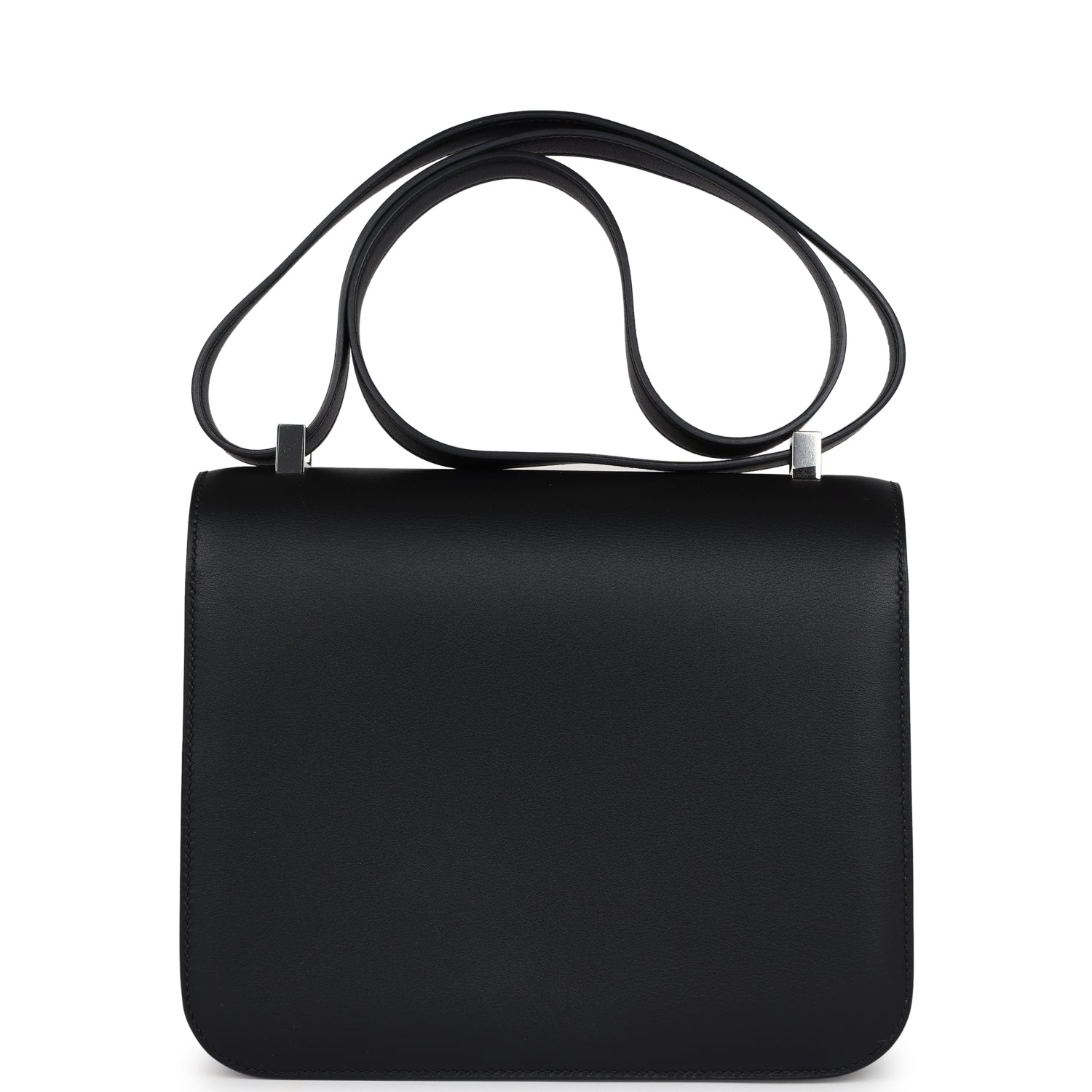This Constance. is in Black swift leather with palladium hardware and features tonal stitching. a multicolored marble "H" snap lock closure. and an adjustable shoulder strap.
