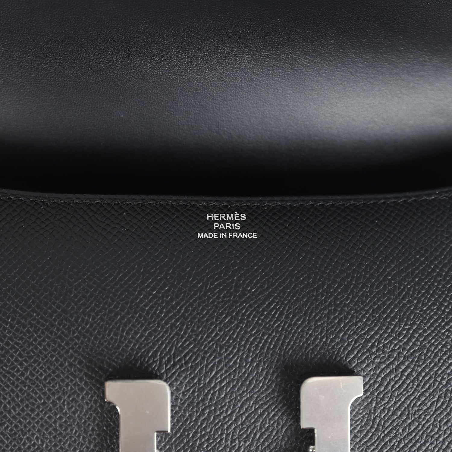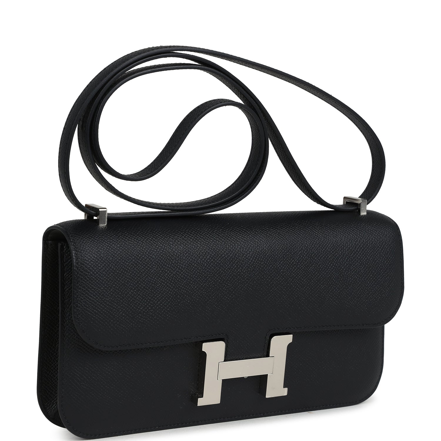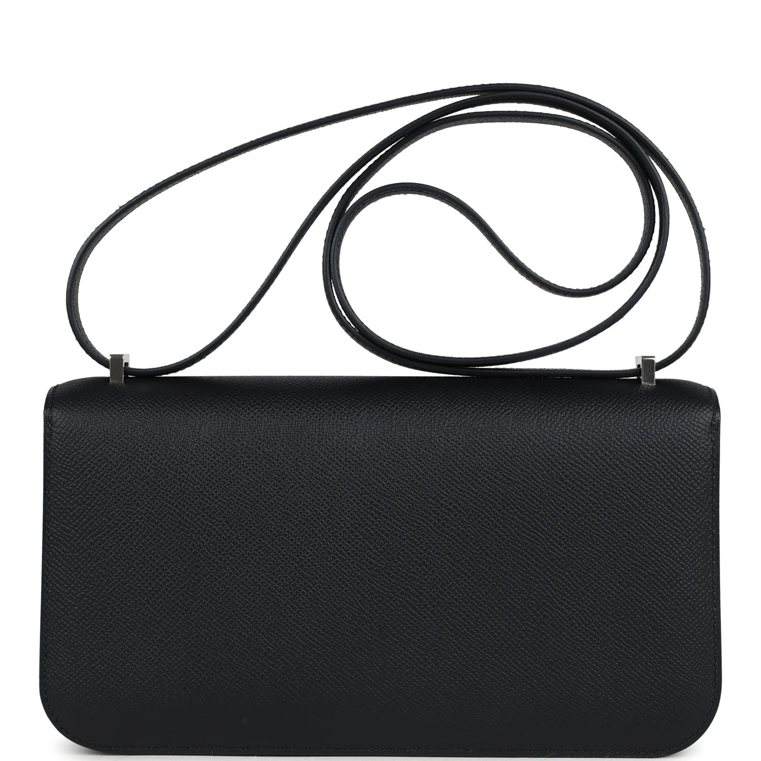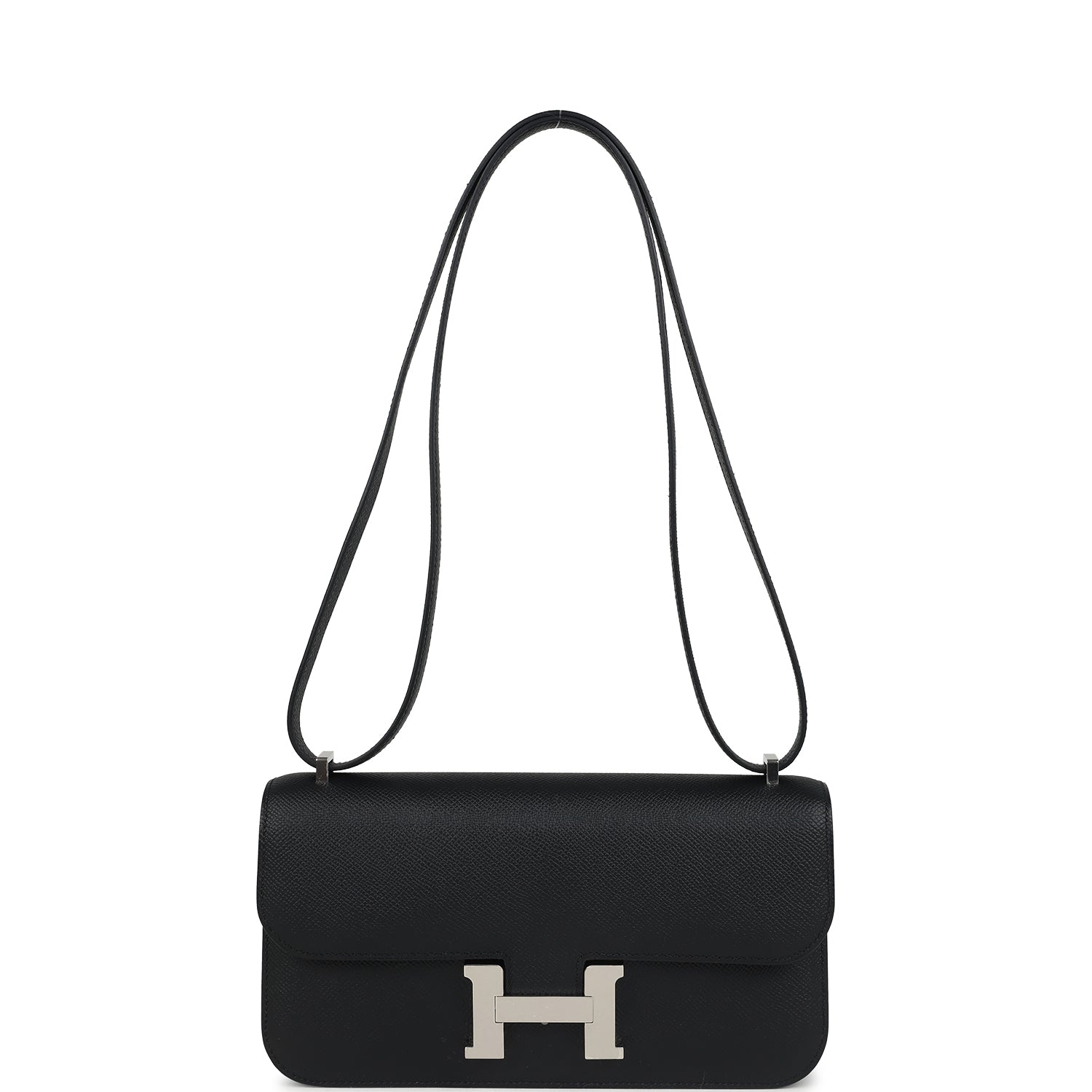 This Hermes Constance 1-Elan is in Black epsom leather with palladium hardware. featuring tonal stitching. metal "H" snap closure. and an adjustable strap.