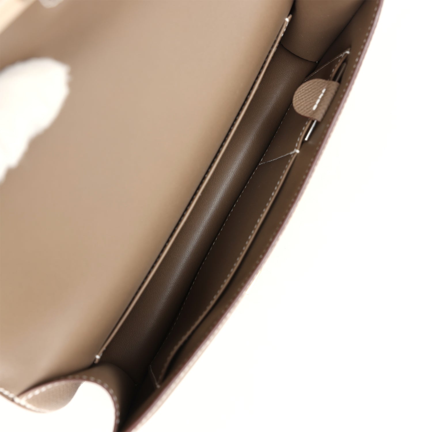 The interior is lined in Etoupe lambskin leather and has two open pockets on the front wall. a removable mirror. and a slit pocket on the back wall.