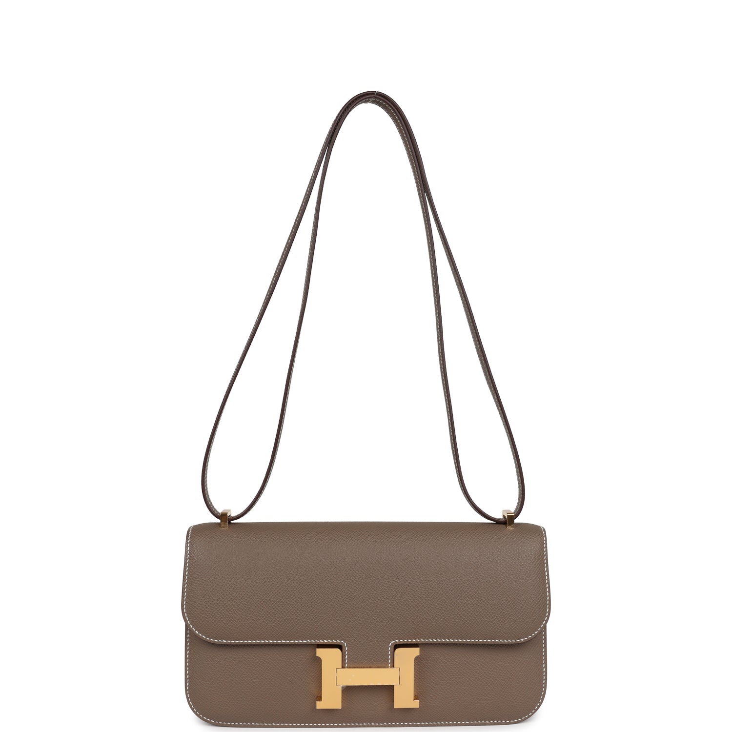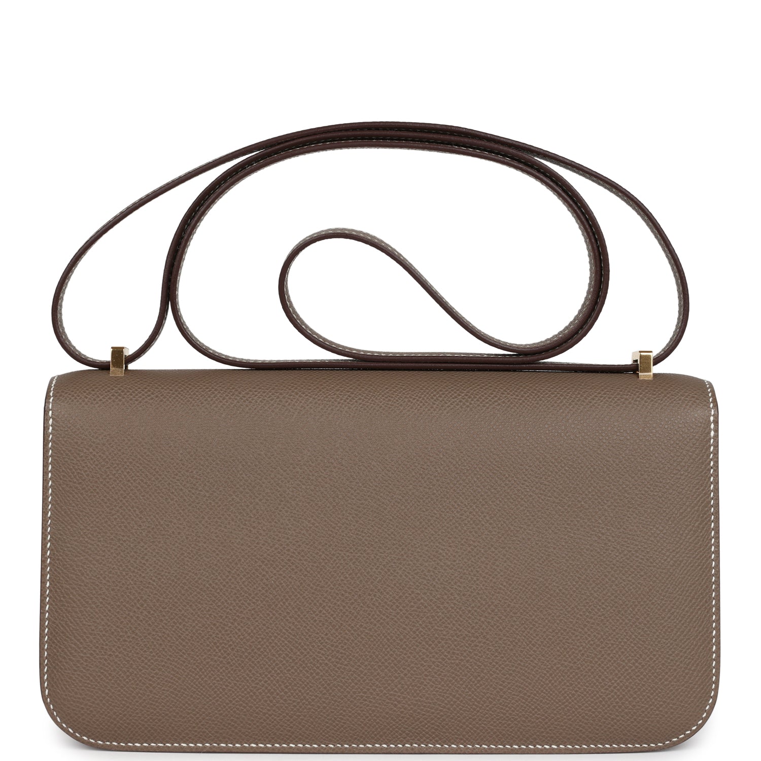 This Hermes Constance 1-Elan is in Etoupe Epsom leather with gold hardware. featuring contrast stitching. metal "H" snap closure. and an adjustable strap.