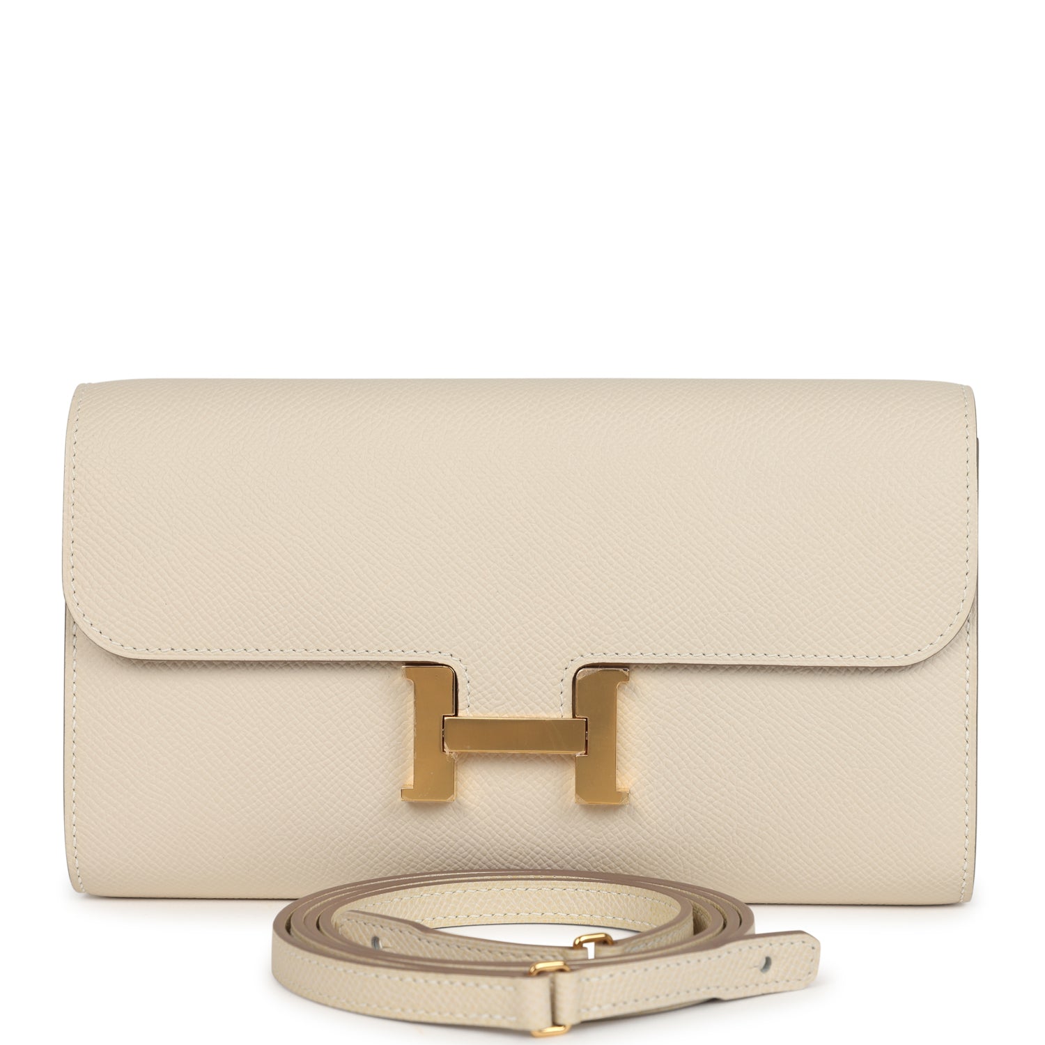 This Constance Wallet To Go is in Craie epsom leather with gold hardware and has tonal stitching. metal "H" snap lock closure. open front compartment and removable crossbody strap.