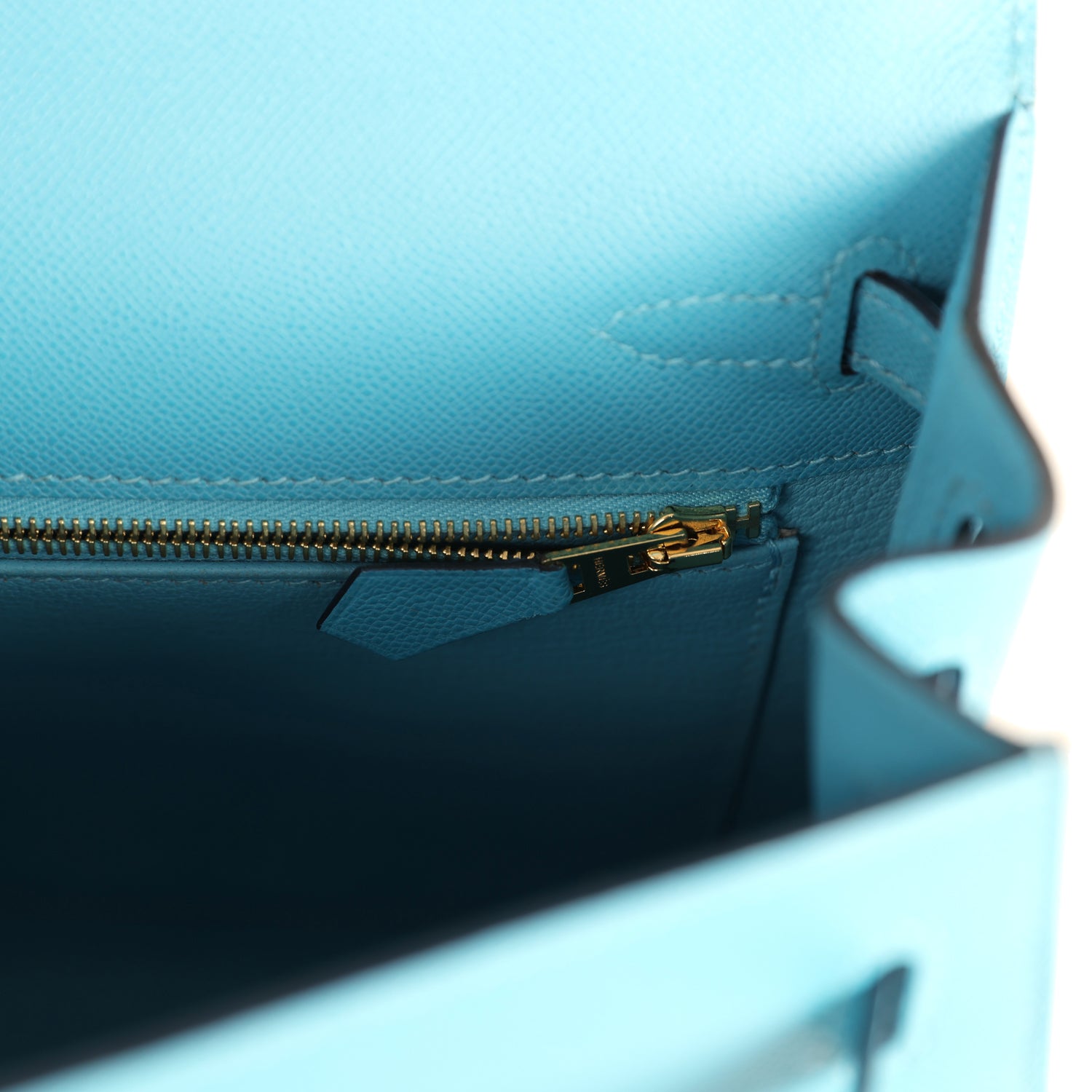 The interior is lined with Bleu Du Nord chevre leather and has one zip pocket with an Hermes engraved pull and one open pocket on the opposite side.