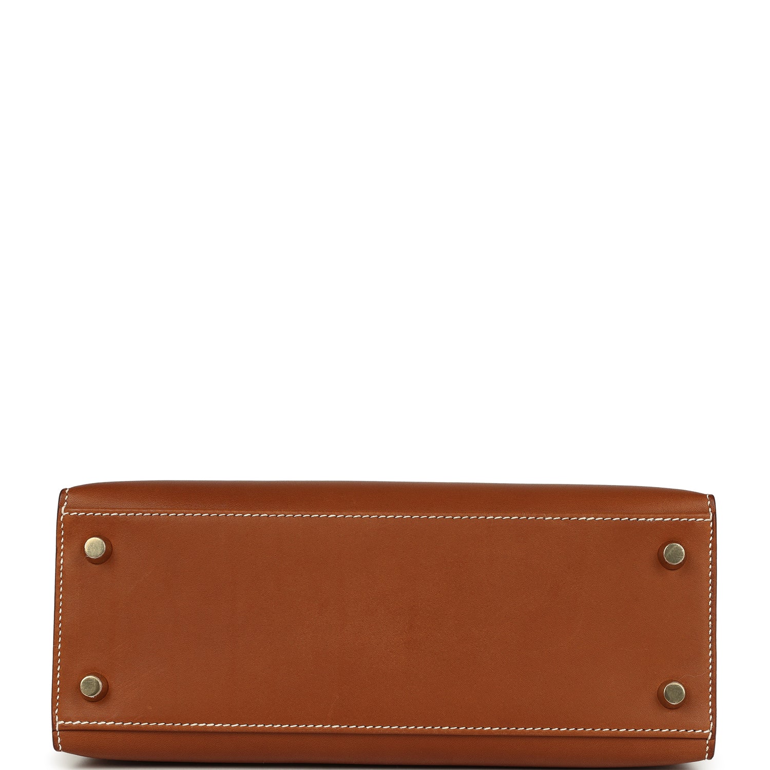 This Kelly. in the Sellier style. is in Fauve Barenia leather with gold hardware. has contrast stitching. front flap. two straps with center toggle closure. clochette with lock and two keys. single rolled handle and a removable shoulder strap.