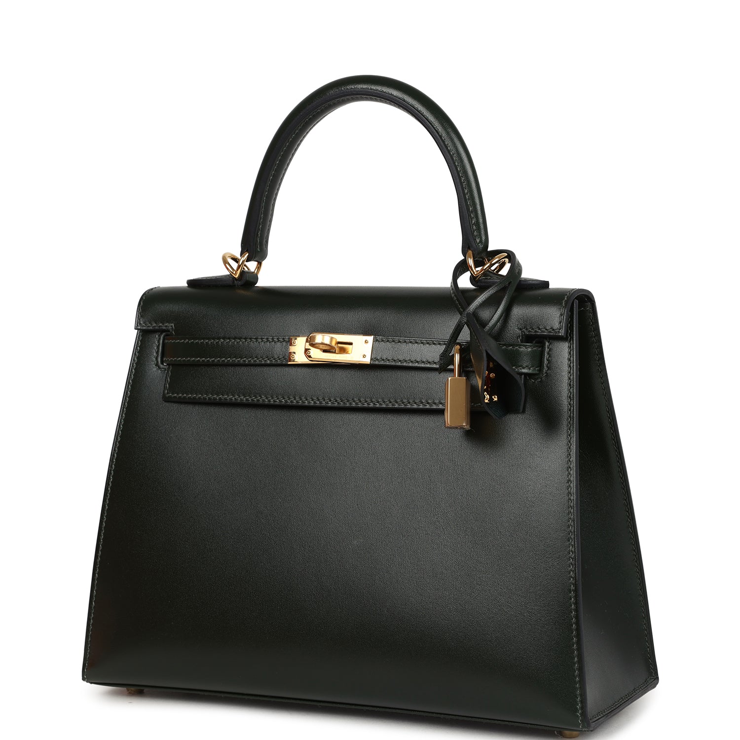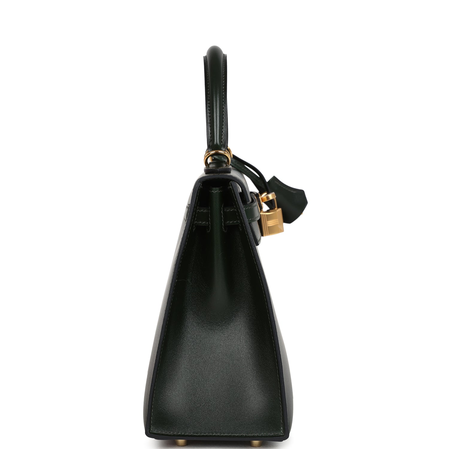 This Kelly. in the Sellier style. is in Vert Fonce box calfskin leather with gold hardware. has tonal stitching. front flap. two straps with center toggle closure. clochette with lock and two keys. single rolled handle and a removable shoulder strap.