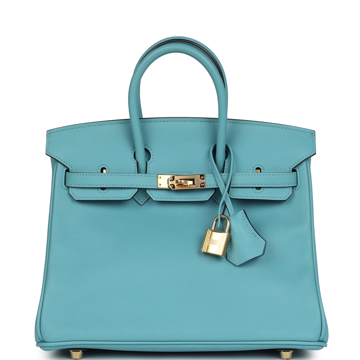 This Birkin is in Bleu Saint Cyr swift leather with palladium hardware. has tonal stitching. front flap. two straps with center toggle closure. clochette with lock and two keys. and double rolled handles.