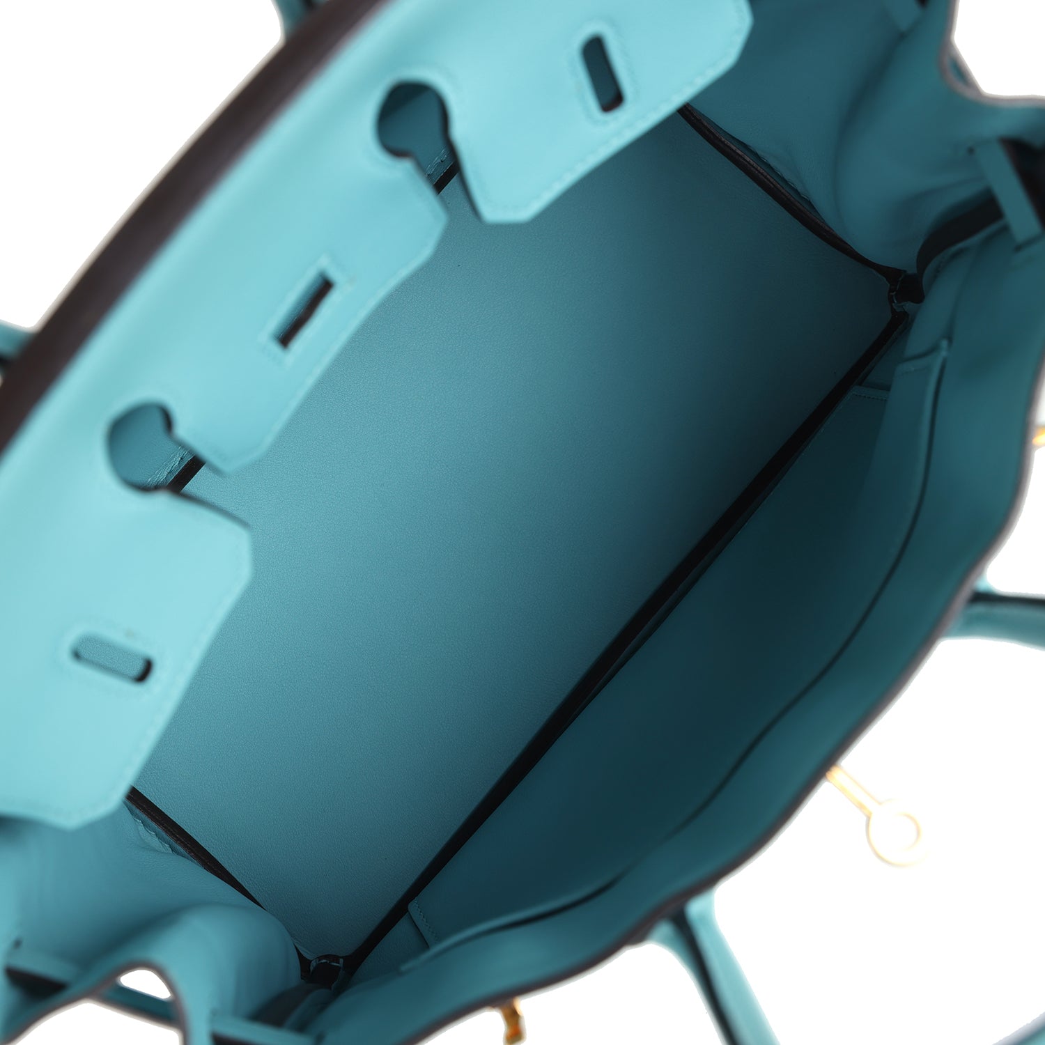 The interior is lined with Bleu Saint Cyr swift leather and has a zip pocket with an Hermes engraved zipper pull and an open pocket on the opposite side.