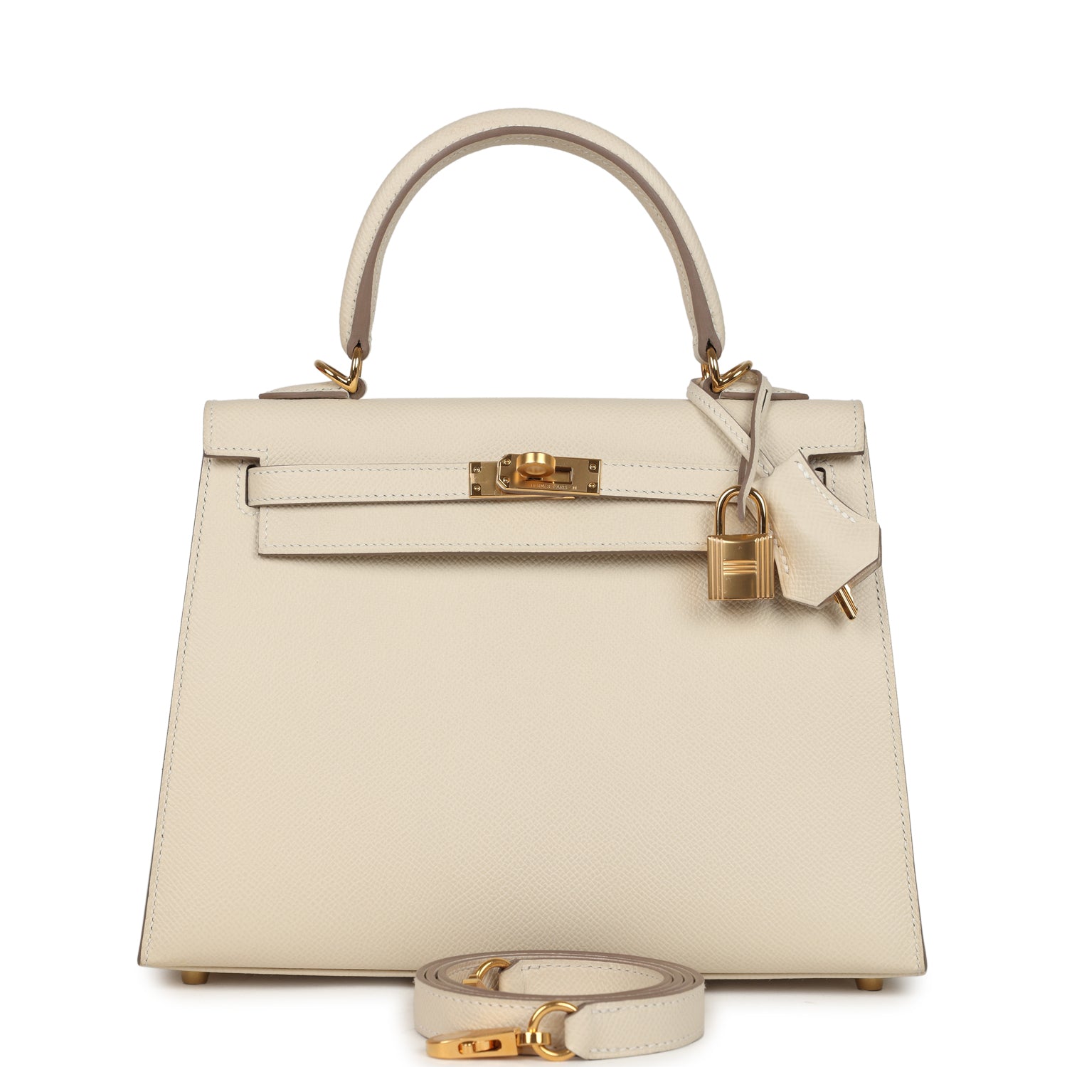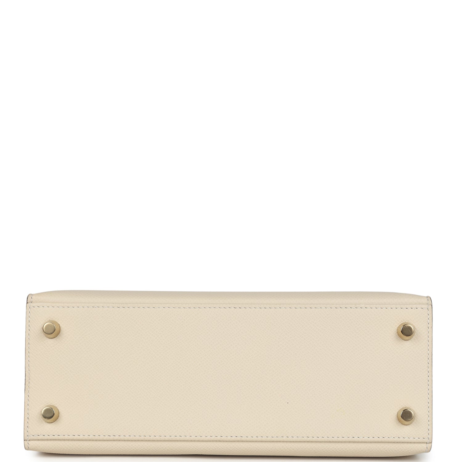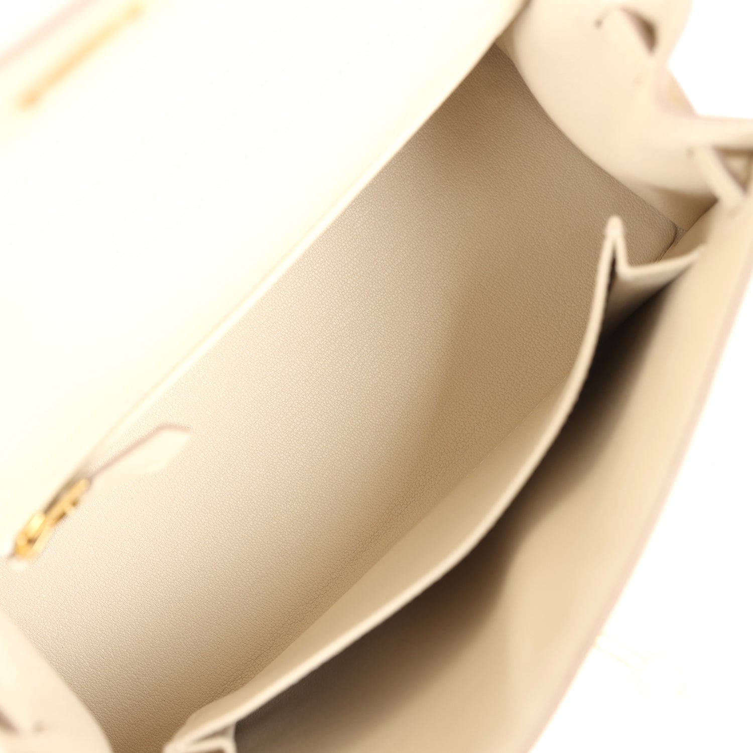 This Kelly. in the Sellier style. is in Craie epsom leather with gold hardware and has tonal stitching. front flap. two straps with center toggle closure. clochette with lock and two keys. single rolled handle and removable shoulder strap.