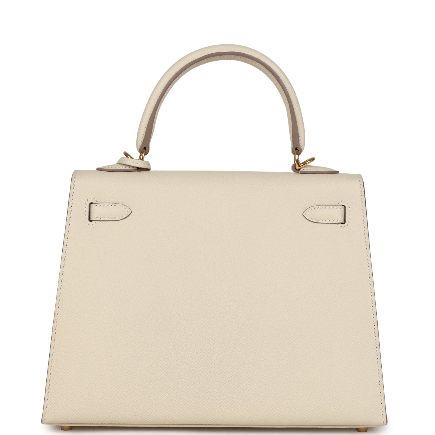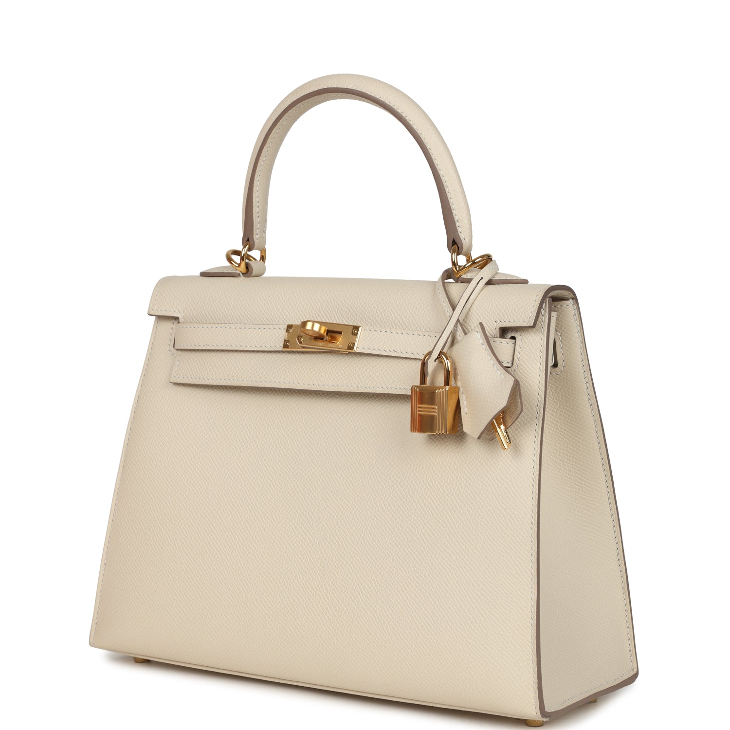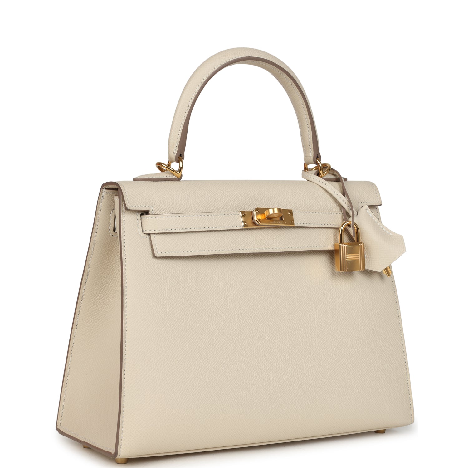 This Kelly. in the Sellier style. is in Craie epsom leather with gold hardware and has tonal stitching. front flap. two straps with center toggle closure. clochette with lock and two keys. single rolled handle and removable shoulder strap.