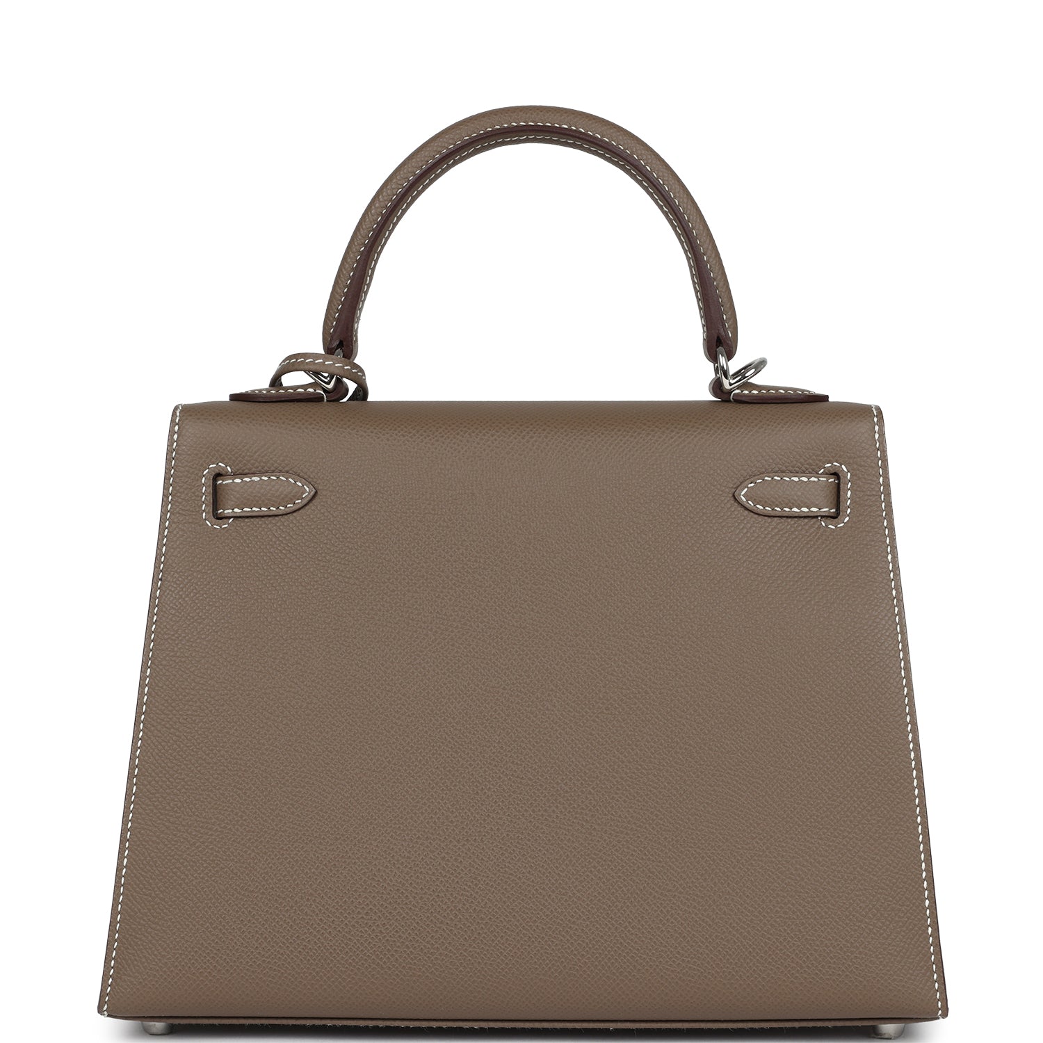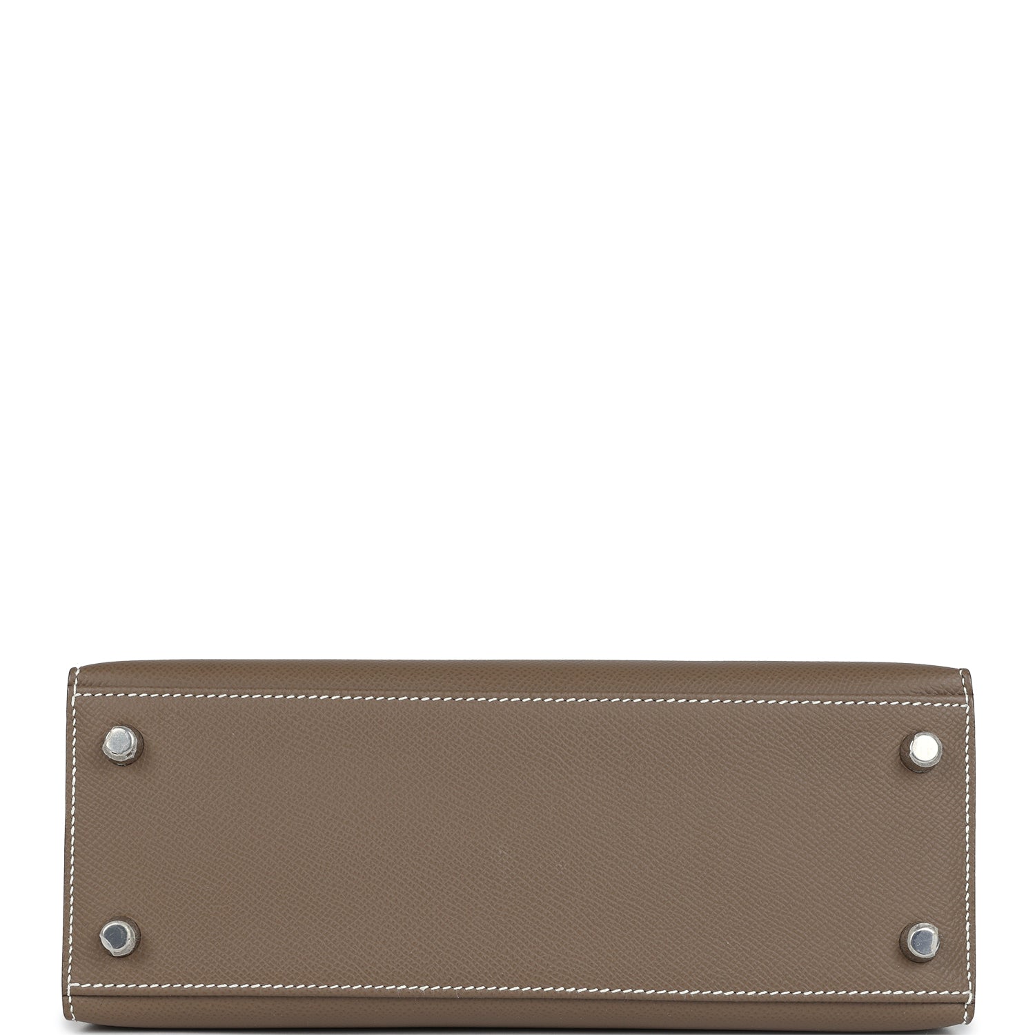 This Kelly. in the Sellier style. is in Etoupe epsom leather with palladium hardware and has contrast stitching. two straps with front toggle closure. clochette with lock and two keys. single rolled handle and removable shoulder strap.