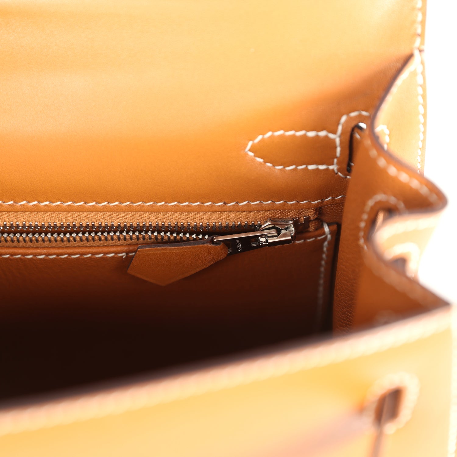 The interior is lined with Natural Sable chevre leather and has one zip pocket with an Hermes engraved pull and one open pocket on the opposite side.