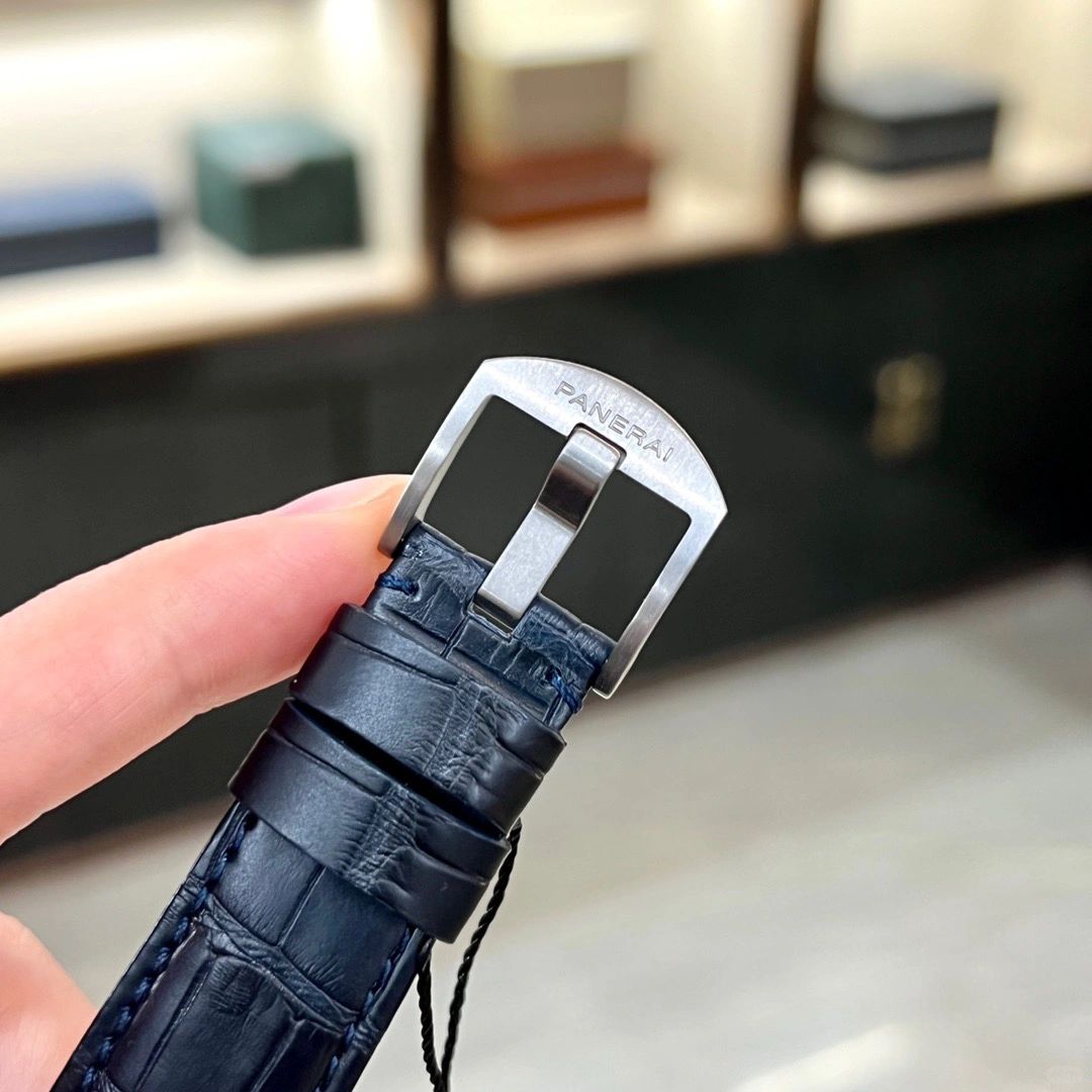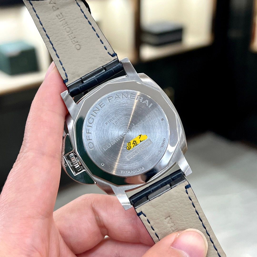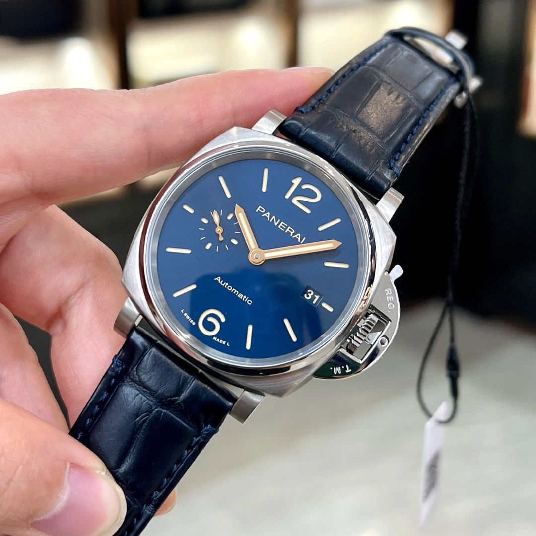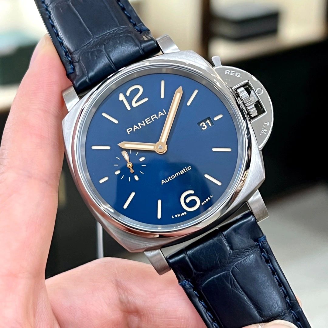 Blue sun-brushed with luminous Arabic numerals and hour markers. Date at 3 o'clock and small seconds at 9 o'clock.