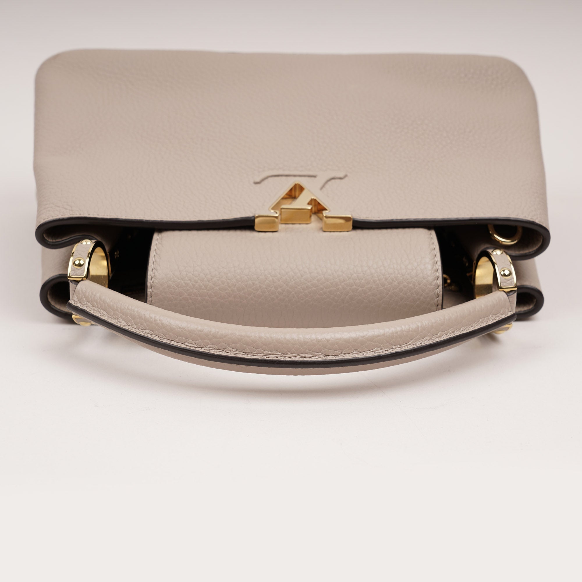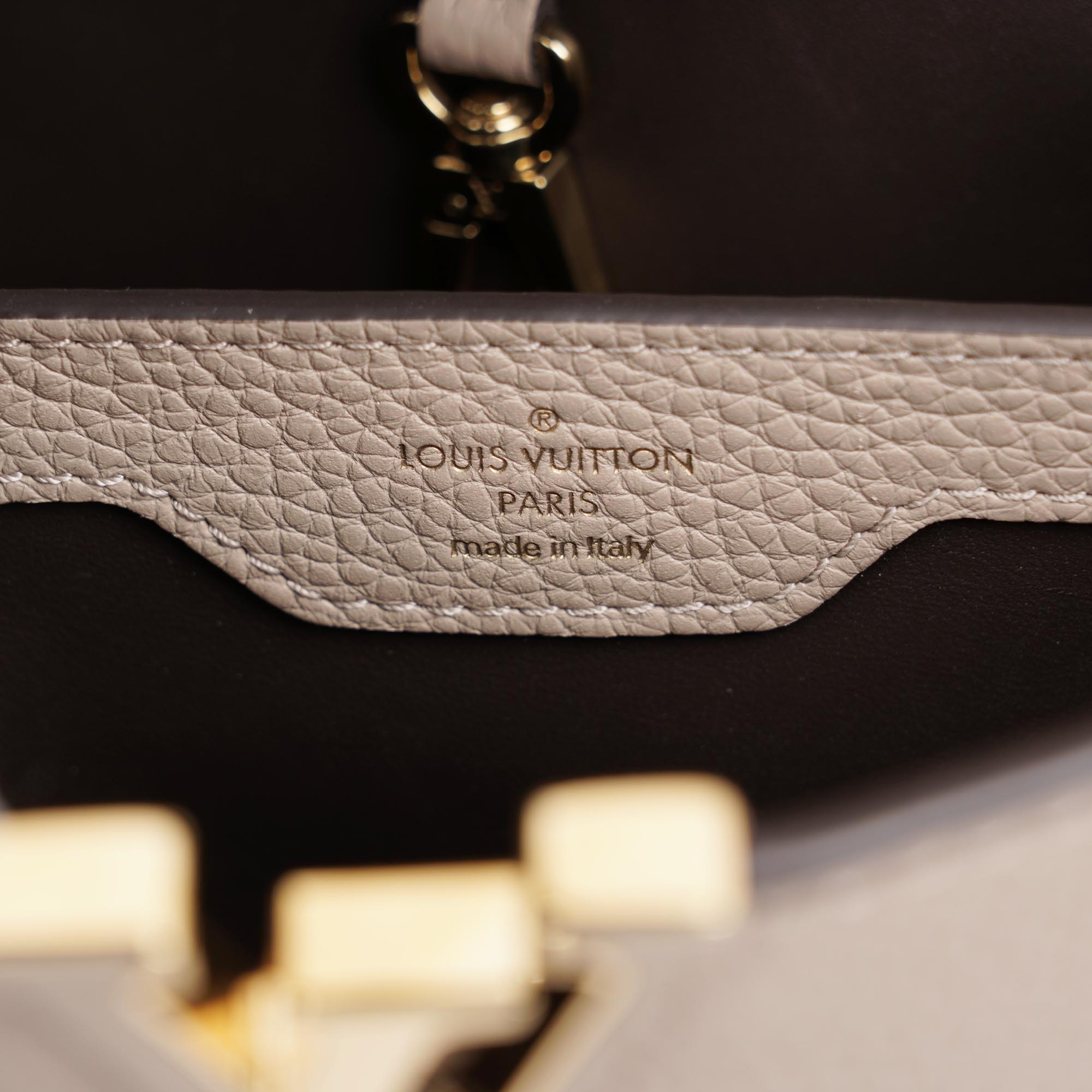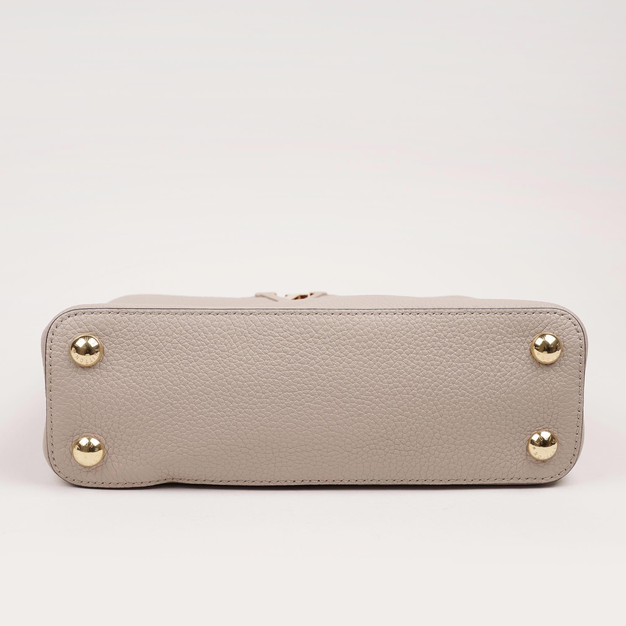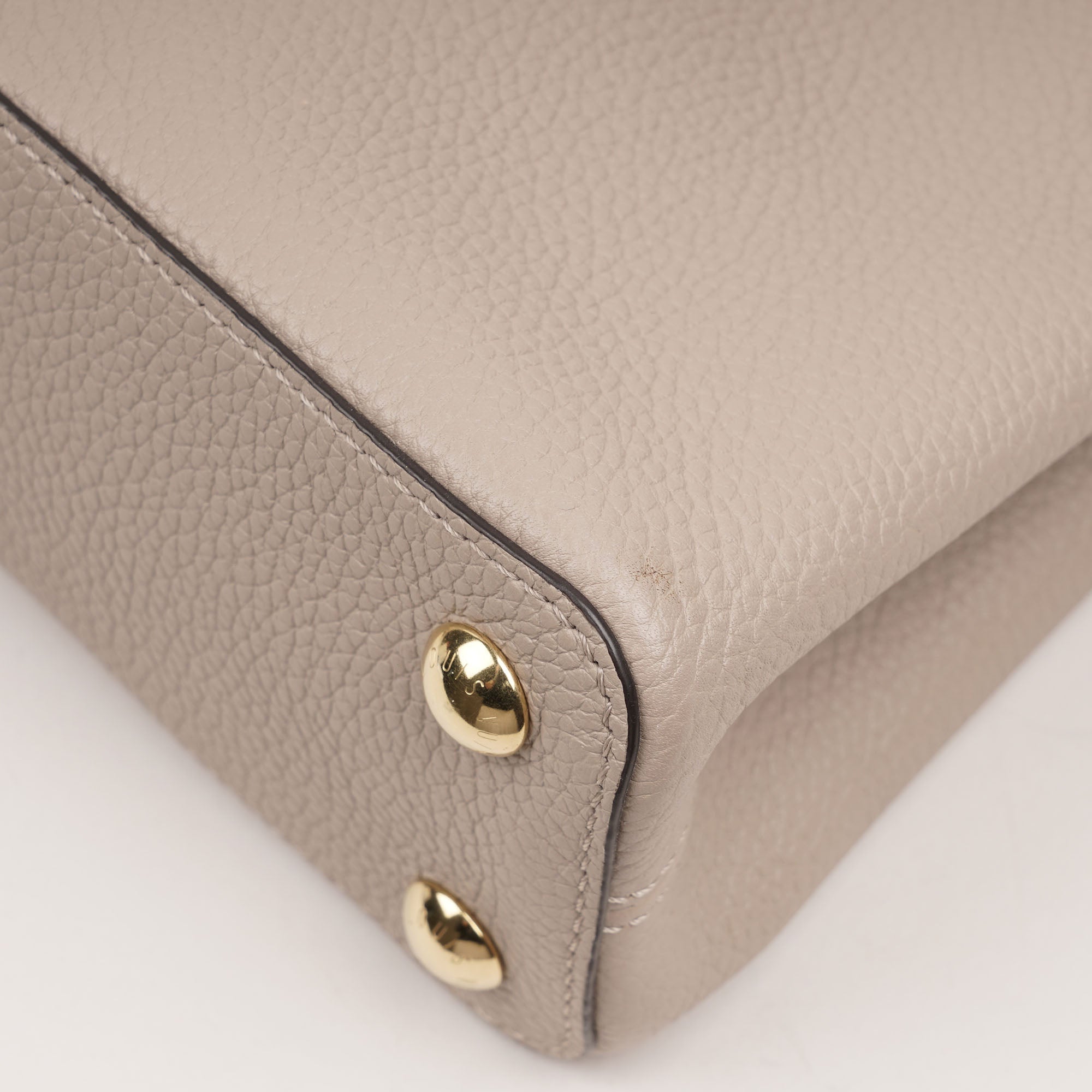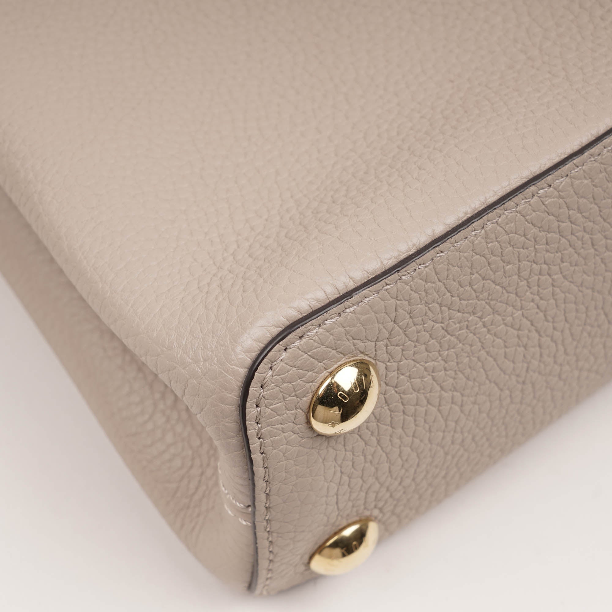 This is an authentic Louis Vuitton Capucines BB Handbag in Galet Taurillon leather.