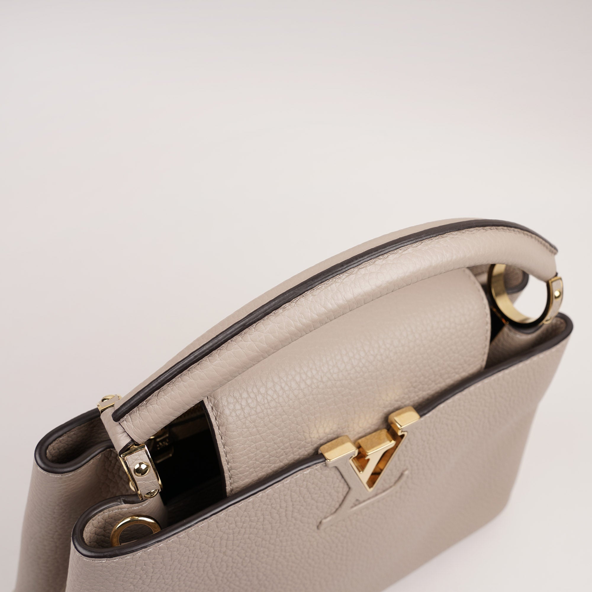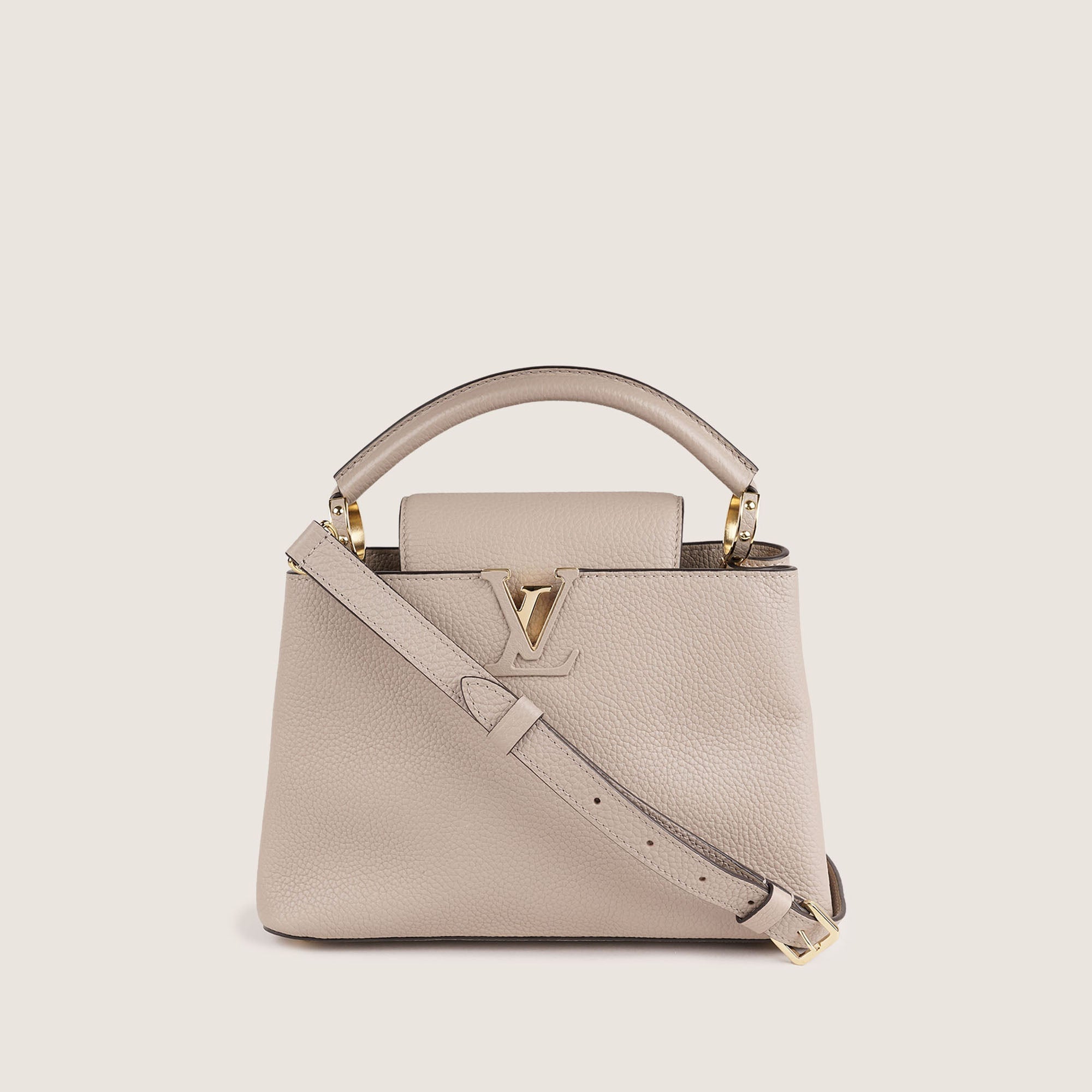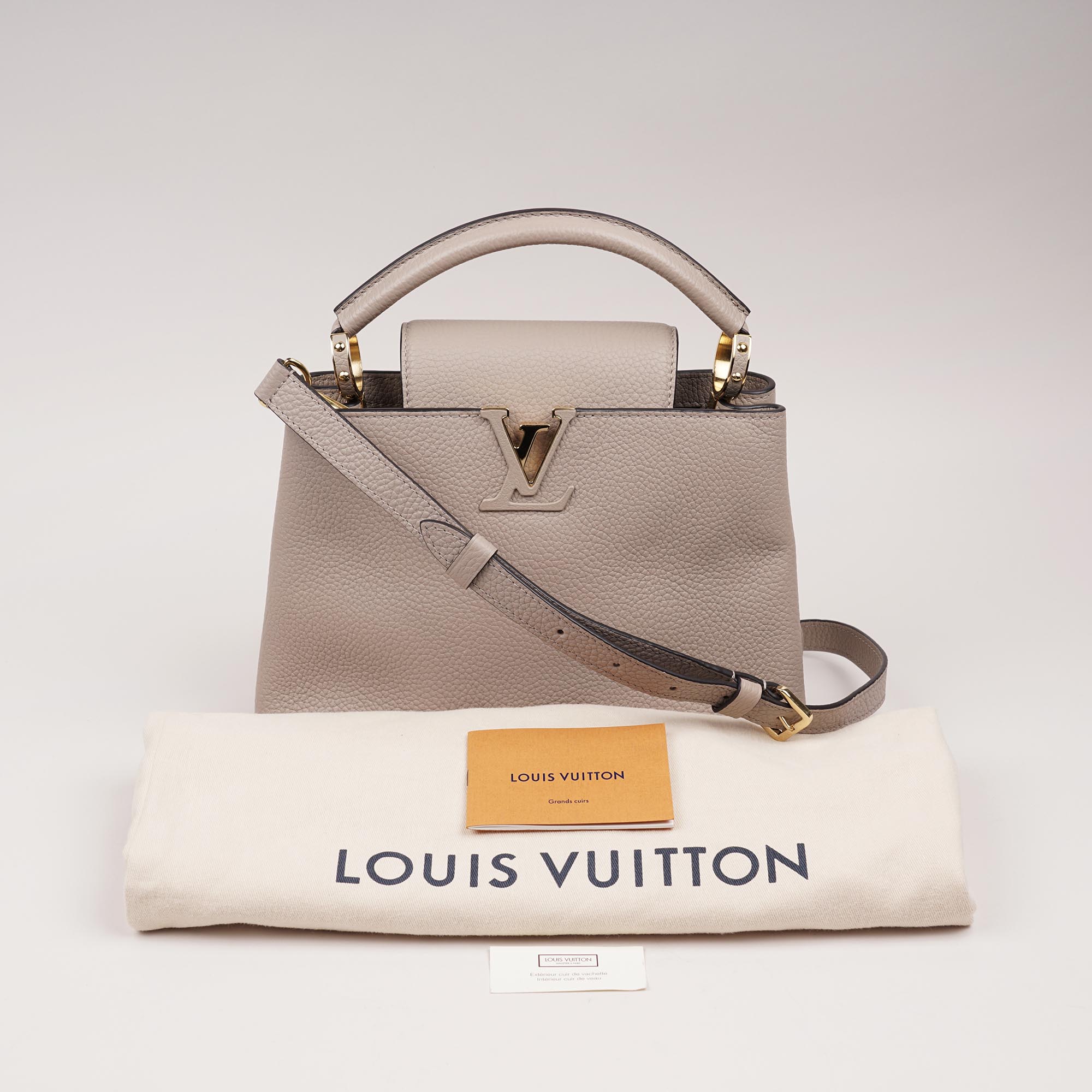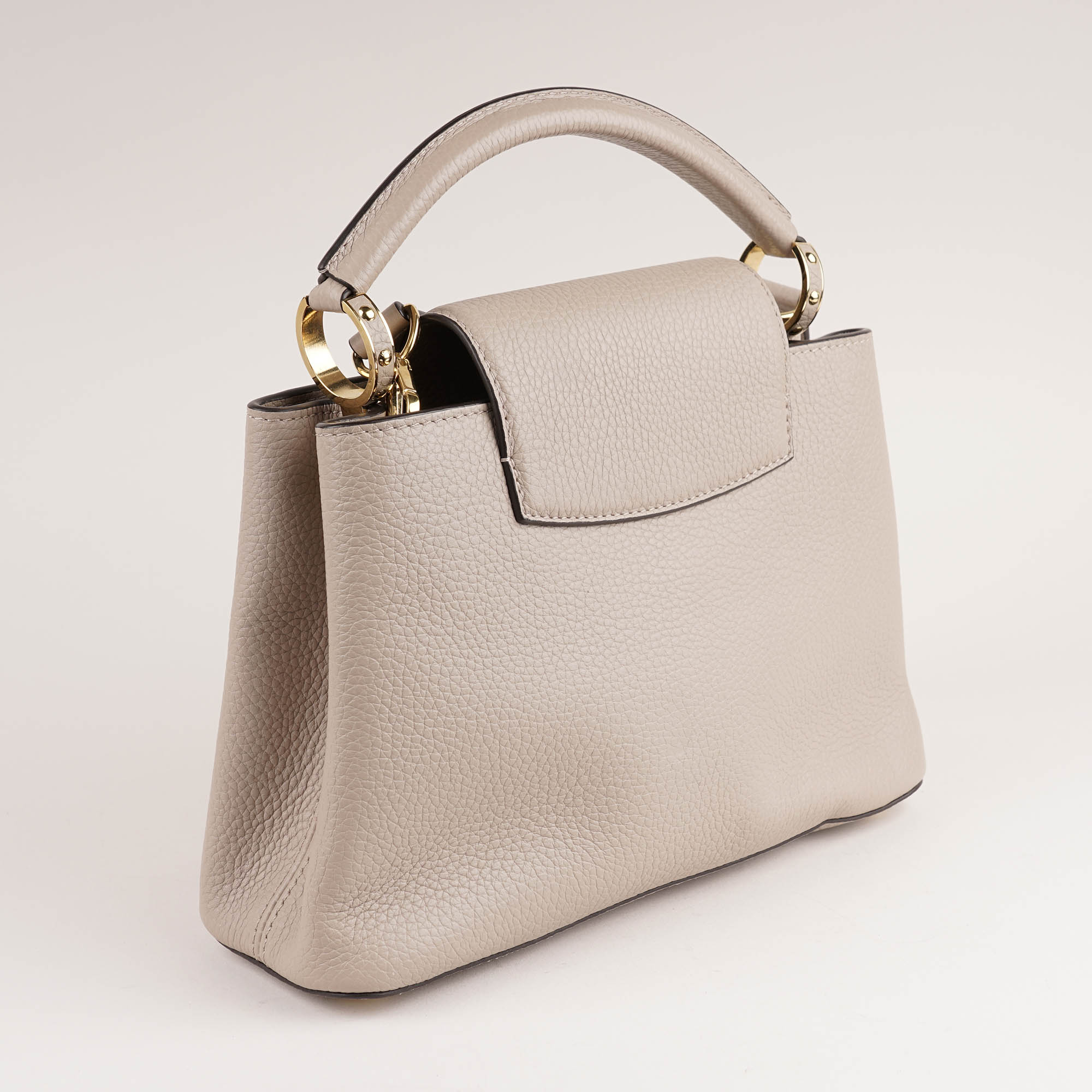 This is an authentic Louis Vuitton Capucines BB Handbag in Galet Taurillon leather.